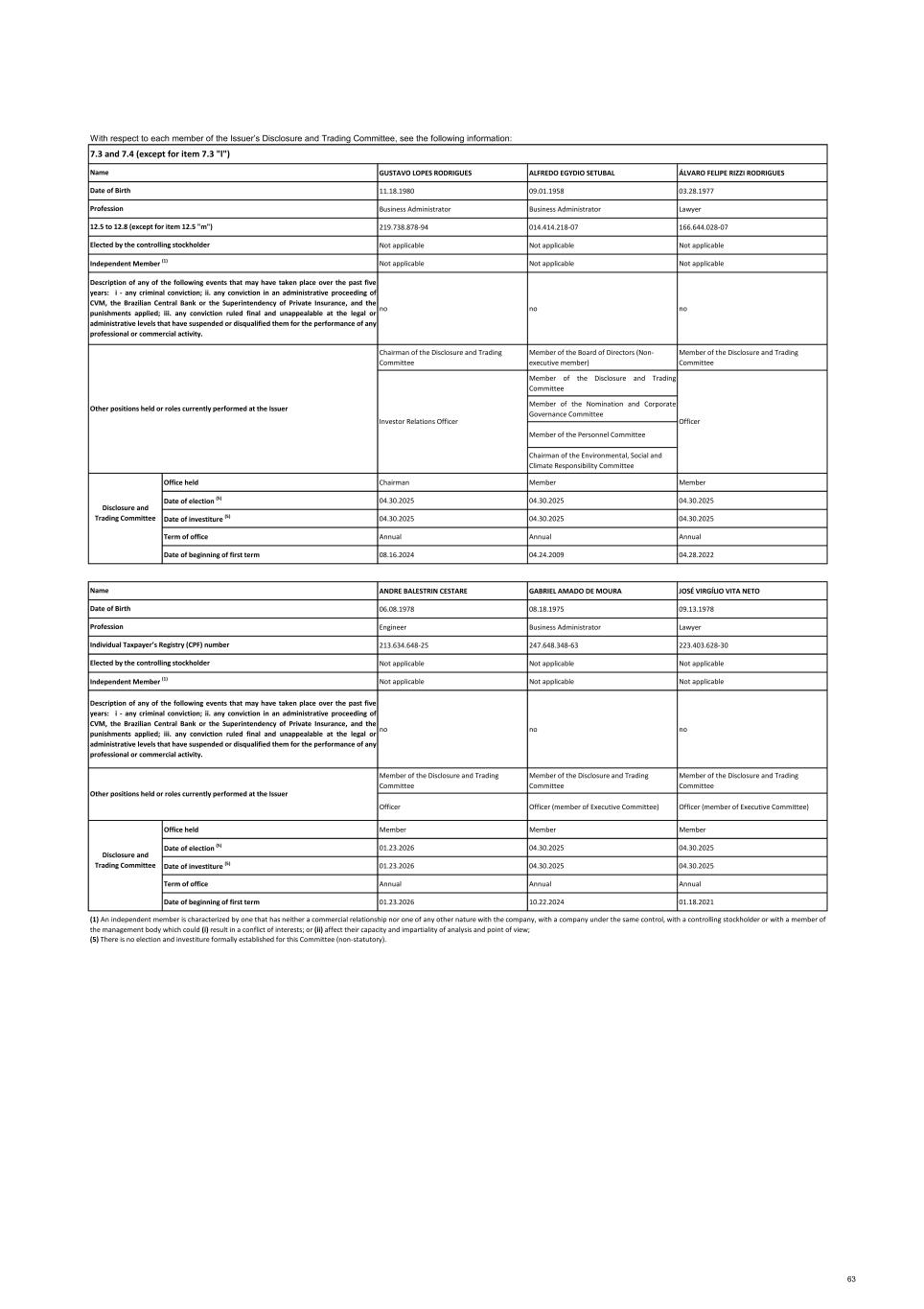 GUSTAVO LOPES RODRIGUES ALFREDO EGYDIO SETUBAL ÁLVARO FELIPE RIZZI RODRIGUES 11.18.1980 09.01.1958 03.28.1977 Business Administrator Business Administrator Lawyer 219.738.878-94 014.414.218-07 166.644.028-07 Not applicable Not applicable Not applicable Not applicable Not applicable Not applicable no no no Chairman of the Disclosure and Trading Committee Member of the Board of Directors (Non‐ executive member) Member of the Disclosure and Trading Committee Member of the Disclosure and Trading Committee Member of the Nomination and Corporate Governance Committee Member of the Personnel Committee Chairman of the Environmental, Social and Climate Responsibility Committee Office held Chairman Member Member Date of election (5) 04.30.2025 04.30.2025 04.30.2025 Date of investiture (5) 04.30.2025 04.30.2025 04.30.2025 Term of office Annual Annual Annual Date of beginning of first term 08.16.2024 04.24.2009 04.28.2022 ANDRE BALESTRIN CESTARE GABRIEL AMADO DE MOURA JOSÉ VIRGÍLIO VITA NETO 06.08.1978 08.18.1975 09.13.1978 Engineer Business Administrator Lawyer 213.634.648-25 247.648.348-63 223.403.628-30 Not applicable Not applicable Not applicable Not applicable Not applicable Not applicable no no no Member of the Disclosure and Trading Committee Member of the Disclosure and Trading Committee Member of the Disclosure and Trading Committee Officer Officer (member of Executive Committee) Officer (member of Executive Committee) Office held Member Member Member Date of election (5) 01.23.2026 04.30.2025 04.30.2025 Date of investiture (5) 01.23.2026 04.30.2025 04.30.2025 Term of office Annual Annual Annual Date of beginning of first term 01.23.2026 10.22.2024 01.18.2021 Elected by the controlling stockholder Independent Member (1) Description of any of the following events that may have taken place over the past five years: i - any criminal conviction; ii. any conviction in an administrative proceeding of CVM, the Brazilian Central Bank or the Superintendency of Private Insurance, and the punishments applied; iii. any conviction ruled final and unappealable at the legal or administrative levels that have suspended or disqualified them for the performance of any professional or commercial activity. Other positions held or roles currently performed at the Issuer OfficerInvestor Relations Officer With respect to each member of the Issuer’s Disclosure and Trading Committee, see the following information: Name Date of Birth Profession 12.5 to 12.8 (except for item 12.5 "m") 7.3 and 7.4 (except for item 7.3 "l") Description of any of the following events that may have taken place over the past five years: i - any criminal conviction; ii. any conviction in an administrative proceeding of CVM, the Brazilian Central Bank or the Superintendency of Private Insurance, and the punishments applied; iii. any conviction ruled final and unappealable at the legal or administrative levels that have suspended or disqualified them for the performance of any professional or commercial activity. Other positions held or roles currently performed at the Issuer Profession (5) There is no election and investiture formally established for this Committee (non‐statutory). (1) An independent member is characterized by one that has neither a commercial relationship nor one of any other nature with the company, with a company under the same control, with a controlling stockholder or with a member of the management body which could (i) result in a conflict of interests; or (ii) affect their capacity and impartiality of analysis and point of view; Disclosure and Trading Committee Individual Taxpayer’s Registry (CPF) number Name Date of Birth Elected by the controlling stockholder Independent Member (1) Disclosure and Trading Committee 63