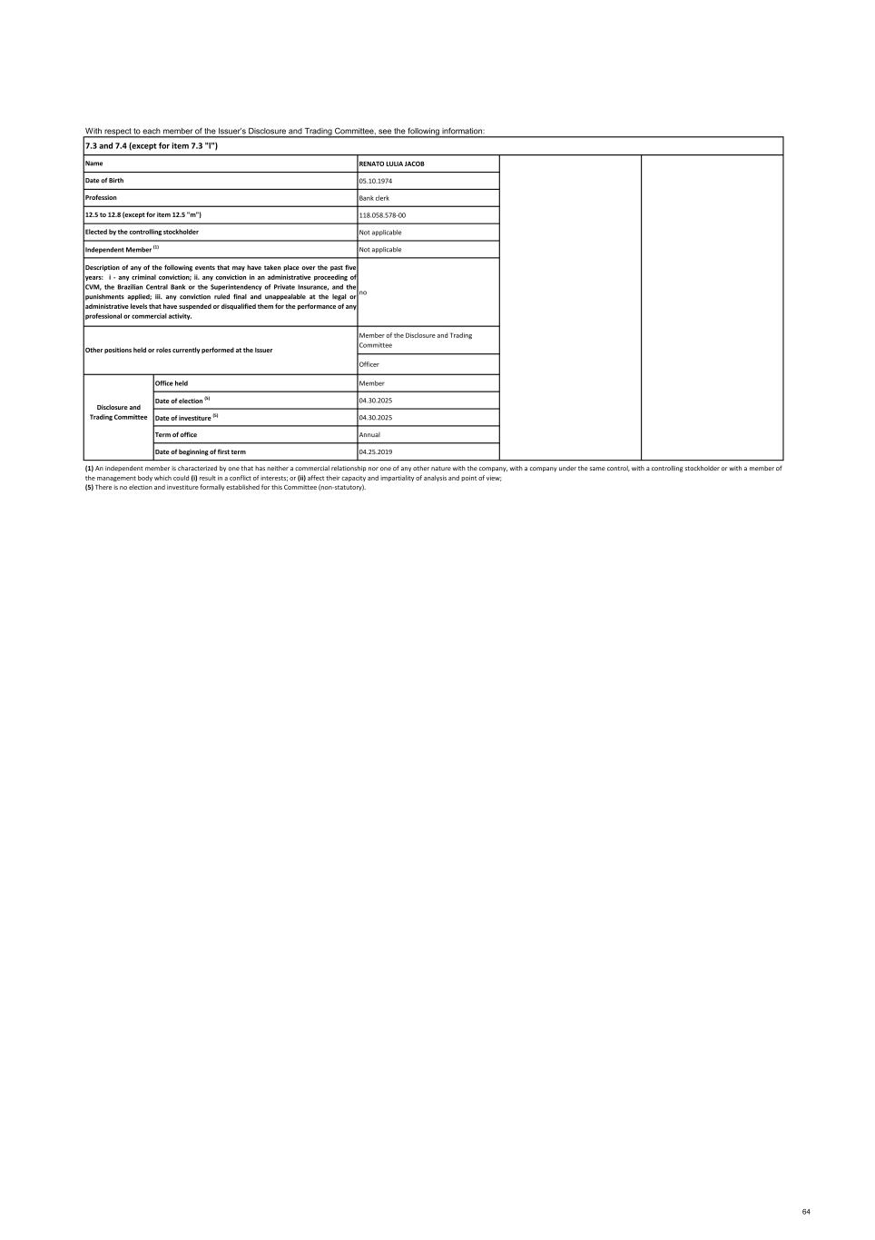 RENATO LULIA JACOB 05.10.1974 Bank clerk 118.058.578-00 Not applicable Not applicable no Member of the Disclosure and Trading Committee Officer Office held Member Date of election (5) 04.30.2025 Date of investiture (5) 04.30.2025 Term of office Annual Date of beginning of first term 04.25.2019 (5) There is no election and investiture formally established for this Committee (non‐statutory). (1) An independent member is characterized by one that has neither a commercial relationship nor one of any other nature with the company, with a company under the same control, with a controlling stockholder or with a member of the management body which could (i) result in a conflict of interests; or (ii) affect their capacity and impartiality of analysis and point of view; Disclosure and Trading Committee Elected by the controlling stockholder Independent Member (1) Description of any of the following events that may have taken place over the past five years: i - any criminal conviction; ii. any conviction in an administrative proceeding of CVM, the Brazilian Central Bank or the Superintendency of Private Insurance, and the punishments applied; iii. any conviction ruled final and unappealable at the legal or administrative levels that have suspended or disqualified them for the performance of any professional or commercial activity. Other positions held or roles currently performed at the Issuer 12.5 to 12.8 (except for item 12.5 "m") With respect to each member of the Issuer’s Disclosure and Trading Committee, see the following information: 7.3 and 7.4 (except for item 7.3 "l") Name Date of Birth Profession 64
