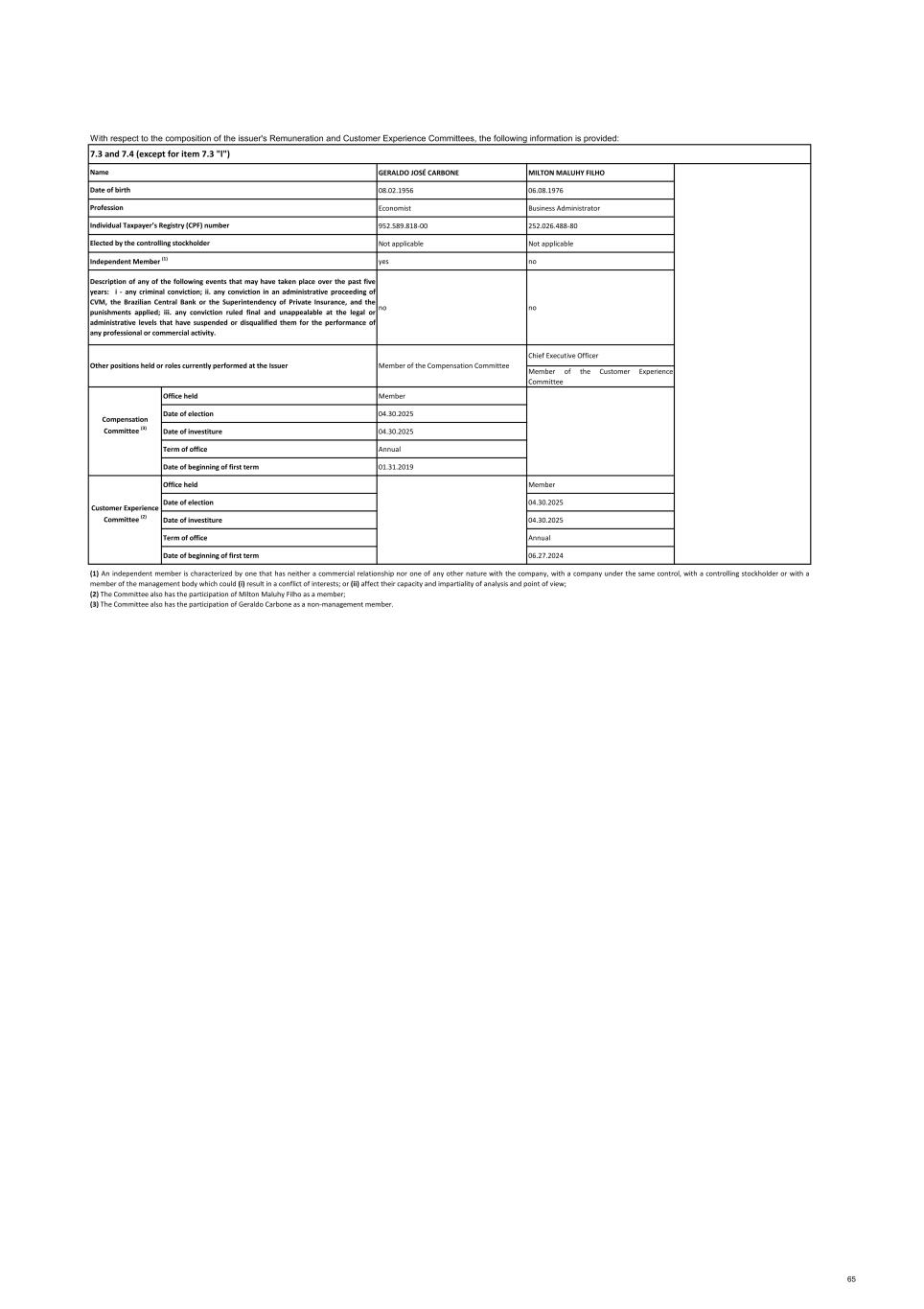 GERALDO JOSÉ CARBONE MILTON MALUHY FILHO 08.02.1956 06.08.1976 Economist Business Administrator 952.589.818-00 252.026.488-80 Not applicable Not applicable yes no no no Chief Executive Officer Member of the Customer Experience Committee Office held Member Date of election 04.30.2025 Date of investiture 04.30.2025 Term of office Annual Date of beginning of first term 01.31.2019 Office held Member Date of election 04.30.2025 Date of investiture 04.30.2025 Term of office Annual Date of beginning of first term 06.27.2024 (2) The Committee also has the participation of Milton Maluhy Filho as a member; (3) The Committee also has the participation of Geraldo Carbone as a non‐management member. Customer Experience Committee (2) (1) An independent member is characterized by one that has neither a commercial relationship nor one of any other nature with the company, with a company under the same control, with a controlling stockholder or with a member of the management body which could (i) result in a conflict of interests; or (ii) affect their capacity and impartiality of analysis and point of view; Name Member of the Compensation CommitteeOther positions held or roles currently performed at the Issuer With respect to the composition of the issuer's Remuneration and Customer Experience Committees, the following information is provided: Independent Member (1) Description of any of the following events that may have taken place over the past five years: i - any criminal conviction; ii. any conviction in an administrative proceeding of CVM, the Brazilian Central Bank or the Superintendency of Private Insurance, and the punishments applied; iii. any conviction ruled final and unappealable at the legal or administrative levels that have suspended or disqualified them for the performance of any professional or commercial activity. Compensation Committee (3) Date of birth Profession Elected by the controlling stockholder Individual Taxpayer’s Registry (CPF) number 7.3 and 7.4 (except for item 7.3 "l") 65
