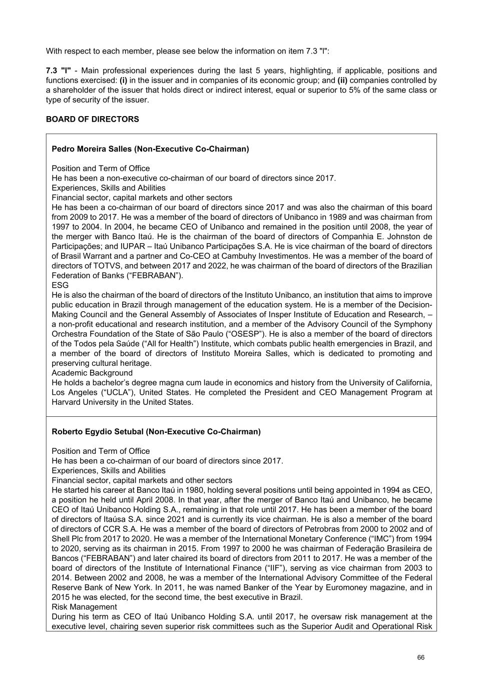 With respect to each member, please see below the information on item 7.3 "l": 7.3 "l" - Main professional experiences during the last 5 years, highlighting, if applicable, positions and functions exercised: (i) in the issuer and in companies of its economic group; and (ii) companies controlled by a shareholder of the issuer that holds direct or indirect interest, equal or superior to 5% of the same class or type of security of the issuer. BOARD OF DIRECTORS Pedro Moreira Salles (Non-Executive Co-Chairman) Position and Term of Office He has been a non-executive co-chairman of our board of directors since 2017. Experiences, Skills and Abilities Financial sector, capital markets and other sectors He has been a co-chairman of our board of directors since 2017 and was also the chairman of this board from 2009 to 2017. He was a member of the board of directors of Unibanco in 1989 and was chairman from 1997 to 2004. In 2004, he became CEO of Unibanco and remained in the position until 2008, the year of the merger with Banco Itaú. He is the chairman of the board of directors of Companhia E. Johnston de Participações; and IUPAR – Itaú Unibanco Participações S.A. He is vice chairman of the board of directors of Brasil Warrant and a partner and Co-CEO at Cambuhy Investimentos. He was a member of the board of directors of TOTVS, and between 2017 and 2022, he was chairman of the board of directors of the Brazilian Federation of Banks (“FEBRABAN”). ESG He is also the chairman of the board of directors of the Instituto Unibanco, an institution that aims to improve public education in Brazil through management of the education system. He is a member of the Decision- Making Council and the General Assembly of Associates of Insper Institute of Education and Research, – a non-profit educational and research institution, and a member of the Advisory Council of the Symphony Orchestra Foundation of the State of São Paulo (“OSESP”). He is also a member of the board of directors of the Todos pela Saúde (“All for Health”) Institute, which combats public health emergencies in Brazil, and a member of the board of directors of Instituto Moreira Salles, which is dedicated to promoting and preserving cultural heritage. Academic Background He holds a bachelor’s degree magna cum laude in economics and history from the University of California, Los Angeles (“UCLA”), United States. He completed the President and CEO Management Program at Harvard University in the United States. Roberto Egydio Setubal (Non-Executive Co-Chairman) Position and Term of Office He has been a co-chairman of our board of directors since 2017. Experiences, Skills and Abilities Financial sector, capital markets and other sectors He started his career at Banco Itaú in 1980, holding several positions until being appointed in 1994 as CEO, a position he held until April 2008. In that year, after the merger of Banco Itaú and Unibanco, he became CEO of Itaú Unibanco Holding S.A., remaining in that role until 2017. He has been a member of the board of directors of Itaúsa S.A. since 2021 and is currently its vice chairman. He is also a member of the board of directors of CCR S.A. He was a member of the board of directors of Petrobras from 2000 to 2002 and of Shell Plc from 2017 to 2020. He was a member of the International Monetary Conference (“IMC”) from 1994 to 2020, serving as its chairman in 2015. From 1997 to 2000 he was chairman of Federação Brasileira de Bancos (“FEBRABAN”) and later chaired its board of directors from 2011 to 2017. He was a member of the board of directors of the Institute of International Finance (“IIF”), serving as vice chairman from 2003 to 2014. Between 2002 and 2008, he was a member of the International Advisory Committee of the Federal Reserve Bank of New York. In 2011, he was named Banker of the Year by Euromoney magazine, and in 2015 he was elected, for the second time, the best executive in Brazil. Risk Management During his term as CEO of Itaú Unibanco Holding S.A. until 2017, he oversaw risk management at the executive level, chairing seven superior risk committees such as the Superior Audit and Operational Risk 66