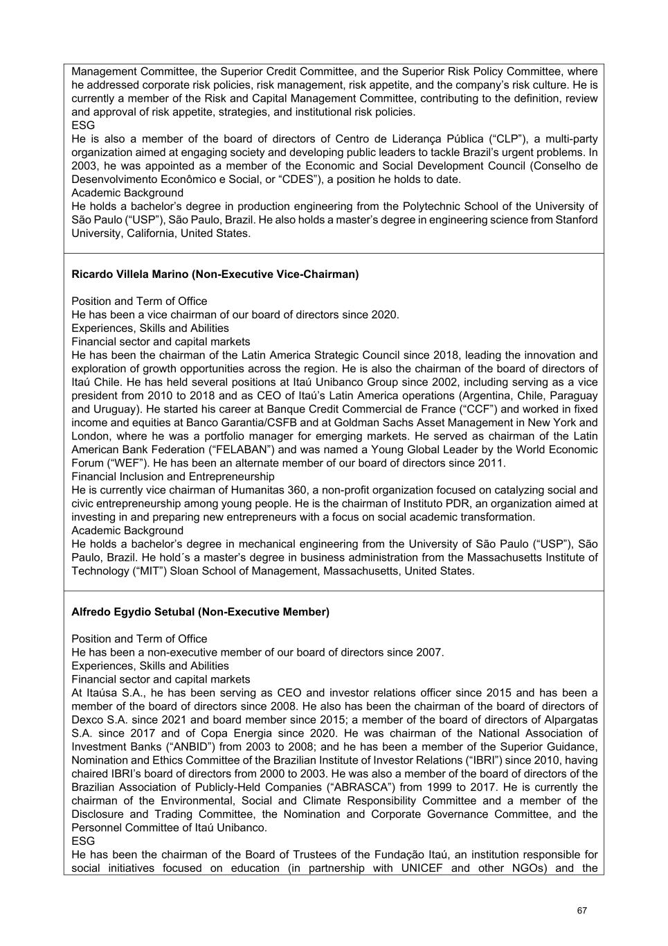 Management Committee, the Superior Credit Committee, and the Superior Risk Policy Committee, where he addressed corporate risk policies, risk management, risk appetite, and the company’s risk culture. He is currently a member of the Risk and Capital Management Committee, contributing to the definition, review and approval of risk appetite, strategies, and institutional risk policies. ESG He is also a member of the board of directors of Centro de Liderança Pública (“CLP”), a multi-party organization aimed at engaging society and developing public leaders to tackle Brazil’s urgent problems. In 2003, he was appointed as a member of the Economic and Social Development Council (Conselho de Desenvolvimento Econômico e Social, or “CDES”), a position he holds to date. Academic Background He holds a bachelor’s degree in production engineering from the Polytechnic School of the University of São Paulo (“USP”), São Paulo, Brazil. He also holds a master’s degree in engineering science from Stanford University, California, United States. Ricardo Villela Marino (Non-Executive Vice-Chairman) Position and Term of Office He has been a vice chairman of our board of directors since 2020. Experiences, Skills and Abilities Financial sector and capital markets He has been the chairman of the Latin America Strategic Council since 2018, leading the innovation and exploration of growth opportunities across the region. He is also the chairman of the board of directors of Itaú Chile. He has held several positions at Itaú Unibanco Group since 2002, including serving as a vice president from 2010 to 2018 and as CEO of Itaú’s Latin America operations (Argentina, Chile, Paraguay and Uruguay). He started his career at Banque Credit Commercial de France (“CCF”) and worked in fixed income and equities at Banco Garantia/CSFB and at Goldman Sachs Asset Management in New York and London, where he was a portfolio manager for emerging markets. He served as chairman of the Latin American Bank Federation (“FELABAN”) and was named a Young Global Leader by the World Economic Forum (“WEF”). He has been an alternate member of our board of directors since 2011. Financial Inclusion and Entrepreneurship He is currently vice chairman of Humanitas 360, a non-profit organization focused on catalyzing social and civic entrepreneurship among young people. He is the chairman of Instituto PDR, an organization aimed at investing in and preparing new entrepreneurs with a focus on social academic transformation. Academic Background He holds a bachelor’s degree in mechanical engineering from the University of São Paulo (“USP”), São Paulo, Brazil. He hold´s a master’s degree in business administration from the Massachusetts Institute of Technology (“MIT”) Sloan School of Management, Massachusetts, United States. Alfredo Egydio Setubal (Non-Executive Member) Position and Term of Office He has been a non-executive member of our board of directors since 2007. Experiences, Skills and Abilities Financial sector and capital markets At Itaúsa S.A., he has been serving as CEO and investor relations officer since 2015 and has been a member of the board of directors since 2008. He also has been the chairman of the board of directors of Dexco S.A. since 2021 and board member since 2015; a member of the board of directors of Alpargatas S.A. since 2017 and of Copa Energia since 2020. He was chairman of the National Association of Investment Banks (“ANBID”) from 2003 to 2008; and he has been a member of the Superior Guidance, Nomination and Ethics Committee of the Brazilian Institute of Investor Relations (“IBRI”) since 2010, having chaired IBRI’s board of directors from 2000 to 2003. He was also a member of the board of directors of the Brazilian Association of Publicly-Held Companies (“ABRASCA”) from 1999 to 2017. He is currently the chairman of the Environmental, Social and Climate Responsibility Committee and a member of the Disclosure and Trading Committee, the Nomination and Corporate Governance Committee, and the Personnel Committee of Itaú Unibanco. ESG He has been the chairman of the Board of Trustees of the Fundação Itaú, an institution responsible for social initiatives focused on education (in partnership with UNICEF and other NGOs) and the 67