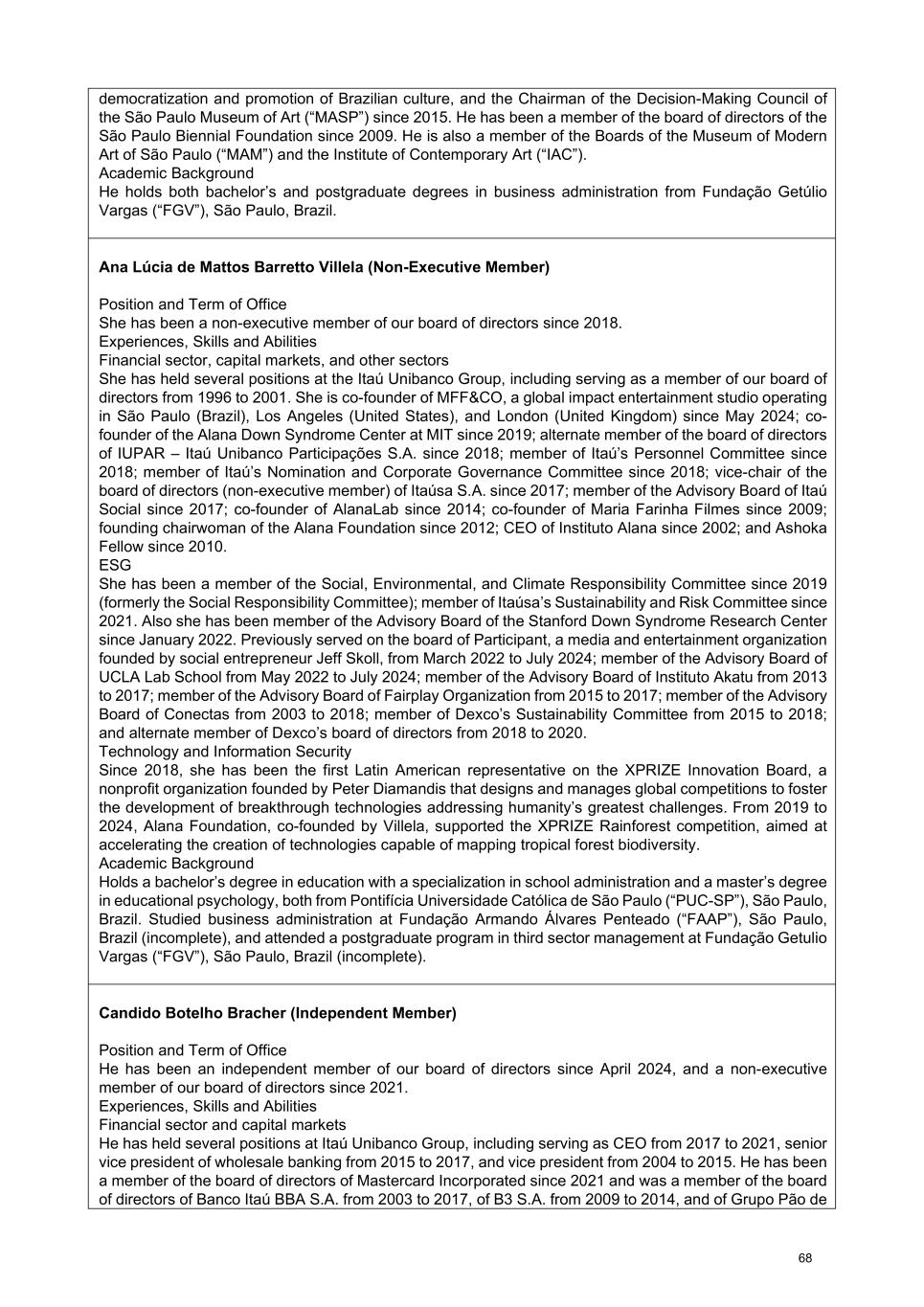 democratization and promotion of Brazilian culture, and the Chairman of the Decision-Making Council of the São Paulo Museum of Art (“MASP”) since 2015. He has been a member of the board of directors of the São Paulo Biennial Foundation since 2009. He is also a member of the Boards of the Museum of Modern Art of São Paulo (“MAM”) and the Institute of Contemporary Art (“IAC”). Academic Background He holds both bachelor’s and postgraduate degrees in business administration from Fundação Getúlio Vargas (“FGV”), São Paulo, Brazil. Ana Lúcia de Mattos Barretto Villela (Non-Executive Member) Position and Term of Office She has been a non-executive member of our board of directors since 2018. Experiences, Skills and Abilities Financial sector, capital markets, and other sectors She has held several positions at the Itaú Unibanco Group, including serving as a member of our board of directors from 1996 to 2001. She is co-founder of MFF&CO, a global impact entertainment studio operating in São Paulo (Brazil), Los Angeles (United States), and London (United Kingdom) since May 2024; co- founder of the Alana Down Syndrome Center at MIT since 2019; alternate member of the board of directors of IUPAR – Itaú Unibanco Participações S.A. since 2018; member of Itaú’s Personnel Committee since 2018; member of Itaú’s Nomination and Corporate Governance Committee since 2018; vice-chair of the board of directors (non-executive member) of Itaúsa S.A. since 2017; member of the Advisory Board of Itaú Social since 2017; co-founder of AlanaLab since 2014; co-founder of Maria Farinha Filmes since 2009; founding chairwoman of the Alana Foundation since 2012; CEO of Instituto Alana since 2002; and Ashoka Fellow since 2010. ESG She has been a member of the Social, Environmental, and Climate Responsibility Committee since 2019 (formerly the Social Responsibility Committee); member of Itaúsa’s Sustainability and Risk Committee since 2021. Also she has been member of the Advisory Board of the Stanford Down Syndrome Research Center since January 2022. Previously served on the board of Participant, a media and entertainment organization founded by social entrepreneur Jeff Skoll, from March 2022 to July 2024; member of the Advisory Board of UCLA Lab School from May 2022 to July 2024; member of the Advisory Board of Instituto Akatu from 2013 to 2017; member of the Advisory Board of Fairplay Organization from 2015 to 2017; member of the Advisory Board of Conectas from 2003 to 2018; member of Dexco’s Sustainability Committee from 2015 to 2018; and alternate member of Dexco’s board of directors from 2018 to 2020. Technology and Information Security Since 2018, she has been the first Latin American representative on the XPRIZE Innovation Board, a nonprofit organization founded by Peter Diamandis that designs and manages global competitions to foster the development of breakthrough technologies addressing humanity’s greatest challenges. From 2019 to 2024, Alana Foundation, co-founded by Villela, supported the XPRIZE Rainforest competition, aimed at accelerating the creation of technologies capable of mapping tropical forest biodiversity. Academic Background Holds a bachelor’s degree in education with a specialization in school administration and a master’s degree in educational psychology, both from Pontifícia Universidade Católica de São Paulo (“PUC-SP”), São Paulo, Brazil. Studied business administration at Fundação Armando Álvares Penteado (“FAAP”), São Paulo, Brazil (incomplete), and attended a postgraduate program in third sector management at Fundação Getulio Vargas (“FGV”), São Paulo, Brazil (incomplete). Candido Botelho Bracher (Independent Member) Position and Term of Office He has been an independent member of our board of directors since April 2024, and a non-executive member of our board of directors since 2021. Experiences, Skills and Abilities Financial sector and capital markets He has held several positions at Itaú Unibanco Group, including serving as CEO from 2017 to 2021, senior vice president of wholesale banking from 2015 to 2017, and vice president from 2004 to 2015. He has been a member of the board of directors of Mastercard Incorporated since 2021 and was a member of the board of directors of Banco Itaú BBA S.A. from 2003 to 2017, of B3 S.A. from 2009 to 2014, and of Grupo Pão de 68