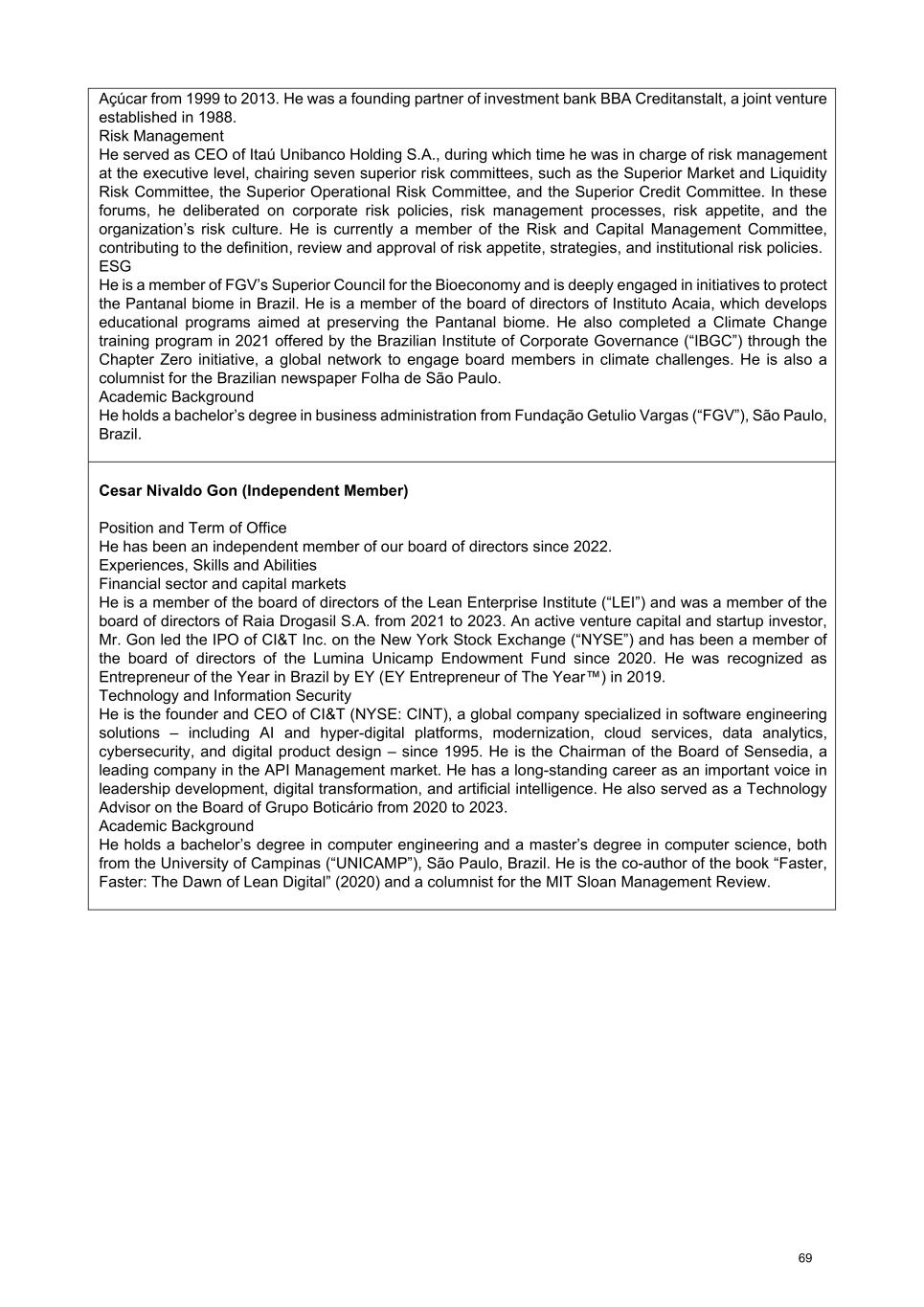 Açúcar from 1999 to 2013. He was a founding partner of investment bank BBA Creditanstalt, a joint venture established in 1988. Risk Management He served as CEO of Itaú Unibanco Holding S.A., during which time he was in charge of risk management at the executive level, chairing seven superior risk committees, such as the Superior Market and Liquidity Risk Committee, the Superior Operational Risk Committee, and the Superior Credit Committee. In these forums, he deliberated on corporate risk policies, risk management processes, risk appetite, and the organization’s risk culture. He is currently a member of the Risk and Capital Management Committee, contributing to the definition, review and approval of risk appetite, strategies, and institutional risk policies. ESG He is a member of FGV’s Superior Council for the Bioeconomy and is deeply engaged in initiatives to protect the Pantanal biome in Brazil. He is a member of the board of directors of Instituto Acaia, which develops educational programs aimed at preserving the Pantanal biome. He also completed a Climate Change training program in 2021 offered by the Brazilian Institute of Corporate Governance (“IBGC”) through the Chapter Zero initiative, a global network to engage board members in climate challenges. He is also a columnist for the Brazilian newspaper Folha de São Paulo. Academic Background He holds a bachelor’s degree in business administration from Fundação Getulio Vargas (“FGV”), São Paulo, Brazil. Cesar Nivaldo Gon (Independent Member) Position and Term of Office He has been an independent member of our board of directors since 2022. Experiences, Skills and Abilities Financial sector and capital markets He is a member of the board of directors of the Lean Enterprise Institute (“LEI”) and was a member of the board of directors of Raia Drogasil S.A. from 2021 to 2023. An active venture capital and startup investor, Mr. Gon led the IPO of CI&T Inc. on the New York Stock Exchange (“NYSE”) and has been a member of the board of directors of the Lumina Unicamp Endowment Fund since 2020. He was recognized as Entrepreneur of the Year in Brazil by EY (EY Entrepreneur of The Year™) in 2019. Technology and Information Security He is the founder and CEO of CI&T (NYSE: CINT), a global company specialized in software engineering solutions – including AI and hyper-digital platforms, modernization, cloud services, data analytics, cybersecurity, and digital product design – since 1995. He is the Chairman of the Board of Sensedia, a leading company in the API Management market. He has a long-standing career as an important voice in leadership development, digital transformation, and artificial intelligence. He also served as a Technology Advisor on the Board of Grupo Boticário from 2020 to 2023. Academic Background He holds a bachelor’s degree in computer engineering and a master’s degree in computer science, both from the University of Campinas (“UNICAMP”), São Paulo, Brazil. He is the co-author of the book “Faster, Faster: The Dawn of Lean Digital” (2020) and a columnist for the MIT Sloan Management Review. 69