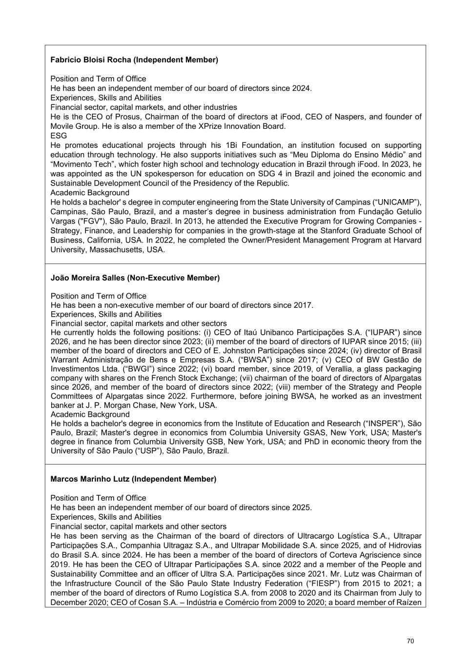 Fabricio Bloisi Rocha (Independent Member) Position and Term of Office He has been an independent member of our board of directors since 2024. Experiences, Skills and Abilities Financial sector, capital markets, and other industries He is the CEO of Prosus, Chairman of the board of directors at iFood, CEO of Naspers, and founder of Movile Group. He is also a member of the XPrize Innovation Board. ESG He promotes educational projects through his 1Bi Foundation, an institution focused on supporting education through technology. He also supports initiatives such as “Meu Diploma do Ensino Médio” and “Movimento Tech”, which foster high school and technology education in Brazil through iFood. In 2023, he was appointed as the UN spokesperson for education on SDG 4 in Brazil and joined the economic and Sustainable Development Council of the Presidency of the Republic. Academic Background He holds a bachelor' s degree in computer engineering from the State University of Campinas (“UNICAMP”), Campinas, São Paulo, Brazil, and a master’s degree in business administration from Fundação Getulio Vargas ("FGV"), São Paulo, Brazil. In 2013, he attended the Executive Program for Growing Companies - Strategy, Finance, and Leadership for companies in the growth-stage at the Stanford Graduate School of Business, California, USA. In 2022, he completed the Owner/President Management Program at Harvard University, Massachusetts, USA. João Moreira Salles (Non-Executive Member) Position and Term of Office He has been a non-executive member of our board of directors since 2017. Experiences, Skills and Abilities Financial sector, capital markets and other sectors He currently holds the following positions: (i) CEO of Itaú Unibanco Participações S.A. (“IUPAR”) since 2026, and he has been director since 2023; (ii) member of the board of directors of IUPAR since 2015; (iii) member of the board of directors and CEO of E. Johnston Participações since 2024; (iv) director of Brasil Warrant Administração de Bens e Empresas S.A. (“BWSA”) since 2017; (v) CEO of BW Gestão de Investimentos Ltda. (“BWGI”) since 2022; (vi) board member, since 2019, of Verallia, a glass packaging company with shares on the French Stock Exchange; (vii) chairman of the board of directors of Alpargatas since 2026, and member of the board of directors since 2022; (viii) member of the Strategy and People Committees of Alpargatas since 2022. Furthermore, before joining BWSA, he worked as an investment banker at J. P. Morgan Chase, New York, USA. Academic Background He holds a bachelor's degree in economics from the Institute of Education and Research (“INSPER”), São Paulo, Brazil; Master's degree in economics from Columbia University GSAS, New York, USA; Master's degree in finance from Columbia University GSB, New York, USA; and PhD in economic theory from the University of São Paulo (“USP”), São Paulo, Brazil. Marcos Marinho Lutz (Independent Member) Position and Term of Office He has been an independent member of our board of directors since 2025. Experiences, Skills and Abilities Financial sector, capital markets and other sectors He has been serving as the Chairman of the board of directors of Ultracargo Logística S.A., Ultrapar Participações S.A., Companhia Ultragaz S.A., and Ultrapar Mobilidade S.A. since 2025, and of Hidrovias do Brasil S.A. since 2024. He has been a member of the board of directors of Corteva Agriscience since 2019. He has been the CEO of Ultrapar Participações S.A. since 2022 and a member of the People and Sustainability Committee and an officer of Ultra S.A. Participações since 2021. Mr. Lutz was Chairman of the Infrastructure Council of the São Paulo State Industry Federation (“FIESP”) from 2015 to 2021; a member of the board of directors of Rumo Logística S.A. from 2008 to 2020 and its Chairman from July to December 2020; CEO of Cosan S.A. – Indústria e Comércio from 2009 to 2020; a board member of Raízen 70
