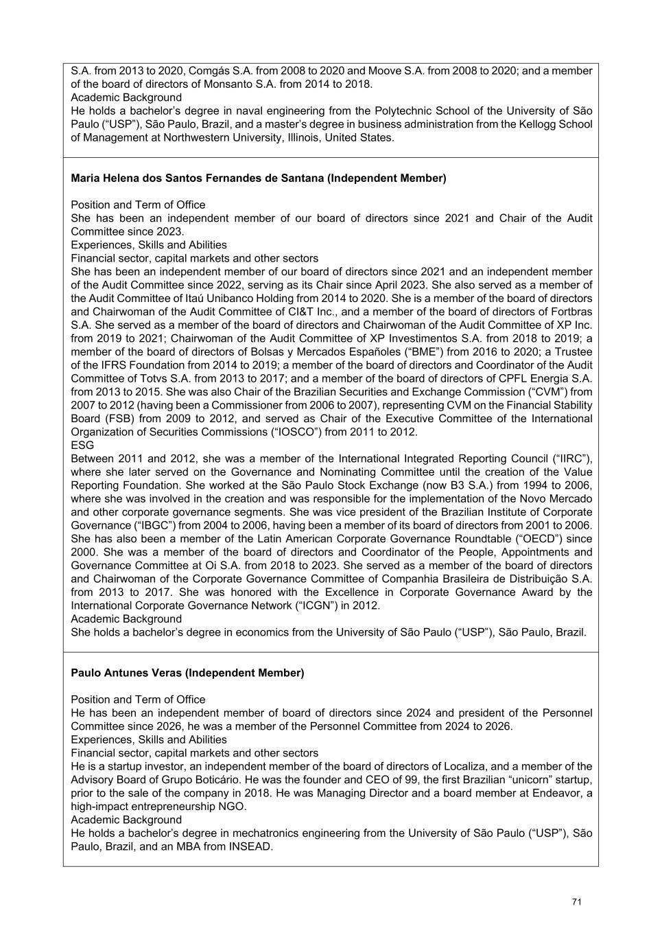 S.A. from 2013 to 2020, Comgás S.A. from 2008 to 2020 and Moove S.A. from 2008 to 2020; and a member of the board of directors of Monsanto S.A. from 2014 to 2018. Academic Background He holds a bachelor’s degree in naval engineering from the Polytechnic School of the University of São Paulo (“USP”), São Paulo, Brazil, and a master’s degree in business administration from the Kellogg School of Management at Northwestern University, Illinois, United States. Maria Helena dos Santos Fernandes de Santana (Independent Member) Position and Term of Office She has been an independent member of our board of directors since 2021 and Chair of the Audit Committee since 2023. Experiences, Skills and Abilities Financial sector, capital markets and other sectors She has been an independent member of our board of directors since 2021 and an independent member of the Audit Committee since 2022, serving as its Chair since April 2023. She also served as a member of the Audit Committee of Itaú Unibanco Holding from 2014 to 2020. She is a member of the board of directors and Chairwoman of the Audit Committee of CI&T Inc., and a member of the board of directors of Fortbras S.A. She served as a member of the board of directors and Chairwoman of the Audit Committee of XP Inc. from 2019 to 2021; Chairwoman of the Audit Committee of XP Investimentos S.A. from 2018 to 2019; a member of the board of directors of Bolsas y Mercados Españoles (“BME”) from 2016 to 2020; a Trustee of the IFRS Foundation from 2014 to 2019; a member of the board of directors and Coordinator of the Audit Committee of Totvs S.A. from 2013 to 2017; and a member of the board of directors of CPFL Energia S.A. from 2013 to 2015. She was also Chair of the Brazilian Securities and Exchange Commission (“CVM”) from 2007 to 2012 (having been a Commissioner from 2006 to 2007), representing CVM on the Financial Stability Board (FSB) from 2009 to 2012, and served as Chair of the Executive Committee of the International Organization of Securities Commissions (“IOSCO”) from 2011 to 2012. ESG Between 2011 and 2012, she was a member of the International Integrated Reporting Council (“IIRC”), where she later served on the Governance and Nominating Committee until the creation of the Value Reporting Foundation. She worked at the São Paulo Stock Exchange (now B3 S.A.) from 1994 to 2006, where she was involved in the creation and was responsible for the implementation of the Novo Mercado and other corporate governance segments. She was vice president of the Brazilian Institute of Corporate Governance (“IBGC”) from 2004 to 2006, having been a member of its board of directors from 2001 to 2006. She has also been a member of the Latin American Corporate Governance Roundtable (“OECD”) since 2000. She was a member of the board of directors and Coordinator of the People, Appointments and Governance Committee at Oi S.A. from 2018 to 2023. She served as a member of the board of directors and Chairwoman of the Corporate Governance Committee of Companhia Brasileira de Distribuição S.A. from 2013 to 2017. She was honored with the Excellence in Corporate Governance Award by the International Corporate Governance Network (“ICGN”) in 2012. Academic Background She holds a bachelor’s degree in economics from the University of São Paulo (“USP”), São Paulo, Brazil. Paulo Antunes Veras (Independent Member) Position and Term of Office He has been an independent member of board of directors since 2024 and president of the Personnel Committee since 2026, he was a member of the Personnel Committee from 2024 to 2026. Experiences, Skills and Abilities Financial sector, capital markets and other sectors He is a startup investor, an independent member of the board of directors of Localiza, and a member of the Advisory Board of Grupo Boticário. He was the founder and CEO of 99, the first Brazilian “unicorn” startup, prior to the sale of the company in 2018. He was Managing Director and a board member at Endeavor, a high-impact entrepreneurship NGO. Academic Background He holds a bachelor’s degree in mechatronics engineering from the University of São Paulo (“USP”), São Paulo, Brazil, and an MBA from INSEAD. 71