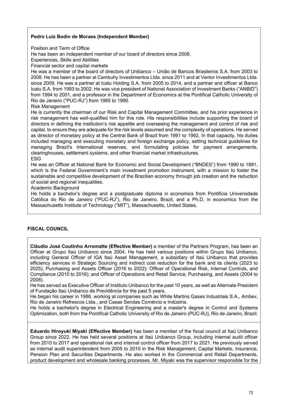 Pedro Luiz Bodin de Moraes (Independent Member) Position and Term of Office He has been an independent member of our board of directors since 2008. Experiences, Skills and Abilities Financial sector and capital markets He was a member of the board of directors of Unibanco – União de Bancos Brasileiros S.A. from 2003 to 2008. He has been a partner at Cambuhy Investimentos Ltda. since 2011 and at Ventor Investimentos Ltda. since 2009. He was a partner at Icatu Holding S.A. from 2005 to 2014, and a partner and officer at Banco Icatu S.A. from 1993 to 2002. He was vice president of National Association of Investment Banks (“ANBID”) from 1994 to 2001, and a professor in the Department of Economics at the Pontifical Catholic University of Rio de Janeiro (“PUC-RJ”) from 1985 to 1990. Risk Management He is currently the chairman of our Risk and Capital Management Committee, and his prior experience in risk management has well-qualified him for this role. His responsibilities include supporting the board of directors in defining the institution’s risk appetite and overseeing the management and control of risk and capital, to ensure they are adequate for the risk levels assumed and the complexity of operations. He served as director of monetary policy at the Central Bank of Brazil from 1991 to 1992. In that capacity, his duties included managing and executing monetary and foreign exchange policy, setting technical guidelines for managing Brazil’s international reserves, and formulating policies for payment arrangements, clearinghouses, settlement systems, and other financial market infrastructures. ESG He was an Officer at National Bank for Economic and Social Development (“BNDES”) from 1990 to 1991, which is the Federal Government’s main investment promotion instrument, with a mission to foster the sustainable and competitive development of the Brazilian economy through job creation and the reduction of social and regional inequalities. Academic Background He holds a bachelor’s degree and a postgraduate diploma in economics from Pontificia Universidade Católica do Rio de Janeiro (“PUC-RJ”), Rio de Janeiro, Brazil, and a Ph.D. in economics from the Massachusetts Institute of Technology (“MIT”), Massachusetts, United States. FISCAL COUNCIL Cláudio José Coutinho Arromatte (Effective Member) a member of the Partners Program, has been an Officer at Grupo Itaú Unibanco since 2004. He has held various positions within Grupo Itaú Unibanco, including General Officer of IGA Itaú Asset Management, a subsidiary of Itaú Unibanco that provides efficiency services in Strategic Sourcing and indirect cost reduction for the bank and its clients (2023 to 2025); Purchasing and Assets Officer (2016 to 2022); Officer of Operational Risk, Internal Controls, and Compliance (2010 to 2016); and Officer of Operations and Retail Service, Purchasing, and Assets (2004 to 2008). He has served as Executive Officer of Instituto Unibanco for the past 10 years, as well as Alternate President of Fundação Itaú Unibanco de Previdência for the past 5 years. He began his career in 1986, working at companies such as White Martins Gases Industriais S.A., Ambev, Rio de Janeiro Refrescos Ltda., and Casas Sendas Comércio e Indústria. He holds a bachelor's degree in Electrical Engineering and a master's degree in Control and Systems Optimization, both from the Pontifical Catholic University of Rio de Janeiro (PUC-RJ), Rio de Janeiro, Brazil. Eduardo Hiroyuki Miyaki (Effective Member) has been a member of the fiscal council at Itaú Unibanco Group since 2022. He has held several positions at Itaú Unibanco Group, including internal audit officer from 2010 to 2017 and operational risk and internal control officer from 2017 to 2021. He previously served as internal audit superintendent from 2005 to 2010 in the Risk Management, Capital Markets, Insurance, Pension Plan and Securities Departments. He also worked in the Commercial and Retail Departments, product development and wholesale banking processes. Mr. Miyaki was the supervisor responsible for the 72