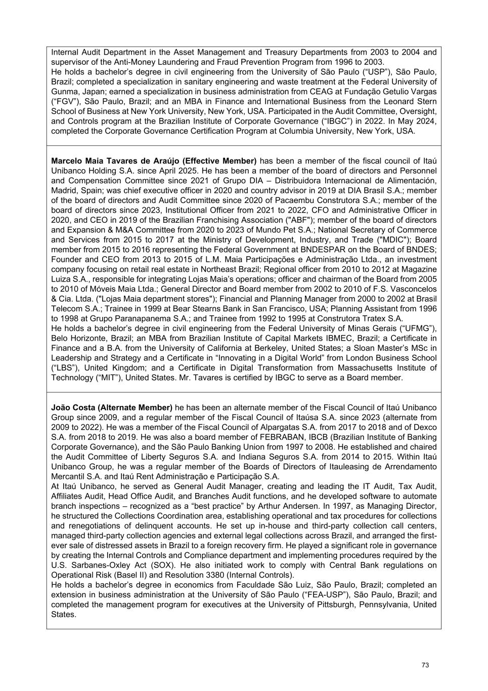 Internal Audit Department in the Asset Management and Treasury Departments from 2003 to 2004 and supervisor of the Anti-Money Laundering and Fraud Prevention Program from 1996 to 2003. He holds a bachelor’s degree in civil engineering from the University of São Paulo (“USP”), São Paulo, Brazil; completed a specialization in sanitary engineering and waste treatment at the Federal University of Gunma, Japan; earned a specialization in business administration from CEAG at Fundação Getulio Vargas (“FGV”), São Paulo, Brazil; and an MBA in Finance and International Business from the Leonard Stern School of Business at New York University, New York, USA. Participated in the Audit Committee, Oversight, and Controls program at the Brazilian Institute of Corporate Governance (“IBGC”) in 2022. In May 2024, completed the Corporate Governance Certification Program at Columbia University, New York, USA. Marcelo Maia Tavares de Araújo (Effective Member) has been a member of the fiscal council of Itaú Unibanco Holding S.A. since April 2025. He has been a member of the board of directors and Personnel and Compensation Committee since 2021 of Grupo DIA – Distribuidora Internacional de Alimentación, Madrid, Spain; was chief executive officer in 2020 and country advisor in 2019 at DIA Brasil S.A.; member of the board of directors and Audit Committee since 2020 of Pacaembu Construtora S.A.; member of the board of directors since 2023, Institutional Officer from 2021 to 2022, CFO and Administrative Officer in 2020, and CEO in 2019 of the Brazilian Franchising Association ("ABF"); member of the board of directors and Expansion & M&A Committee from 2020 to 2023 of Mundo Pet S.A.; National Secretary of Commerce and Services from 2015 to 2017 at the Ministry of Development, Industry, and Trade ("MDIC"); Board member from 2015 to 2016 representing the Federal Government at BNDESPAR on the Board of BNDES; Founder and CEO from 2013 to 2015 of L.M. Maia Participações e Administração Ltda., an investment company focusing on retail real estate in Northeast Brazil; Regional officer from 2010 to 2012 at Magazine Luiza S.A., responsible for integrating Lojas Maia’s operations; officer and chairman of the Board from 2005 to 2010 of Móveis Maia Ltda.; General Director and Board member from 2002 to 2010 of F.S. Vasconcelos & Cia. Ltda. ("Lojas Maia department stores"); Financial and Planning Manager from 2000 to 2002 at Brasil Telecom S.A.; Trainee in 1999 at Bear Stearns Bank in San Francisco, USA; Planning Assistant from 1996 to 1998 at Grupo Paranapanema S.A.; and Trainee from 1992 to 1995 at Construtora Tratex S.A. He holds a bachelor’s degree in civil engineering from the Federal University of Minas Gerais (“UFMG”), Belo Horizonte, Brazil; an MBA from Brazilian Institute of Capital Markets IBMEC, Brazil; a Certificate in Finance and a B.A. from the University of California at Berkeley, United States; a Sloan Master’s MSc in Leadership and Strategy and a Certificate in “Innovating in a Digital World” from London Business School (“LBS”), United Kingdom; and a Certificate in Digital Transformation from Massachusetts Institute of Technology (“MIT”), United States. Mr. Tavares is certified by IBGC to serve as a Board member. João Costa (Alternate Member) he has been an alternate member of the Fiscal Council of Itaú Unibanco Group since 2009, and a regular member of the Fiscal Council of Itaúsa S.A. since 2023 (alternate from 2009 to 2022). He was a member of the Fiscal Council of Alpargatas S.A. from 2017 to 2018 and of Dexco S.A. from 2018 to 2019. He was also a board member of FEBRABAN, IBCB (Brazilian Institute of Banking Corporate Governance), and the São Paulo Banking Union from 1997 to 2008. He established and chaired the Audit Committee of Liberty Seguros S.A. and Indiana Seguros S.A. from 2014 to 2015. Within Itaú Unibanco Group, he was a regular member of the Boards of Directors of Itauleasing de Arrendamento Mercantil S.A. and Itaú Rent Administração e Participação S.A. At Itaú Unibanco, he served as General Audit Manager, creating and leading the IT Audit, Tax Audit, Affiliates Audit, Head Office Audit, and Branches Audit functions, and he developed software to automate branch inspections – recognized as a “best practice” by Arthur Andersen. In 1997, as Managing Director, he structured the Collections Coordination area, establishing operational and tax procedures for collections and renegotiations of delinquent accounts. He set up in-house and third-party collection call centers, managed third-party collection agencies and external legal collections across Brazil, and arranged the first- ever sale of distressed assets in Brazil to a foreign recovery firm. He played a significant role in governance by creating the Internal Controls and Compliance department and implementing procedures required by the U.S. Sarbanes-Oxley Act (SOX). He also initiated work to comply with Central Bank regulations on Operational Risk (Basel II) and Resolution 3380 (Internal Controls). He holds a bachelor’s degree in economics from Faculdade São Luiz, São Paulo, Brazil; completed an extension in business administration at the University of São Paulo (“FEA-USP”), São Paulo, Brazil; and completed the management program for executives at the University of Pittsburgh, Pennsylvania, United States. 73