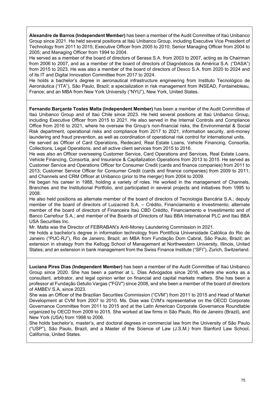 Alexandre de Barros (Independent Member) has been a member of the Audit Committee of Itaú Unibanco Group since 2021. He held several positions at Itaú Unibanco Group, including Executive Vice President of Technology from 2011 to 2015; Executive Officer from 2005 to 2010; Senior Managing Officer from 2004 to 2005; and Managing Officer from 1994 to 2004. He served as a member of the board of directors of Serasa S.A. from 2003 to 2007, acting as its Chairman from 2006 to 2007, and as a member of the board of directors of Diagnósticos da América S.A. (“DASA”) from 2015 to 2023. He was also a member of the board of directors of Dexco S.A. from 2020 to 2024 and of its IT and Digital Innovation Committee from 2017 to 2024. He holds a bachelor’s degree in aeronautical infrastructure engineering from Instituto Tecnológico de Aeronáutica (“ITA”), São Paulo, Brazil; a specialization in risk management from INSEAD, Fontainebleau, France; and an MBA from New York University (“NYU”), New York, United States. Fernando Barçante Tostes Malta (Independent Member) has been a member of the Audit Committee of Itaú Unibanco Group and of Itaú Chile since 2023. He held several positions at Itaú Unibanco Group, including Executive Officer from 2015 to 2021. He also served in the Internal Controls and Compliance Office from 2016 to 2021, where he oversaw the Group’s non-financial risks, the Environmental & Social Risk department, operational risks and compliance from 2017 to 2021, information security, anti-money laundering and fraud prevention, as well as coordination of operational risk control for international units. He served as Officer of Card Operations, Redecard, Real Estate Loans, Vehicle Financing, Consortia, Collections, Legal Operations, and all active client services from 2015 to 2016. He was also an Officer overseeing Customer Service, Card Operations and Services, Real Estate Loans, Vehicle Financing, Consortia, and Insurance & Capitalization Operations from 2013 to 2015. He served as Customer Service and Operations Officer for Consumer Credit (cards and finance companies) from 2011 to 2013; Customer Service Officer for Consumer Credit (cards and finance companies) from 2009 to 2011; and Channels and CRM Officer at Unibanco (prior to the merger) from 2004 to 2009. He began his career in 1988, holding a variety of roles. He worked in the management of Channels, Branches and the Institutional Portfolio, and participated in several projects and initiatives from 1995 to 2008. He also held positions as alternate member of the board of directors of Tecnologia Bancária S.A.; deputy member of the board of directors of Luizacred S.A. – Crédito, Financiamento e Investimento; alternate member of the board of directors of Financeira Itaú CBD Crédito, Financiamento e Investimento and of Banco Carrefour S.A.; and member of the Boards of Directors of Itaú BBA International PLC and Itaú BBA USA Securities Inc. Mr. Malta was the Director of FEBRABAN’s Anti-Money Laundering Commission in 2021. He holds a bachelor’s degree in information technology from Pontifícia Universidade Católica do Rio de Janeiro (“PUC-RJ”), Rio de Janeiro, Brazil; an MBA from Fundação Dom Cabral, São Paulo, Brazil; an extension in strategy from the Kellogg School of Management at Northwestern University, Illinois, United States; and an extension in bank management from the Swiss Finance Institute (“SFI”), Zurich, Switzerland. Luciana Pires Dias (Independent Member) has been a member of the Audit Committee of Itaú Unibanco Group since 2020. She has been a partner at L. Dias Advogados since 2016, where she works as a consultant, arbitrator, and legal opinion writer on financial and capital markets matters. She has been a professor at Fundação Getulio Vargas ("FGV") since 2008, and she been a member of the board of directors of AMBEV S.A. since 2023. She was an Officer of the Brazilian Securities Commission (“CVM”) from 2011 to 2015 and Head of Market Development at CVM from 2007 to 2010. Ms. Dias was CVM’s representative on the OECD Corporate Governance Committee from 2011 to 2015 and at the Latin American Corporate Governance Roundtable organized by OECD from 2009 to 2015. She worked at law firms in São Paulo, Rio de Janeiro (Brazil), and New York (USA) from 1998 to 2006. She holds bachelor’s, master’s, and doctoral degrees in commercial law from the University of São Paulo (“USP”), São Paulo, Brazil, and a Master of the Science of Law (J.S.M.) from Stanford Law School, California, United States. 75