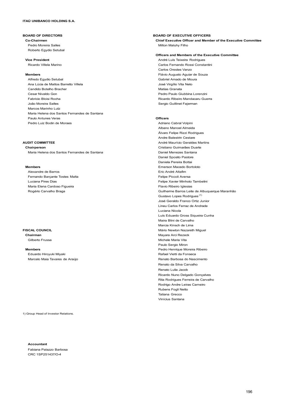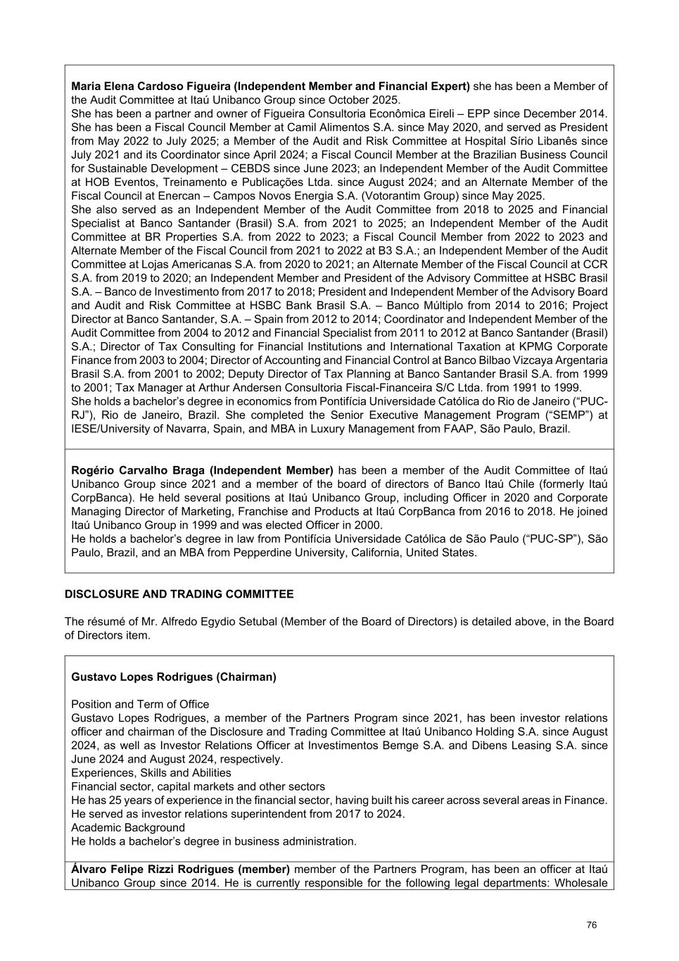 Maria Elena Cardoso Figueira (Independent Member and Financial Expert) she has been a Member of the Audit Committee at Itaú Unibanco Group since October 2025. She has been a partner and owner of Figueira Consultoria Econômica Eireli – EPP since December 2014. She has been a Fiscal Council Member at Camil Alimentos S.A. since May 2020, and served as President from May 2022 to July 2025; a Member of the Audit and Risk Committee at Hospital Sírio Libanês since July 2021 and its Coordinator since April 2024; a Fiscal Council Member at the Brazilian Business Council for Sustainable Development – CEBDS since June 2023; an Independent Member of the Audit Committee at HOB Eventos, Treinamento e Publicações Ltda. since August 2024; and an Alternate Member of the Fiscal Council at Enercan – Campos Novos Energia S.A. (Votorantim Group) since May 2025. She also served as an Independent Member of the Audit Committee from 2018 to 2025 and Financial Specialist at Banco Santander (Brasil) S.A. from 2021 to 2025; an Independent Member of the Audit Committee at BR Properties S.A. from 2022 to 2023; a Fiscal Council Member from 2022 to 2023 and Alternate Member of the Fiscal Council from 2021 to 2022 at B3 S.A.; an Independent Member of the Audit Committee at Lojas Americanas S.A. from 2020 to 2021; an Alternate Member of the Fiscal Council at CCR S.A. from 2019 to 2020; an Independent Member and President of the Advisory Committee at HSBC Brasil S.A. – Banco de Investimento from 2017 to 2018; President and Independent Member of the Advisory Board and Audit and Risk Committee at HSBC Bank Brasil S.A. – Banco Múltiplo from 2014 to 2016; Project Director at Banco Santander, S.A. – Spain from 2012 to 2014; Coordinator and Independent Member of the Audit Committee from 2004 to 2012 and Financial Specialist from 2011 to 2012 at Banco Santander (Brasil) S.A.; Director of Tax Consulting for Financial Institutions and International Taxation at KPMG Corporate Finance from 2003 to 2004; Director of Accounting and Financial Control at Banco Bilbao Vizcaya Argentaria Brasil S.A. from 2001 to 2002; Deputy Director of Tax Planning at Banco Santander Brasil S.A. from 1999 to 2001; Tax Manager at Arthur Andersen Consultoria Fiscal-Financeira S/C Ltda. from 1991 to 1999. She holds a bachelor’s degree in economics from Pontifícia Universidade Católica do Rio de Janeiro (“PUC- RJ”), Rio de Janeiro, Brazil. She completed the Senior Executive Management Program (“SEMP”) at IESE/University of Navarra, Spain, and MBA in Luxury Management from FAAP, São Paulo, Brazil. Rogério Carvalho Braga (Independent Member) has been a member of the Audit Committee of Itaú Unibanco Group since 2021 and a member of the board of directors of Banco Itaú Chile (formerly Itaú CorpBanca). He held several positions at Itaú Unibanco Group, including Officer in 2020 and Corporate Managing Director of Marketing, Franchise and Products at Itaú CorpBanca from 2016 to 2018. He joined Itaú Unibanco Group in 1999 and was elected Officer in 2000. He holds a bachelor’s degree in law from Pontifícia Universidade Católica de São Paulo (“PUC-SP”), São Paulo, Brazil, and an MBA from Pepperdine University, California, United States. DISCLOSURE AND TRADING COMMITTEE The résumé of Mr. Alfredo Egydio Setubal (Member of the Board of Directors) is detailed above, in the Board of Directors item. Gustavo Lopes Rodrigues (Chairman) Position and Term of Office Gustavo Lopes Rodrigues, a member of the Partners Program since 2021, has been investor relations officer and chairman of the Disclosure and Trading Committee at Itaú Unibanco Holding S.A. since August 2024, as well as Investor Relations Officer at Investimentos Bemge S.A. and Dibens Leasing S.A. since June 2024 and August 2024, respectively. Experiences, Skills and Abilities Financial sector, capital markets and other sectors He has 25 years of experience in the financial sector, having built his career across several areas in Finance. He served as investor relations superintendent from 2017 to 2024. Academic Background He holds a bachelor’s degree in business administration. Álvaro Felipe Rizzi Rodrigues (member) member of the Partners Program, has been an officer at Itaú Unibanco Group since 2014. He is currently responsible for the following legal departments: Wholesale 76