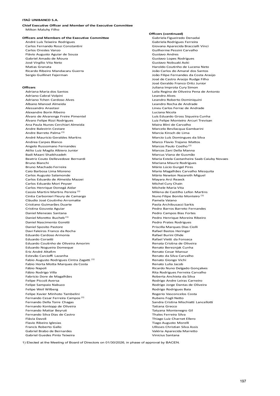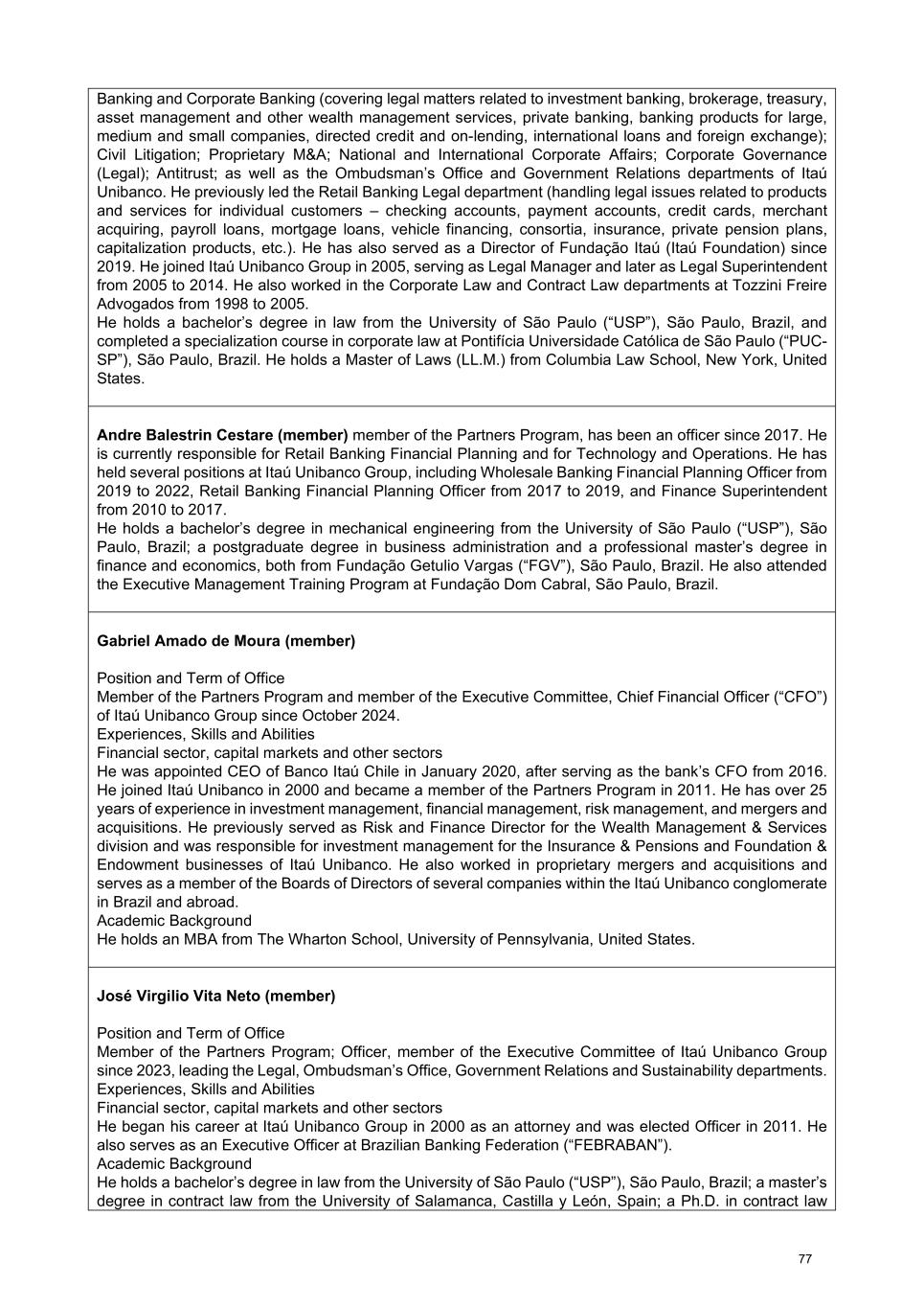 Banking and Corporate Banking (covering legal matters related to investment banking, brokerage, treasury, asset management and other wealth management services, private banking, banking products for large, medium and small companies, directed credit and on-lending, international loans and foreign exchange); Civil Litigation; Proprietary M&A; National and International Corporate Affairs; Corporate Governance (Legal); Antitrust; as well as the Ombudsman’s Office and Government Relations departments of Itaú Unibanco. He previously led the Retail Banking Legal department (handling legal issues related to products and services for individual customers – checking accounts, payment accounts, credit cards, merchant acquiring, payroll loans, mortgage loans, vehicle financing, consortia, insurance, private pension plans, capitalization products, etc.). He has also served as a Director of Fundação Itaú (Itaú Foundation) since 2019. He joined Itaú Unibanco Group in 2005, serving as Legal Manager and later as Legal Superintendent from 2005 to 2014. He also worked in the Corporate Law and Contract Law departments at Tozzini Freire Advogados from 1998 to 2005. He holds a bachelor’s degree in law from the University of São Paulo (“USP”), São Paulo, Brazil, and completed a specialization course in corporate law at Pontifícia Universidade Católica de São Paulo (“PUC- SP”), São Paulo, Brazil. He holds a Master of Laws (LL.M.) from Columbia Law School, New York, United States. Andre Balestrin Cestare (member) member of the Partners Program, has been an officer since 2017. He is currently responsible for Retail Banking Financial Planning and for Technology and Operations. He has held several positions at Itaú Unibanco Group, including Wholesale Banking Financial Planning Officer from 2019 to 2022, Retail Banking Financial Planning Officer from 2017 to 2019, and Finance Superintendent from 2010 to 2017. He holds a bachelor’s degree in mechanical engineering from the University of São Paulo (“USP”), São Paulo, Brazil; a postgraduate degree in business administration and a professional master’s degree in finance and economics, both from Fundação Getulio Vargas (“FGV”), São Paulo, Brazil. He also attended the Executive Management Training Program at Fundação Dom Cabral, São Paulo, Brazil. Gabriel Amado de Moura (member) Position and Term of Office Member of the Partners Program and member of the Executive Committee, Chief Financial Officer (“CFO”) of Itaú Unibanco Group since October 2024. Experiences, Skills and Abilities Financial sector, capital markets and other sectors He was appointed CEO of Banco Itaú Chile in January 2020, after serving as the bank’s CFO from 2016. He joined Itaú Unibanco in 2000 and became a member of the Partners Program in 2011. He has over 25 years of experience in investment management, financial management, risk management, and mergers and acquisitions. He previously served as Risk and Finance Director for the Wealth Management & Services division and was responsible for investment management for the Insurance & Pensions and Foundation & Endowment businesses of Itaú Unibanco. He also worked in proprietary mergers and acquisitions and serves as a member of the Boards of Directors of several companies within the Itaú Unibanco conglomerate in Brazil and abroad. Academic Background He holds an MBA from The Wharton School, University of Pennsylvania, United States. José Virgilio Vita Neto (member) Position and Term of Office Member of the Partners Program; Officer, member of the Executive Committee of Itaú Unibanco Group since 2023, leading the Legal, Ombudsman’s Office, Government Relations and Sustainability departments. Experiences, Skills and Abilities Financial sector, capital markets and other sectors He began his career at Itaú Unibanco Group in 2000 as an attorney and was elected Officer in 2011. He also serves as an Executive Officer at Brazilian Banking Federation (“FEBRABAN”). Academic Background He holds a bachelor’s degree in law from the University of São Paulo (“USP”), São Paulo, Brazil; a master’s degree in contract law from the University of Salamanca, Castilla y León, Spain; a Ph.D. in contract law 77