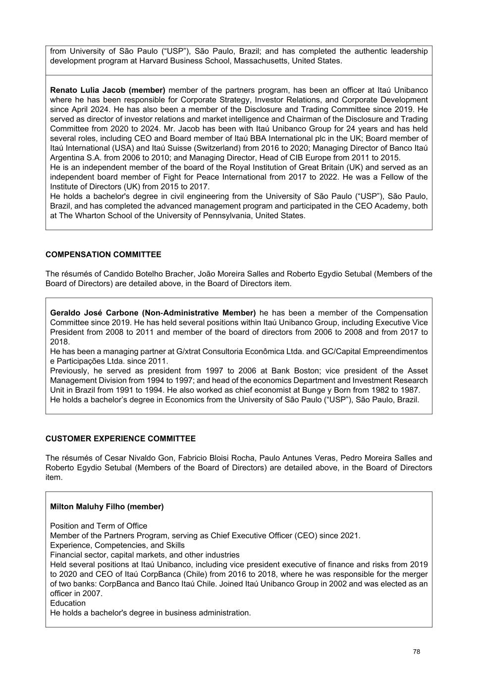 from University of São Paulo (“USP”), São Paulo, Brazil; and has completed the authentic leadership development program at Harvard Business School, Massachusetts, United States. Renato Lulia Jacob (member) member of the partners program, has been an officer at Itaú Unibanco where he has been responsible for Corporate Strategy, Investor Relations, and Corporate Development since April 2024. He has also been a member of the Disclosure and Trading Committee since 2019. He served as director of investor relations and market intelligence and Chairman of the Disclosure and Trading Committee from 2020 to 2024. Mr. Jacob has been with Itaú Unibanco Group for 24 years and has held several roles, including CEO and Board member of Itaú BBA International plc in the UK; Board member of Itaú International (USA) and Itaú Suisse (Switzerland) from 2016 to 2020; Managing Director of Banco Itaú Argentina S.A. from 2006 to 2010; and Managing Director, Head of CIB Europe from 2011 to 2015. He is an independent member of the board of the Royal Institution of Great Britain (UK) and served as an independent board member of Fight for Peace International from 2017 to 2022. He was a Fellow of the Institute of Directors (UK) from 2015 to 2017. He holds a bachelor's degree in civil engineering from the University of São Paulo (“USP”), São Paulo, Brazil, and has completed the advanced management program and participated in the CEO Academy, both at The Wharton School of the University of Pennsylvania, United States. COMPENSATION COMMITTEE The résumés of Candido Botelho Bracher, João Moreira Salles and Roberto Egydio Setubal (Members of the Board of Directors) are detailed above, in the Board of Directors item. Geraldo José Carbone (Non‑Administrative Member) he has been a member of the Compensation Committee since 2019. He has held several positions within Itaú Unibanco Group, including Executive Vice President from 2008 to 2011 and member of the board of directors from 2006 to 2008 and from 2017 to 2018. He has been a managing partner at G/xtrat Consultoria Econômica Ltda. and GC/Capital Empreendimentos e Participações Ltda. since 2011. Previously, he served as president from 1997 to 2006 at Bank Boston; vice president of the Asset Management Division from 1994 to 1997; and head of the economics Department and Investment Research Unit in Brazil from 1991 to 1994. He also worked as chief economist at Bunge y Born from 1982 to 1987. He holds a bachelor’s degree in Economics from the University of São Paulo (“USP”), São Paulo, Brazil. CUSTOMER EXPERIENCE COMMITTEE The résumés of Cesar Nivaldo Gon, Fabricio Bloisi Rocha, Paulo Antunes Veras, Pedro Moreira Salles and Roberto Egydio Setubal (Members of the Board of Directors) are detailed above, in the Board of Directors item. Milton Maluhy Filho (member) Position and Term of Office Member of the Partners Program, serving as Chief Executive Officer (CEO) since 2021. Experience, Competencies, and Skills Financial sector, capital markets, and other industries Held several positions at Itaú Unibanco, including vice president executive of finance and risks from 2019 to 2020 and CEO of Itaú CorpBanca (Chile) from 2016 to 2018, where he was responsible for the merger of two banks: CorpBanca and Banco Itaú Chile. Joined Itaú Unibanco Group in 2002 and was elected as an officer in 2007. Education He holds a bachelor's degree in business administration. 78
