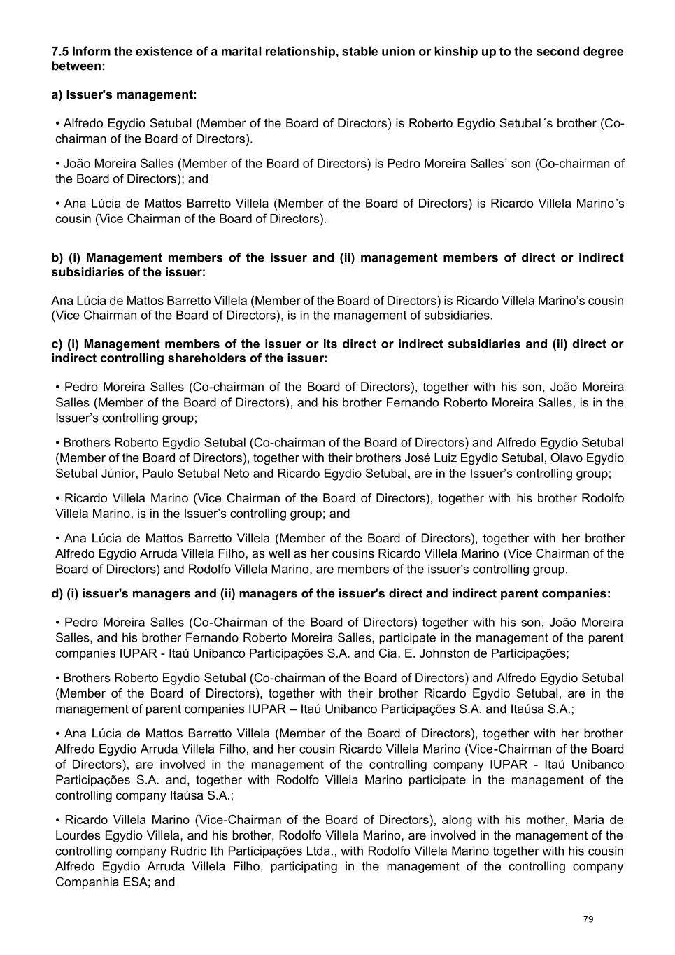 7.5 Inform the existence of a marital relationship, stable union or kinship up to the second degree between: a) Issuer's management: • Alfredo Egydio Setubal (Member of the Board of Directors) is Roberto Egydio Setubal´s brother (Co- chairman of the Board of Directors). • João Moreira Salles (Member of the Board of Directors) is Pedro Moreira Salles’ son (Co-chairman of the Board of Directors); and • Ana Lúcia de Mattos Barretto Villela (Member of the Board of Directors) is Ricardo Villela Marino’s cousin (Vice Chairman of the Board of Directors). b) (i) Management members of the issuer and (ii) management members of direct or indirect subsidiaries of the issuer: Ana Lúcia de Mattos Barretto Villela (Member of the Board of Directors) is Ricardo Villela Marino’s cousin (Vice Chairman of the Board of Directors), is in the management of subsidiaries. c) (i) Management members of the issuer or its direct or indirect subsidiaries and (ii) direct or indirect controlling shareholders of the issuer: • Pedro Moreira Salles (Co-chairman of the Board of Directors), together with his son, João Moreira Salles (Member of the Board of Directors), and his brother Fernando Roberto Moreira Salles, is in the Issuer’s controlling group; • Brothers Roberto Egydio Setubal (Co-chairman of the Board of Directors) and Alfredo Egydio Setubal (Member of the Board of Directors), together with their brothers José Luiz Egydio Setubal, Olavo Egydio Setubal Júnior, Paulo Setubal Neto and Ricardo Egydio Setubal, are in the Issuer’s controlling group; • Ricardo Villela Marino (Vice Chairman of the Board of Directors), together with his brother Rodolfo Villela Marino, is in the Issuer’s controlling group; and • Ana Lúcia de Mattos Barretto Villela (Member of the Board of Directors), together with her brother Alfredo Egydio Arruda Villela Filho, as well as her cousins Ricardo Villela Marino (Vice Chairman of the Board of Directors) and Rodolfo Villela Marino, are members of the issuer's controlling group. d) (i) issuer's managers and (ii) managers of the issuer's direct and indirect parent companies: • Pedro Moreira Salles (Co-Chairman of the Board of Directors) together with his son, João Moreira Salles, and his brother Fernando Roberto Moreira Salles, participate in the management of the parent companies IUPAR - Itaú Unibanco Participações S.A. and Cia. E. Johnston de Participações; • Brothers Roberto Egydio Setubal (Co-chairman of the Board of Directors) and Alfredo Egydio Setubal (Member of the Board of Directors), together with their brother Ricardo Egydio Setubal, are in the management of parent companies IUPAR – Itaú Unibanco Participações S.A. and Itaúsa S.A.; • Ana Lúcia de Mattos Barretto Villela (Member of the Board of Directors), together with her brother Alfredo Egydio Arruda Villela Filho, and her cousin Ricardo Villela Marino (Vice-Chairman of the Board of Directors), are involved in the management of the controlling company IUPAR - Itaú Unibanco Participações S.A. and, together with Rodolfo Villela Marino participate in the management of the controlling company Itaúsa S.A.; • Ricardo Villela Marino (Vice-Chairman of the Board of Directors), along with his mother, Maria de Lourdes Egydio Villela, and his brother, Rodolfo Villela Marino, are involved in the management of the controlling company Rudric Ith Participações Ltda., with Rodolfo Villela Marino together with his cousin Alfredo Egydio Arruda Villela Filho, participating in the management of the controlling company Companhia ESA; and 79