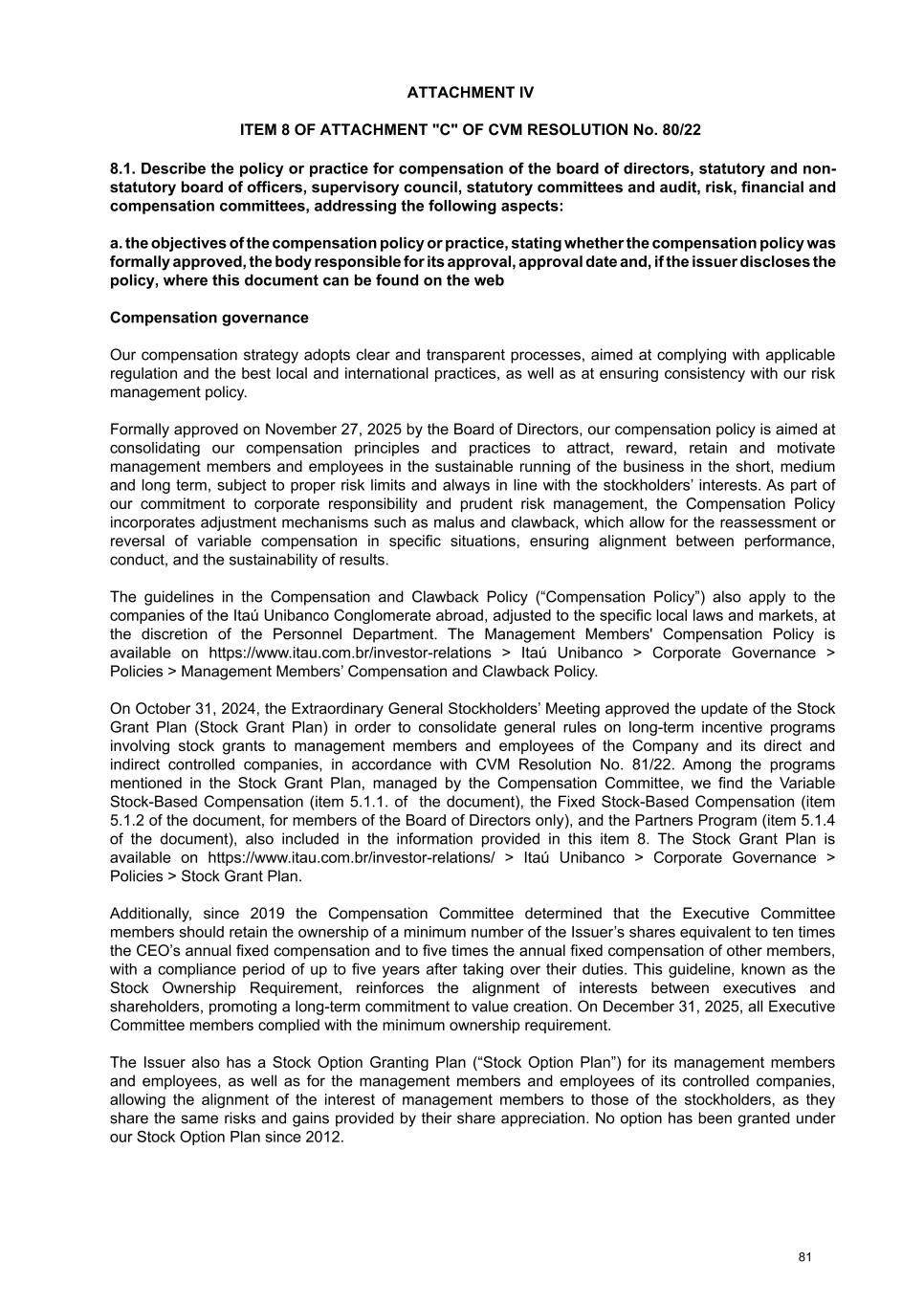 ATTACHMENT IV ITEM 8 OF ATTACHMENT "C" OF CVM RESOLUTION No. 80/22 8.1. Describe the policy or practice for compensation of the board of directors, statutory and non- statutory board of officers, supervisory council, statutory committees and audit, risk, financial and compensation committees, addressing the following aspects: a. the objectives of the compensation policy or practice, stating whether the compensation policy was formally approved, the body responsible for its approval, approval date and, if the issuer discloses the policy, where this document can be found on the web Compensation governance Our compensation strategy adopts clear and transparent processes, aimed at complying with applicable regulation and the best local and international practices, as well as at ensuring consistency with our risk management policy. Formally approved on November 27, 2025 by the Board of Directors, our compensation policy is aimed at consolidating our compensation principles and practices to attract, reward, retain and motivate management members and employees in the sustainable running of the business in the short, medium and long term, subject to proper risk limits and always in line with the stockholders’ interests. As part of our commitment to corporate responsibility and prudent risk management, the Compensation Policy incorporates adjustment mechanisms such as malus and clawback, which allow for the reassessment or reversal of variable compensation in specific situations, ensuring alignment between performance, conduct, and the sustainability of results. The guidelines in the Compensation and Clawback Policy (“Compensation Policy”) also apply to the companies of the Itaú Unibanco Conglomerate abroad, adjusted to the specific local laws and markets, at the discretion of the Personnel Department. The Management Members' Compensation Policy is available on https://www.itau.com.br/investor-relations > Itaú Unibanco > Corporate Governance > Policies > Management Members’ Compensation and Clawback Policy. On October 31, 2024, the Extraordinary General Stockholders’ Meeting approved the update of the Stock Grant Plan (Stock Grant Plan) in order to consolidate general rules on long-term incentive programs involving stock grants to management members and employees of the Company and its direct and indirect controlled companies, in accordance with CVM Resolution No. 81/22. Among the programs mentioned in the Stock Grant Plan, managed by the Compensation Committee, we find the Variable Stock-Based Compensation (item 5.1.1. of the document), the Fixed Stock-Based Compensation (item 5.1.2 of the document, for members of the Board of Directors only), and the Partners Program (item 5.1.4 of the document), also included in the information provided in this item 8. The Stock Grant Plan is available on https://www.itau.com.br/investor-relations/ > Itaú Unibanco > Corporate Governance > Policies > Stock Grant Plan. Additionally, since 2019 the Compensation Committee determined that the Executive Committee members should retain the ownership of a minimum number of the Issuer’s shares equivalent to ten times the CEO’s annual fixed compensation and to five times the annual fixed compensation of other members, with a compliance period of up to five years after taking over their duties. This guideline, known as the Stock Ownership Requirement, reinforces the alignment of interests between executives and shareholders, promoting a long-term commitment to value creation. On December 31, 2025, all Executive Committee members complied with the minimum ownership requirement. The Issuer also has a Stock Option Granting Plan (“Stock Option Plan”) for its management members and employees, as well as for the management members and employees of its controlled companies, allowing the alignment of the interest of management members to those of the stockholders, as they share the same risks and gains provided by their share appreciation. No option has been granted under our Stock Option Plan since 2012. 81