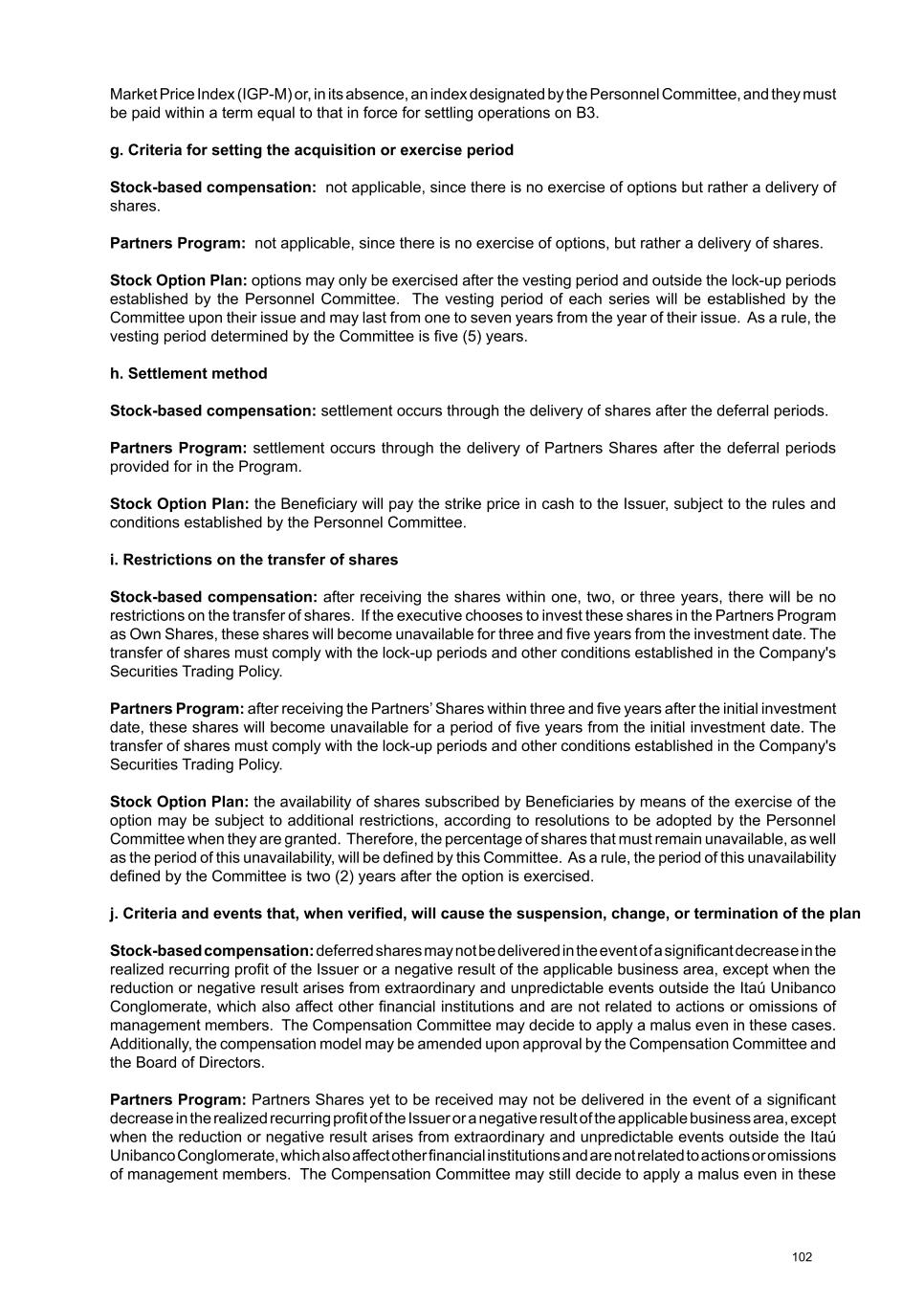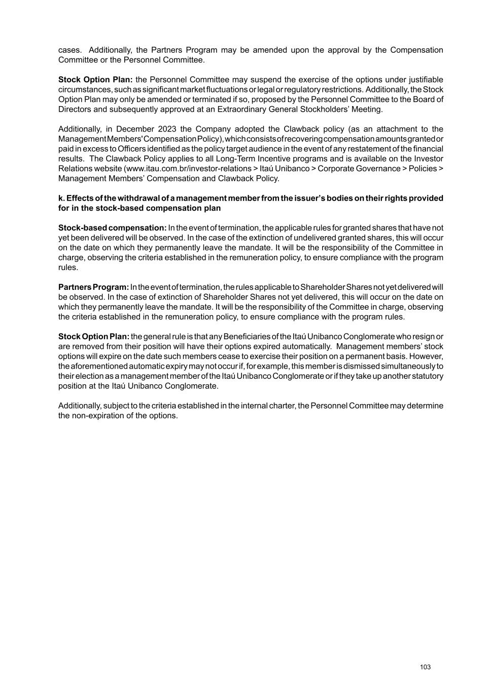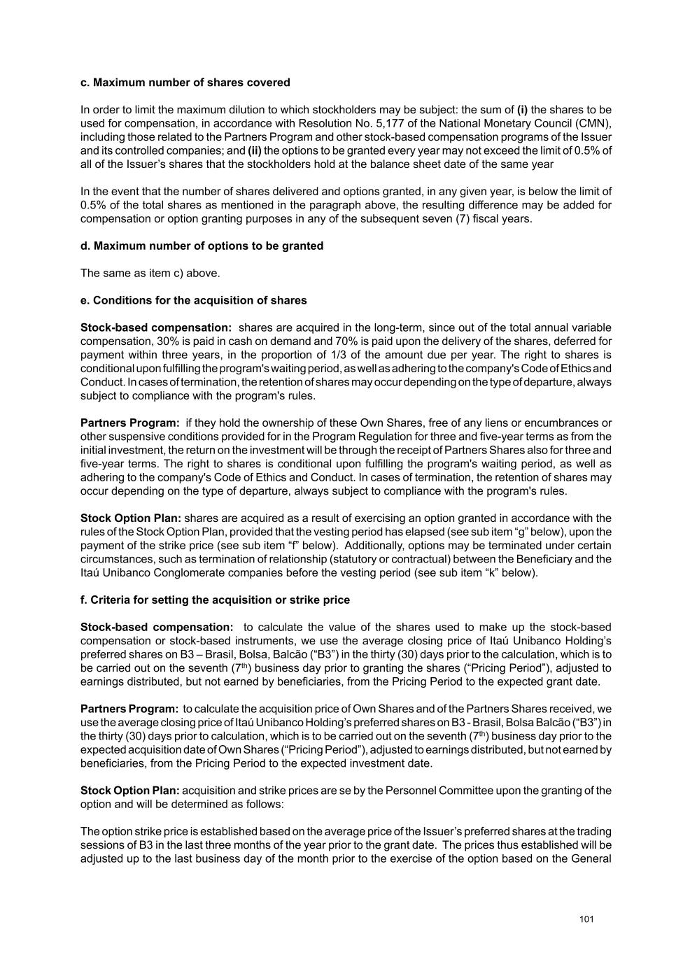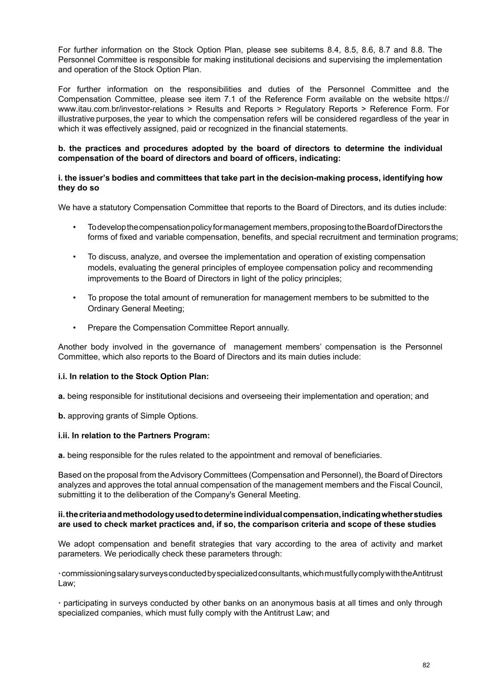 For further information on the Stock Option Plan, please see subitems 8.4, 8.5, 8.6, 8.7 and 8.8. The Personnel Committee is responsible for making institutional decisions and supervising the implementation and operation of the Stock Option Plan. For further information on the responsibilities and duties of the Personnel Committee and the Compensation Committee, please see item 7.1 of the Reference Form available on the website https:// www.itau.com.br/investor-relations > Results and Reports > Regulatory Reports > Reference Form. For illustrative purposes, the year to which the compensation refers will be considered regardless of the year in which it was effectively assigned, paid or recognized in the financial statements. b. the practices and procedures adopted by the board of directors to determine the individual compensation of the board of directors and board of officers, indicating: i. the issuer’s bodies and committees that take part in the decision-making process, identifying how they do so We have a statutory Compensation Committee that reports to the Board of Directors, and its duties include: • To develop the compensation policy for management members, proposing to the Board of Directors the forms of fixed and variable compensation, benefits, and special recruitment and termination programs; • To discuss, analyze, and oversee the implementation and operation of existing compensation models, evaluating the general principles of employee compensation policy and recommending improvements to the Board of Directors in light of the policy principles; • To propose the total amount of remuneration for management members to be submitted to the Ordinary General Meeting; • Prepare the Compensation Committee Report annually. Another body involved in the governance of management members’ compensation is the Personnel Committee, which also reports to the Board of Directors and its main duties include: i.i. In relation to the Stock Option Plan: a. being responsible for institutional decisions and overseeing their implementation and operation; and b. approving grants of Simple Options. i.ii. In relation to the Partners Program: a. being responsible for the rules related to the appointment and removal of beneficiaries. Based on the proposal from the Advisory Committees (Compensation and Personnel), the Board of Directors analyzes and approves the total annual compensation of the management members and the Fiscal Council, submitting it to the deliberation of the Company's General Meeting. ii. the criteria and methodology used to determine individual compensation, indicating whether studies are used to check market practices and, if so, the comparison criteria and scope of these studies We adopt compensation and benefit strategies that vary according to the area of activity and market parameters. We periodically check these parameters through: · commissioning salary surveys conducted by specialized consultants, which must fully comply with the Antitrust Law; · participating in surveys conducted by other banks on an anonymous basis at all times and only through specialized companies, which must fully comply with the Antitrust Law; and 82