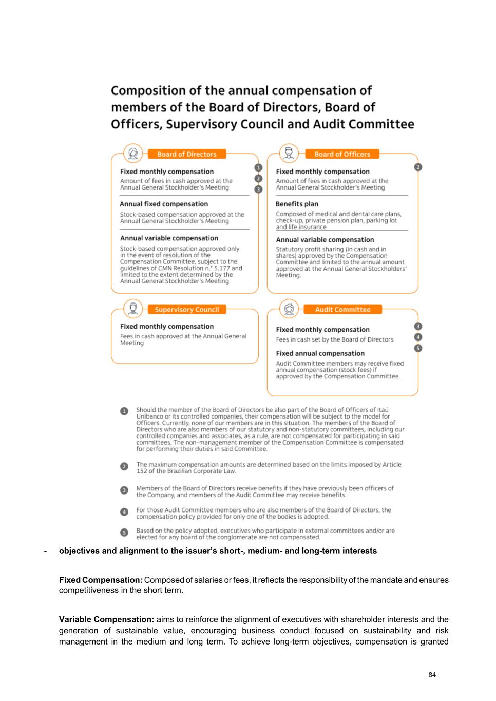 - objectives and alignment to the issuer’s short-, medium- and long-term interests Fixed Compensation: Composed of salaries or fees, it reflects the responsibility of the mandate and ensures competitiveness in the short term. Variable Compensation: aims to reinforce the alignment of executives with shareholder interests and the generation of sustainable value, encouraging business conduct focused on sustainability and risk management in the medium and long term. To achieve long-term objectives, compensation is granted 84