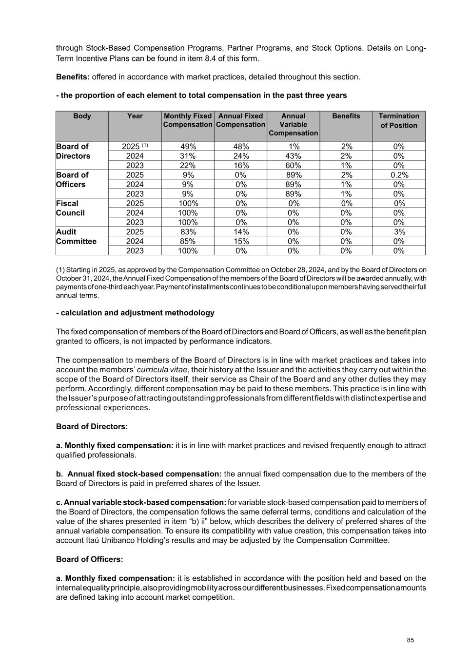 through Stock-Based Compensation Programs, Partner Programs, and Stock Options. Details on Long- Term Incentive Plans can be found in item 8.4 of this form. Benefits: offered in accordance with market practices, detailed throughout this section. - the proportion of each element to total compensation in the past three years Body Year Monthly Fixed Compensation Annual Fixed Compensation Annual Variable Compensation Benefits Termination of Position Board of Directors 2025 (1) 49% 48% 1% 2% 0% 2024 31% 24% 43% 2% 0% 2023 22% 16% 60% 1% 0% Board of Officers 2025 9% 0% 89% 2% 0.2% 2024 9% 0% 89% 1% 0% 2023 9% 0% 89% 1% 0% Fiscal Council 2025 100% 0% 0% 0% 0% 2024 100% 0% 0% 0% 0% 2023 100% 0% 0% 0% 0% Audit Committee 2025 83% 14% 0% 0% 3% 2024 85% 15% 0% 0% 0% 2023 100% 0% 0% 0% 0% (1) Starting in 2025, as approved by the Compensation Committee on October 28, 2024, and by the Board of Directors on October 31, 2024, the Annual Fixed Compensation of the members of the Board of Directors will be awarded annually, with payments of one-third each year. Payment of installments continues to be conditional upon members having served their full annual terms. - calculation and adjustment methodology The fixed compensation of members of the Board of Directors and Board of Officers, as well as the benefit plan granted to officers, is not impacted by performance indicators. The compensation to members of the Board of Directors is in line with market practices and takes into account the members’ curricula vitae, their history at the Issuer and the activities they carry out within the scope of the Board of Directors itself, their service as Chair of the Board and any other duties they may perform. Accordingly, different compensation may be paid to these members. This practice is in line with the Issuer’s purpose of attracting outstanding professionals from different fields with distinct expertise and professional experiences. Board of Directors: a. Monthly fixed compensation: it is in line with market practices and revised frequently enough to attract qualified professionals. b. Annual fixed stock-based compensation: the annual fixed compensation due to the members of the Board of Directors is paid in preferred shares of the Issuer. c. Annual variable stock-based compensation: for variable stock-based compensation paid to members of the Board of Directors, the compensation follows the same deferral terms, conditions and calculation of the value of the shares presented in item “b) ii” below, which describes the delivery of preferred shares of the annual variable compensation. To ensure its compatibility with value creation, this compensation takes into account Itaú Unibanco Holding’s results and may be adjusted by the Compensation Committee. Board of Officers: a. Monthly fixed compensation: it is established in accordance with the position held and based on the internal equality principle, also providing mobility across our different businesses. Fixed compensation amounts are defined taking into account market competition. 85