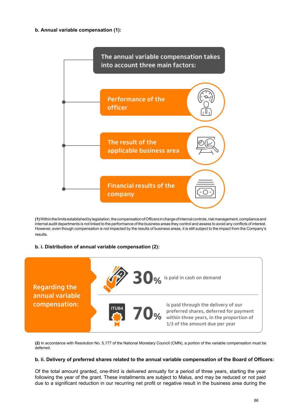 b. Annual variable compensation (1): (1) Within the limits established by legislation, the compensation of Officers in charge of internal controls, risk management, compliance and internal audit departments is not linked to the performance of the business areas they control and assess to avoid any conflicts of interest. However, even though compensation is not impacted by the results of business areas, it is still subject to the impact from the Company’s results. b. i. Distribution of annual variable compensation (2): (2) In accordance with Resolution No. 5,177 of the National Monetary Council (CMN), a portion of the variable compensation must be deferred. b. ii. Delivery of preferred shares related to the annual variable compensation of the Board of Officers: Of the total amount granted, one-third is delivered annually for a period of three years, starting the year following the year of the grant. These installments are subject to Malus, and may be reduced or not paid due to a significant reduction in our recurring net profit or negative result in the business area during the 86