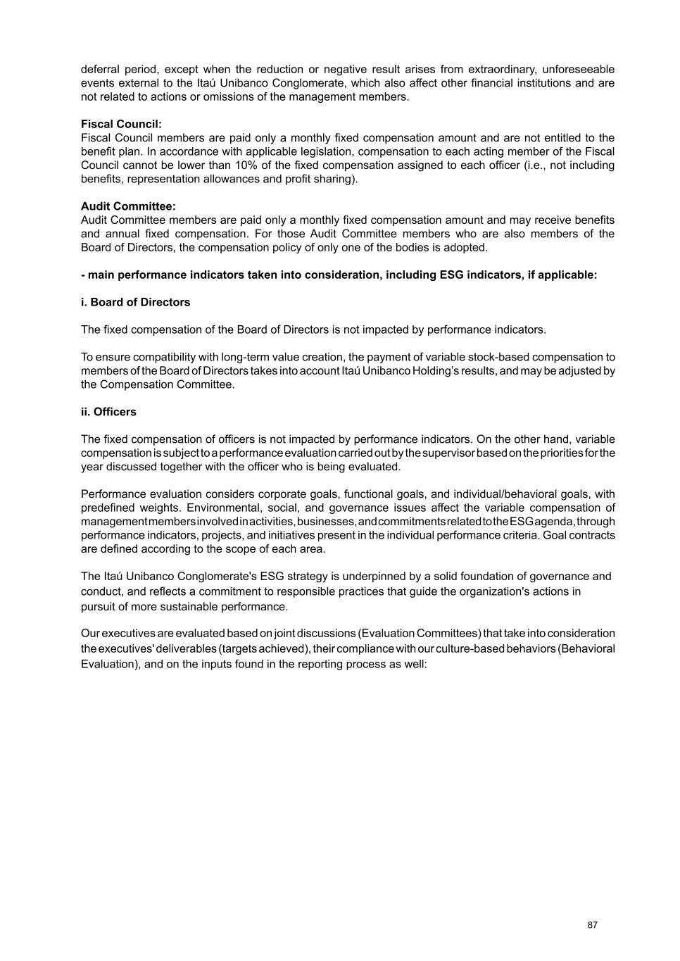 deferral period, except when the reduction or negative result arises from extraordinary, unforeseeable events external to the Itaú Unibanco Conglomerate, which also affect other financial institutions and are not related to actions or omissions of the management members. Fiscal Council: Fiscal Council members are paid only a monthly fixed compensation amount and are not entitled to the benefit plan. In accordance with applicable legislation, compensation to each acting member of the Fiscal Council cannot be lower than 10% of the fixed compensation assigned to each officer (i.e., not including benefits, representation allowances and profit sharing). Audit Committee: Audit Committee members are paid only a monthly fixed compensation amount and may receive benefits and annual fixed compensation. For those Audit Committee members who are also members of the Board of Directors, the compensation policy of only one of the bodies is adopted. - main performance indicators taken into consideration, including ESG indicators, if applicable: i. Board of Directors The fixed compensation of the Board of Directors is not impacted by performance indicators. To ensure compatibility with long-term value creation, the payment of variable stock-based compensation to members of the Board of Directors takes into account Itaú Unibanco Holding’s results, and may be adjusted by the Compensation Committee. ii. Officers The fixed compensation of officers is not impacted by performance indicators. On the other hand, variable compensation is subject to a performance evaluation carried out by the supervisor based on the priorities for the year discussed together with the officer who is being evaluated. Performance evaluation considers corporate goals, functional goals, and individual/behavioral goals, with predefined weights. Environmental, social, and governance issues affect the variable compensation of management members involved in activities, businesses, and commitments related to the ESG agenda, through performance indicators, projects, and initiatives present in the individual performance criteria. Goal contracts are defined according to the scope of each area. The Itaú Unibanco Conglomerate's ESG strategy is underpinned by a solid foundation of governance and conduct, and reflects a commitment to responsible practices that guide the organization's actions in pursuit of more sustainable performance. Our executives are evaluated based on joint discussions (Evaluation Committees) that take into consideration the executives' deliverables (targets achieved), their compliance with our culture-based behaviors (Behavioral Evaluation), and on the inputs found in the reporting process as well: 87