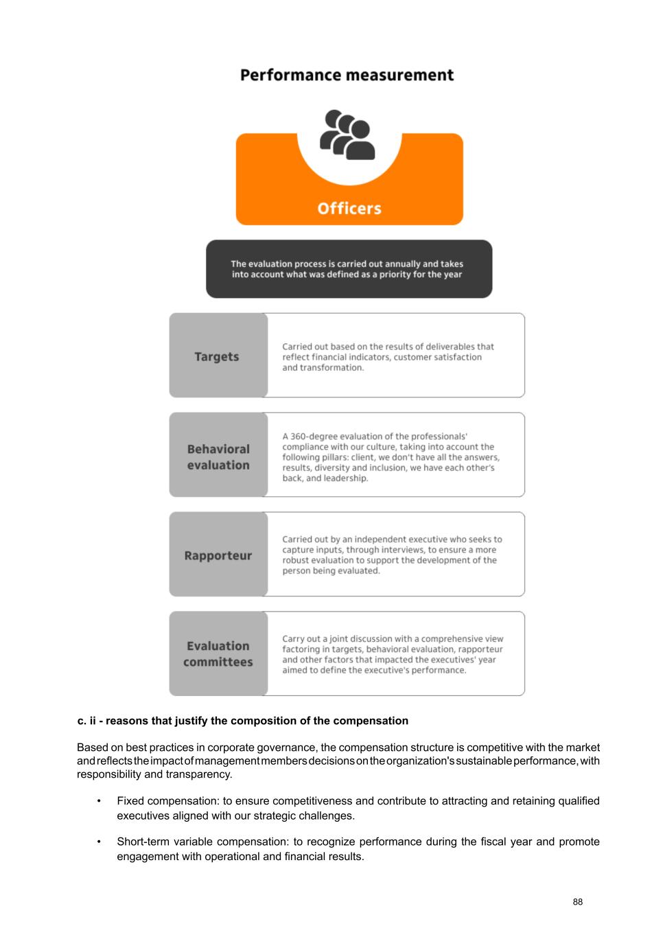 c. ii - reasons that justify the composition of the compensation Based on best practices in corporate governance, the compensation structure is competitive with the market and reflects the impact of management members decisions on the organization's sustainable performance, with responsibility and transparency. • Fixed compensation: to ensure competitiveness and contribute to attracting and retaining qualified executives aligned with our strategic challenges. • Short-term variable compensation: to recognize performance during the fiscal year and promote engagement with operational and financial results. 88