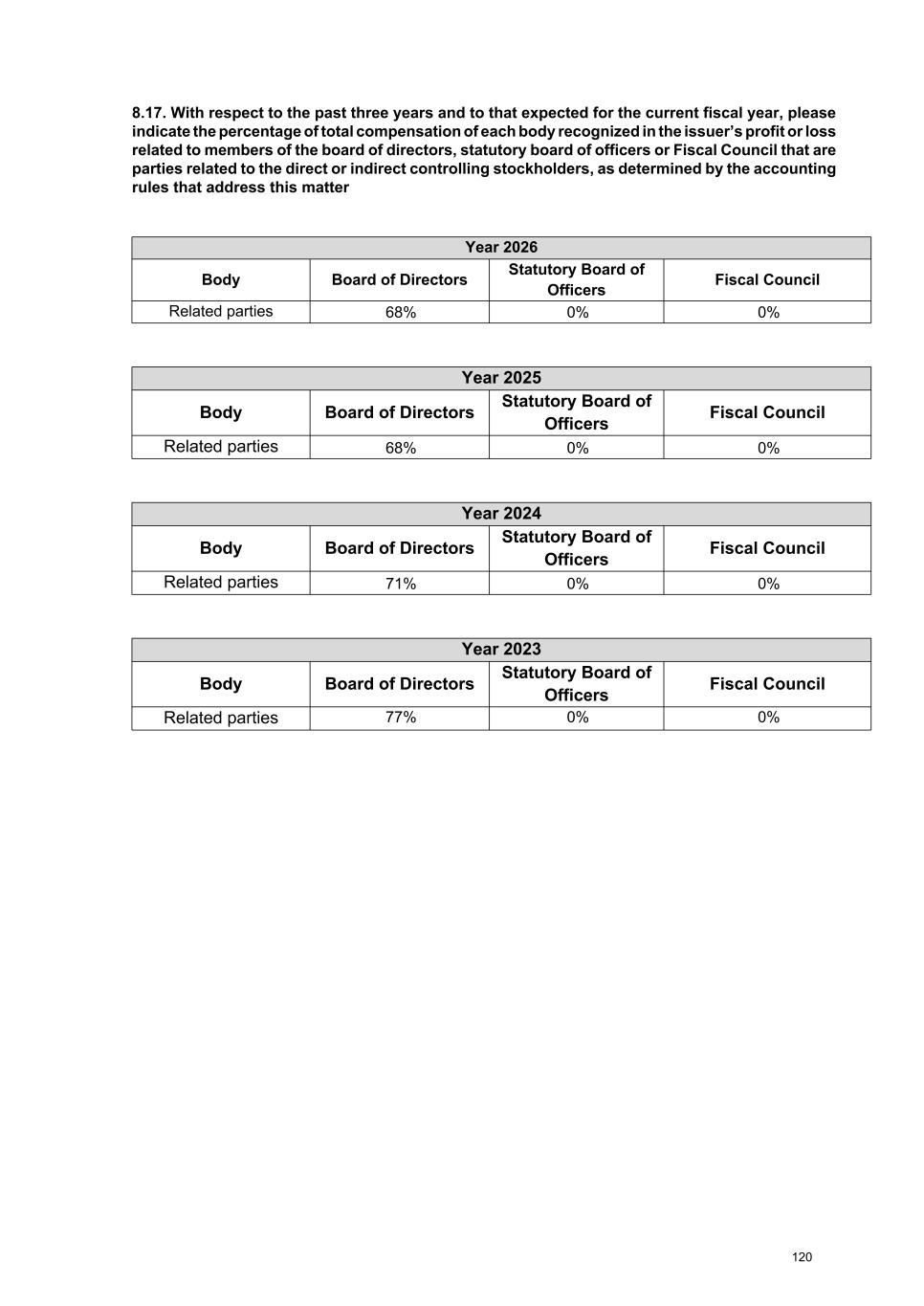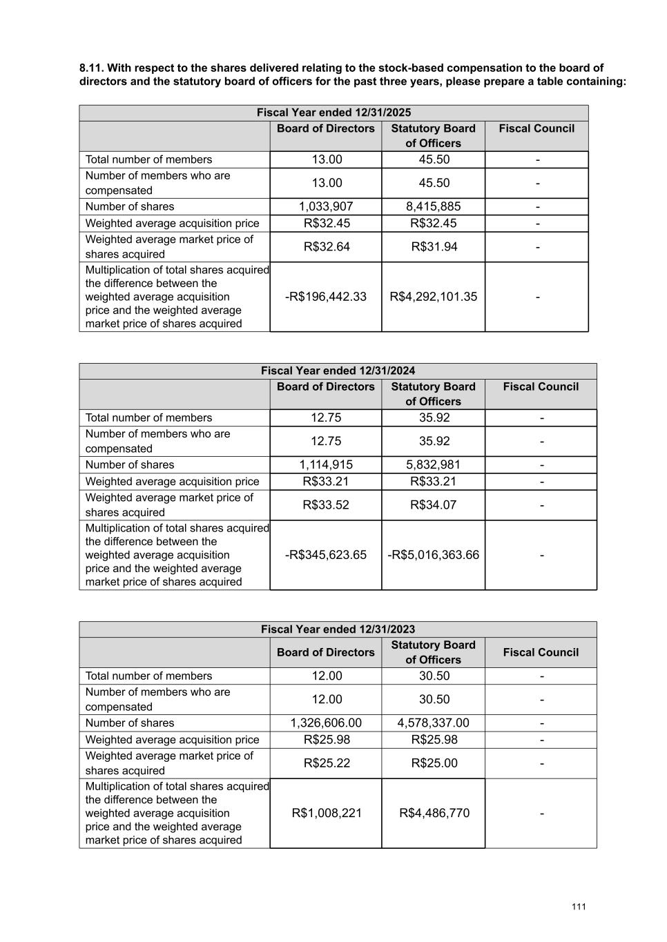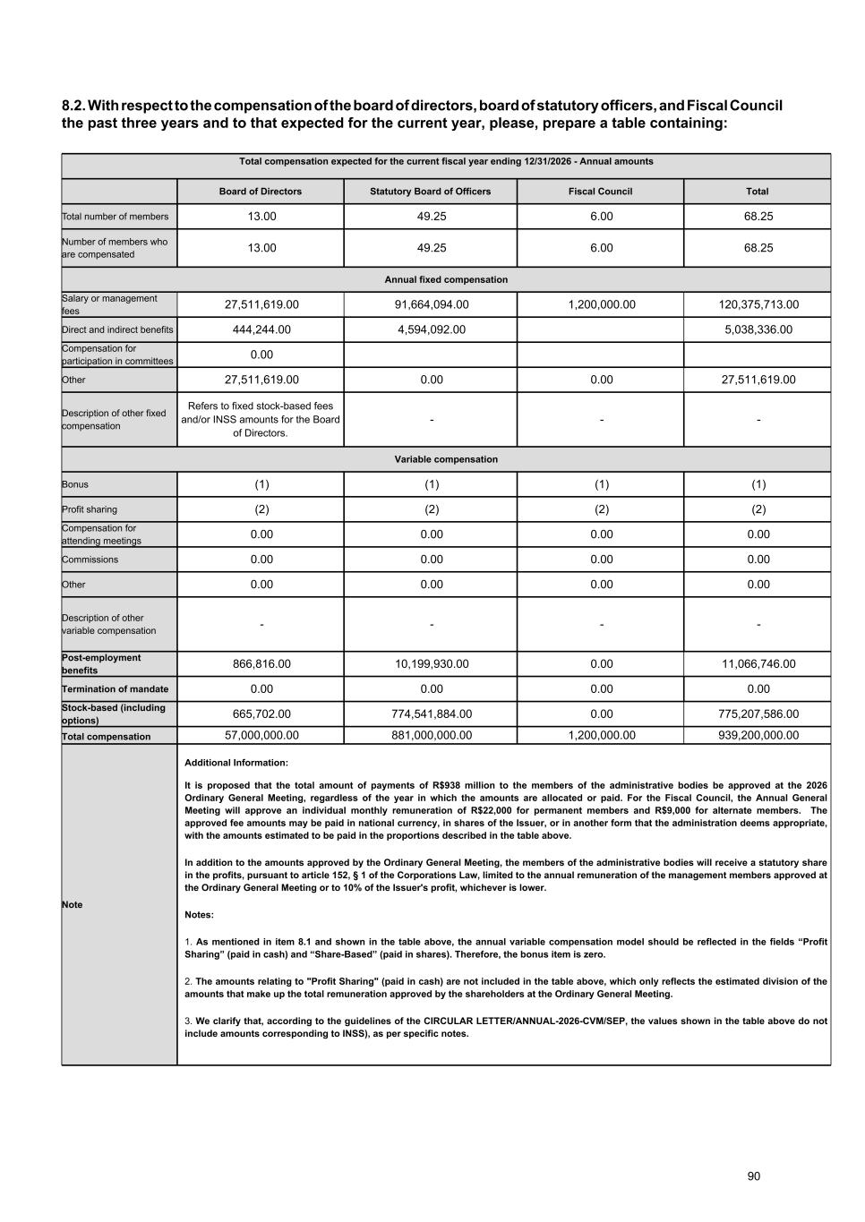 8.2. With respect to the compensation of the board of directors, board of statutory officers, and Fiscal Council the past three years and to that expected for the current year, please, prepare a table containing: Total compensation expected for the current fiscal year ending 12/31/2026 - Annual amounts Board of Directors Statutory Board of Officers Fiscal Council Total Total number of members 13.00 49.25 6.00 68.25 Number of members who are compensated 13.00 49.25 6.00 68.25 Annual fixed compensation Salary or management fees 27,511,619.00 91,664,094.00 1,200,000.00 120,375,713.00 Direct and indirect benefits 444,244.00 4,594,092.00 5,038,336.00 Compensation for participation in committees 0.00 Other 27,511,619.00 0.00 0.00 27,511,619.00 Description of other fixed compensation Refers to fixed stock-based fees and/or INSS amounts for the Board of Directors. - - - Variable compensation Bonus (1) (1) (1) (1) Profit sharing (2) (2) (2) (2) Compensation for attending meetings 0.00 0.00 0.00 0.00 Commissions 0.00 0.00 0.00 0.00 Other 0.00 0.00 0.00 0.00 Description of other variable compensation - - - - Post-employment benefits 866,816.00 10,199,930.00 0.00 11,066,746.00 Termination of mandate 0.00 0.00 0.00 0.00 Stock-based (including options) 665,702.00 774,541,884.00 0.00 775,207,586.00 Total compensation 57,000,000.00 881,000,000.00 1,200,000.00 939,200,000.00 Note Additional Information: It is proposed that the total amount of payments of R$938 million to the members of the administrative bodies be approved at the 2026 Ordinary General Meeting, regardless of the year in which the amounts are allocated or paid. For the Fiscal Council, the Annual General Meeting will approve an individual monthly remuneration of R$22,000 for permanent members and R$9,000 for alternate members. The approved fee amounts may be paid in national currency, in shares of the Issuer, or in another form that the administration deems appropriate, with the amounts estimated to be paid in the proportions described in the table above. In addition to the amounts approved by the Ordinary General Meeting, the members of the administrative bodies will receive a statutory share in the profits, pursuant to article 152, § 1 of the Corporations Law, limited to the annual remuneration of the management members approved at the Ordinary General Meeting or to 10% of the Issuer's profit, whichever is lower. Notes: 1. As mentioned in item 8.1 and shown in the table above, the annual variable compensation model should be reflected in the fields “Profit Sharing” (paid in cash) and “Share-Based” (paid in shares). Therefore, the bonus item is zero. 2. The amounts relating to "Profit Sharing" (paid in cash) are not included in the table above, which only reflects the estimated division of the amounts that make up the total remuneration approved by the shareholders at the Ordinary General Meeting. 3. We clarify that, according to the guidelines of the CIRCULAR LETTER/ANNUAL-2026-CVM/SEP, the values shown in the table above do not include amounts corresponding to INSS), as per specific notes. 90