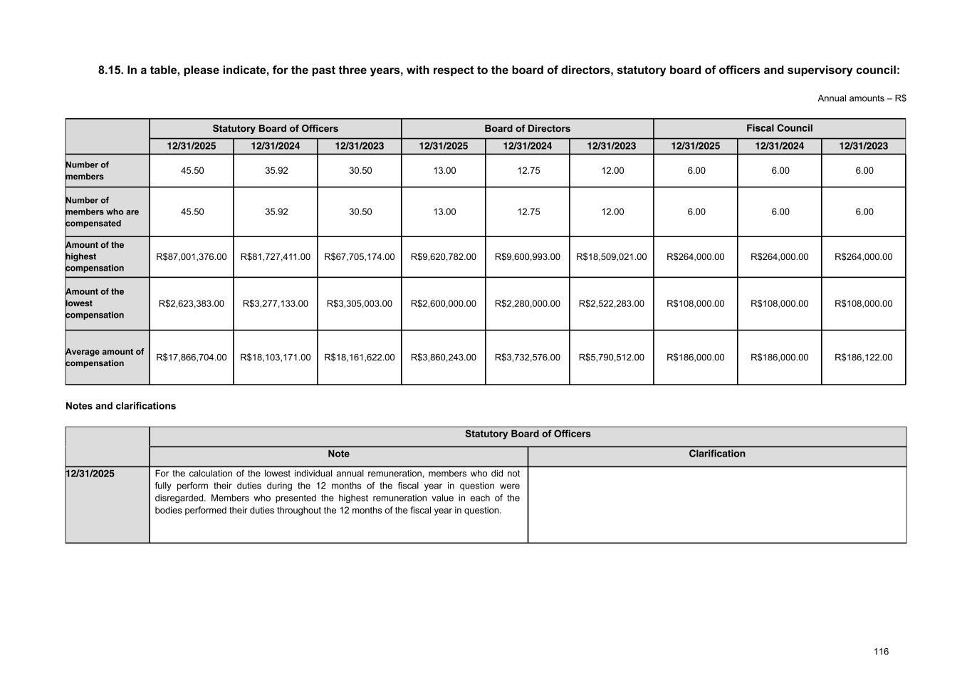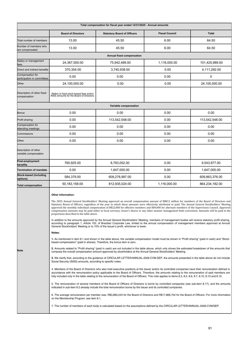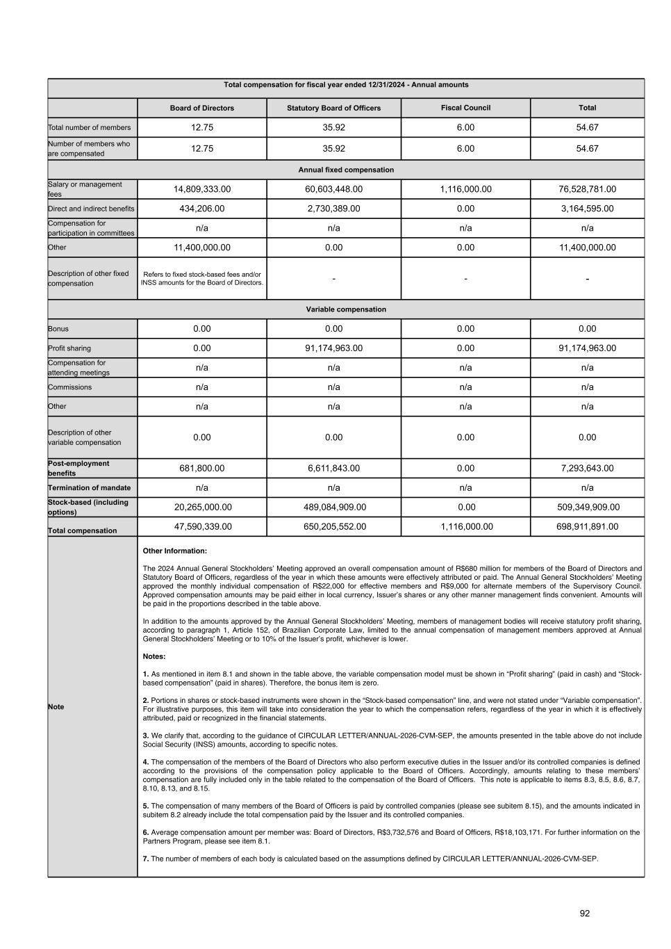 Total compensation for fiscal year ended 12/31/2025 - Annual amounts Board of Directors Statutory Board of Officers Fiscal Council Total Total number of members 13.00 45.50 6.00 64.50 Number of members who are compensated 13.00 45.50 6.00 64.50 Annual fixed compensation Salary or management fees 24,367,500.00 75,942,489.00 1,116,000.00 101,425,989.00 Direct and indirect benefits 370,354.00 3,740,938.00 0.00 4,111,292.00 Compensation for participation in committees 0.00 0.00 0.00 0 Other 24,100,000.00 0.00 0.00 24,100,000.00 Description of other fixed compensation Refers to fixed stock-based fees and/or INSS amounts for the Board of Directors. Variable compensation Bonus 0.00 0.00 0.00 0.00 Profit sharing 0.00 113,542,548.00 0.00 113,542,548.00 Compensation for attending meetings 0.00 0.00 0.00 0.00 Commissions 0.00 0.00 0.00 0.00 Other 0.00 0.00 0.00 0.00 Description of other variable compensation Post-employment benefits 760,925.00 8,783,052.00 0.00 9,543,977.00 Termination of mandate 0.00 1,647,000.00 0.00 1,647,000.00 Stock-based (including options) 584,379.00 609,278,997.00 0.00 609,863,376.00 Total compensation 50,183,158.00 812,935,024.00 1,116,000.00 864,234,182.00 Note Other Information: The 2025 Annual General Stockholders’ Meeting approved an overall compensation amount of R$812 million for members of the Board of Directors and Statutory Board of Officers, regardless of the year in which these amounts were effectively attributed or paid. The Annual General Stockholders’ Meeting approved the monthly individual compensation of R$22,000 for effective members and R$9,000 for alternate members of the Supervisory Council. Approved compensation amounts may be paid either in local currency, Issuer’s shares or any other manner management finds convenient. Amounts will be paid in the proportions described in the table above. In addition to the amounts approved by the Annual General Stockholders’ Meeting, members of management bodies will receive statutory profit sharing, according to paragraph 1, Article 152, of Brazilian Corporate Law, limited to the annual compensation of management members approved at Annual General Stockholders’ Meeting or to 10% of the Issuer’s profit, whichever is lower. Notes: 1. As mentioned in item 8.1 and shown in the table above, the variable compensation model must be shown in “Profit sharing” (paid in cash) and “Stock- based compensation” (paid in shares). Therefore, the bonus item is zero. 2. Amounts related to “Profit sharing” (paid in cash) are not included in the table above, which only shows the estimated breakdown of the amounts that compose the overall compensation amount approved by stockholders at the Annual General Stockholders’ Meeting. 3. We clarify that, according to the guidance of CIRCULAR LETTER/ANNUAL-2026-CVM-SEP, the amounts presented in the table above do not include Social Security (INSS) amounts, according to specific notes. 4. Members of the Board of Directors who also hold executive positions at the Issuer and/or its controlled companies have their remuneration defined in accordance with the remuneration policy applicable to the Board of Officers. Therefore, the amounts relating to the remuneration of said members are fully included only in the table relating to the remuneration of the Board of Officers. This note applies to items 8.3, 8.5, 8.6, 8.7, 8.10, 8.13 and 8.15. 5. The remuneration of several members of the Board of Officers of Directors is borne by controlled companies (see sub-item 8.17), and the amounts indicated in sub-item 8.2 already include the total remuneration borne by the Issuer and its controlled companies. 6. The average remuneration per member was: R$3,860,243 for the Board of Directors and R$17,866,704 for the Board of Officers. For more information on the Membership Program, see item 8.1. 7. The number of members of each body is calculated based on the assumptions defined by the CIRCULAR LETTER/ANNUAL-2026-CVM/SEP. 91