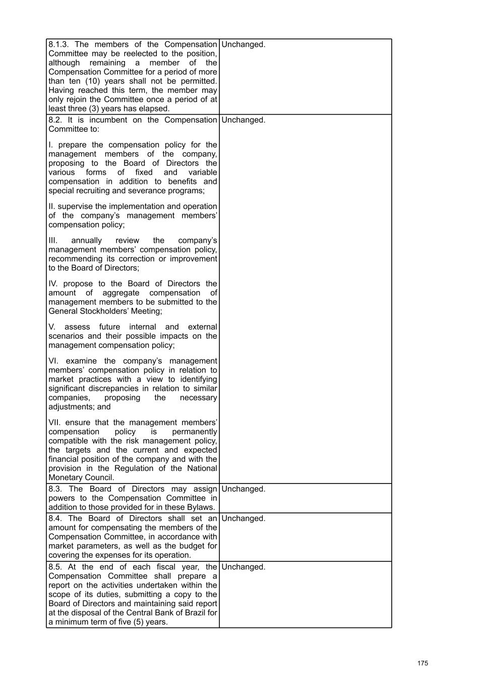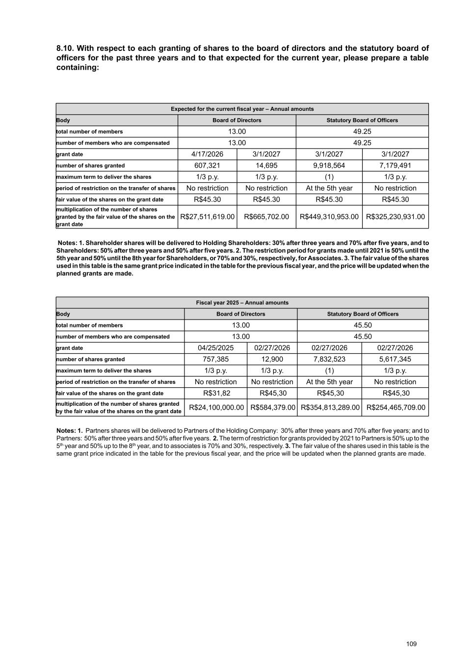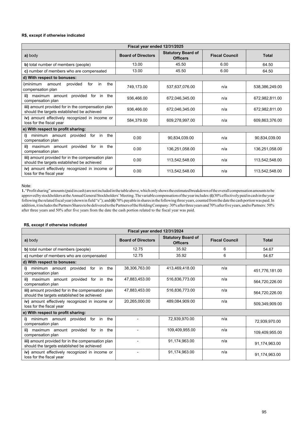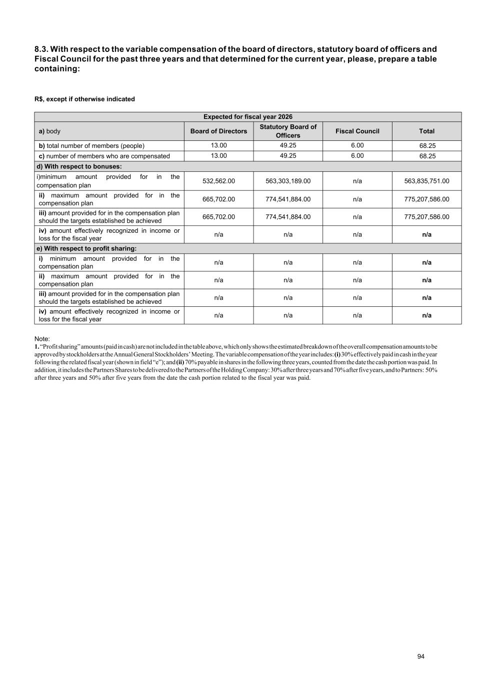 8.3. With respect to the variable compensation of the board of directors, statutory board of officers and Fiscal Council for the past three years and that determined for the current year, please, prepare a table containing: R$, except if otherwise indicated Expected for fiscal year 2026 a) body Board of Directors Statutory Board of Officers Fiscal Council Total b) total number of members (people) 13.00 49.25 6.00 68.25 c) number of members who are compensated 13.00 49.25 6.00 68.25 d) With respect to bonuses: i)minimum amount provided for in the compensation plan 532,562.00 563,303,189.00 n/a 563,835,751.00 ii) maximum amount provided for in the compensation plan 665,702.00 774,541,884.00 n/a 775,207,586.00 iii) amount provided for in the compensation plan should the targets established be achieved 665,702.00 774,541,884.00 n/a 775,207,586.00 iv) amount effectively recognized in income or loss for the fiscal year n/a n/a n/a n/a e) With respect to profit sharing: i) minimum amount provided for in the compensation plan n/a n/a n/a n/a ii) maximum amount provided for in the compensation plan n/a n/a n/a n/a iii) amount provided for in the compensation plan should the targets established be achieved n/a n/a n/a n/a iv) amount effectively recognized in income or loss for the fiscal year n/a n/a n/a n/a Note: 1. “Profit sharing” amounts (paid in cash) are not included in the table above, which only shows the estimated breakdown of the overall compensation amounts to be approved by stockholders at the Annual General Stockholders’ Meeting. The variable compensation of the year includes: (i) 30% effectively paid in cash in the year following the related fiscal year (shown in field “e”); and (ii) 70% payable in shares in the following three years, counted from the date the cash portion was paid. In addition, it includes the Partners Shares to be delivered to the Partners of the Holding Company: 30% after three years and 70% after five years, and to Partners: 50% after three years and 50% after five years from the date the cash portion related to the fiscal year was paid. 94