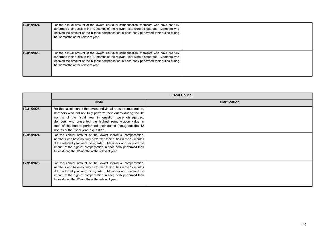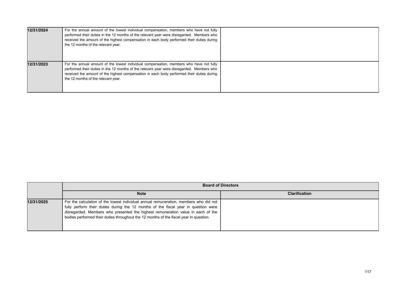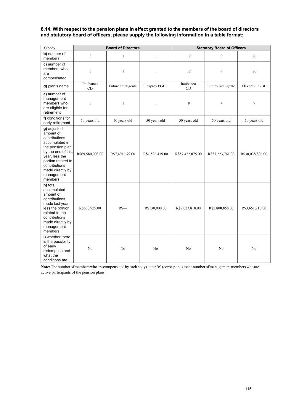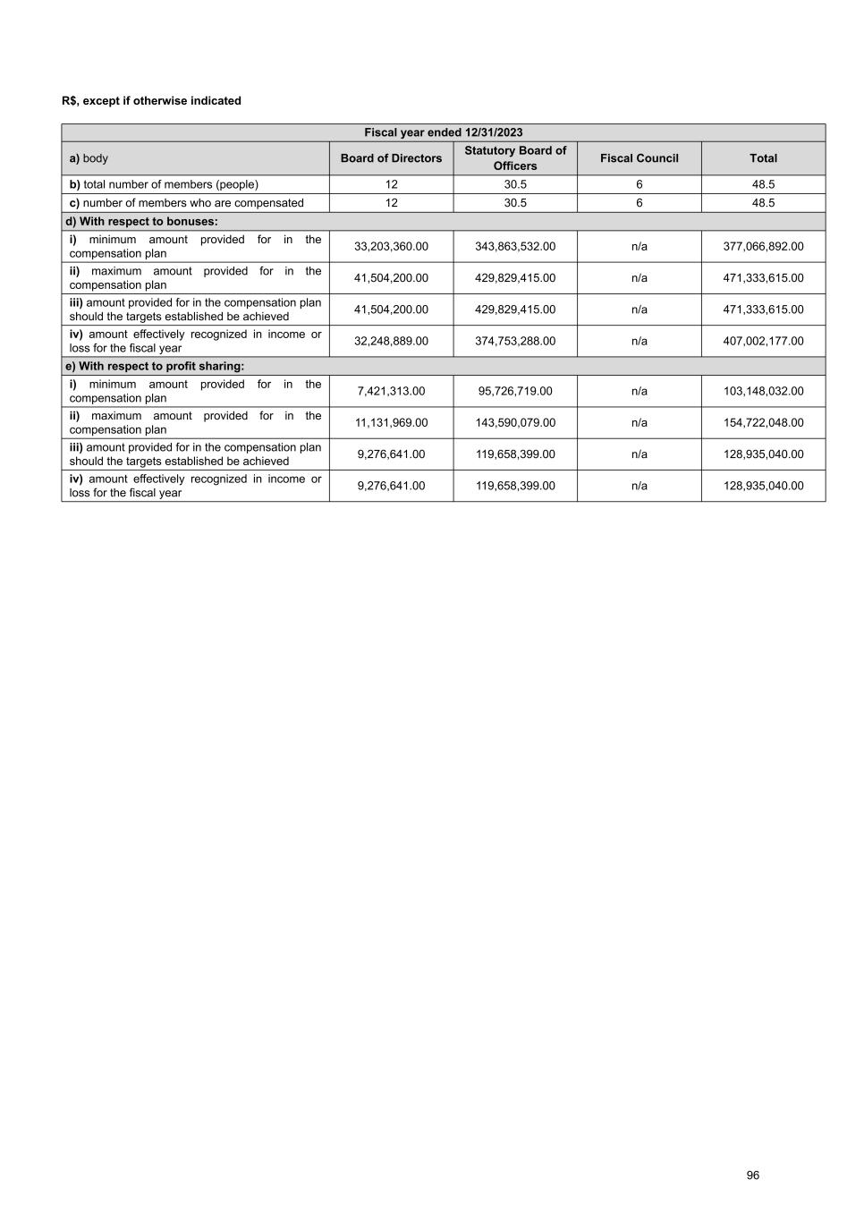 R$, except if otherwise indicated Fiscal year ended 12/31/2023 a) body Board of Directors Statutory Board of Officers Fiscal Council Total b) total number of members (people) 12 30.5 6 48.5 c) number of members who are compensated 12 30.5 6 48.5 d) With respect to bonuses: i) minimum amount provided for in the compensation plan 33,203,360.00 343,863,532.00 n/a 377,066,892.00 ii) maximum amount provided for in the compensation plan 41,504,200.00 429,829,415.00 n/a 471,333,615.00 iii) amount provided for in the compensation plan should the targets established be achieved 41,504,200.00 429,829,415.00 n/a 471,333,615.00 iv) amount effectively recognized in income or loss for the fiscal year 32,248,889.00 374,753,288.00 n/a 407,002,177.00 e) With respect to profit sharing: i) minimum amount provided for in the compensation plan 7,421,313.00 95,726,719.00 n/a 103,148,032.00 ii) maximum amount provided for in the compensation plan 11,131,969.00 143,590,079.00 n/a 154,722,048.00 iii) amount provided for in the compensation plan should the targets established be achieved 9,276,641.00 119,658,399.00 n/a 128,935,040.00 iv) amount effectively recognized in income or loss for the fiscal year 9,276,641.00 119,658,399.00 n/a 128,935,040.00 96