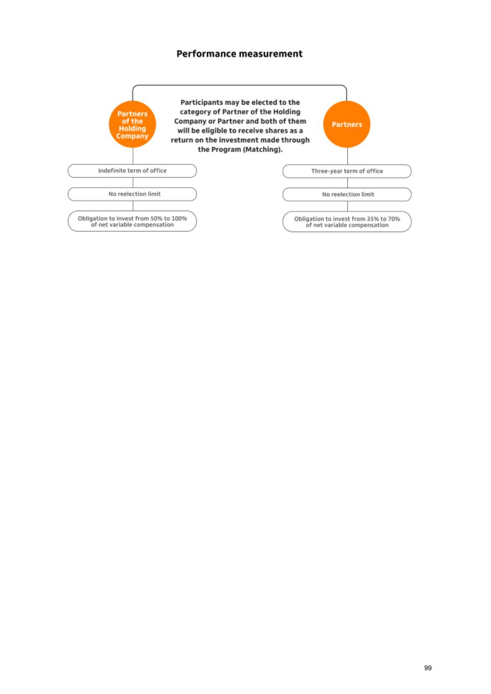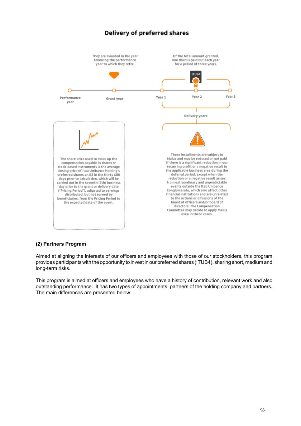 (2) Partners Program Aimed at aligning the interests of our officers and employees with those of our stockholders, this program provides participants with the opportunity to invest in our preferred shares (ITUB4), sharing short, medium and long-term risks. This program is aimed at officers and employees who have a history of contribution, relevant work and also outstanding performance. It has two types of appointments: partners of the holding company and partners. The main differences are presented below: 98
