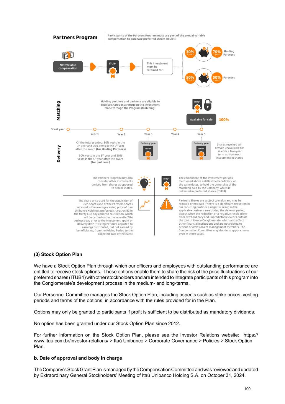 (3) Stock Option Plan We have a Stock Option Plan through which our officers and employees with outstanding performance are entitled to receive stock options. These options enable them to share the risk of the price fluctuations of our preferred shares (ITUB4) with other stockholders and are intended to integrate participants of this program into the Conglomerate’s development process in the medium- and long-terms. Our Personnel Committee manages the Stock Option Plan, including aspects such as strike prices, vesting periods and terms of the options, in accordance with the rules provided for in the Plan. Options may only be granted to participants if profit is sufficient to be distributed as mandatory dividends. No option has been granted under our Stock Option Plan since 2012. For further information on the Stock Option Plan, please see the Investor Relations website: https:// www.itau.com.br/investor-relations/ > Itaú Unibanco > Corporate Governance > Policies > Stock Option Plan. b. Date of approval and body in charge The Company’s Stock Grant Plan is managed by the Compensation Committee and was reviewed and updated by Extraordinary General Stockholders’ Meeting of Itaú Unibanco Holding S.A. on October 31, 2024. 100