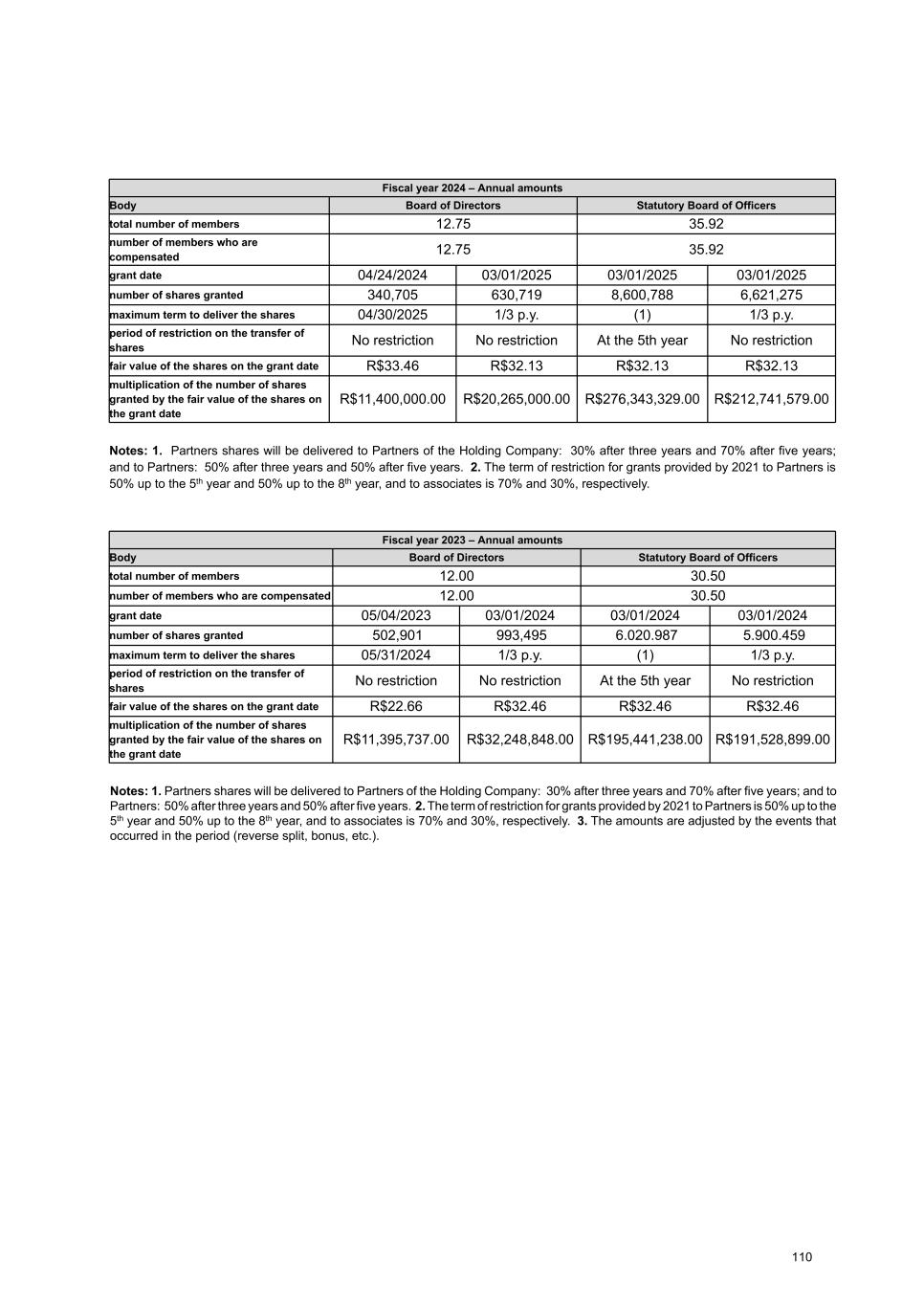 Total compensation for fiscal year ended 12/31/2023 - Annual amounts Board of Directors Statutory Board of Officers Fiscal Council Total Total number of members 12.00 30.50 6.00 48.50 Number of members who are compensated 12.00 30.50 6.00 48.50 Annual fixed compensation Salary or management fees 15,572,500.00 51,888,881.00 1,116,733.00 68,578,114.00 Direct and indirect benefits 382,757.00 2,088,919.00 0.00 2,471,676.00 Compensation for participation in committees 0.00 0.00 0.00 0.00 Other 11,400,000.00 0.00 0.00 11,400,000.00 Description of other fixed compensation Refers to fixed stock-based fees and/or INSS amounts for the Board of Directors. - - - Variable compensation Bonus 0.00 0.00 0.00 0.00 Profit sharing 9,276,641.00 119,658,399.00 0.00 128,935,040.00 Compensation for attending meetings - - - - Commissions - - - - Other - - - - Description of other variable compensation - - - - Post-employment benefits 605,362.00 5,539,971.00 0.00 6,145,333.00 Termination of mandate 0.00 0.00 0.00 0.00 Stock-based (including options) 32,248,889.00 374,753,288.00 0.00 407,002,177.00 Total compensation 69,486,149.00 553,929,458.00 1,116,733.00 624,532,340.00 Note Other Information: The 2023 Annual General Stockholders’ Meeting approved an overall compensation amount of R$570 million for members of the Board of Directors and Statutory Board of Officers, regardless of the year in which these amounts were effectively attributed or paid. The Annual General Stockholders’ Meeting approved the monthly individual compensation of R$22,000 for effective members and R$9,000 for alternate members of the Supervisory Council. Approved compensation amounts may be paid either in local currency, Issuer’s shares or any other manner management finds convenient. Amounts will be paid in the proportions described in the table above. In addition to the amounts approved by the Annual General Stockholders’ Meeting, members of management bodies will receive statutory profit sharing, according to paragraph 1, Article 152, of Brazilian Corporate Law, limited to the annual compensation of management members approved at Annual General Stockholders’ Meeting or to 10% of the Issuer’s profit, whichever is lower. Notes: 1. As mentioned in item 8.1 and shown in the table above, the variable compensation model must be shown in “Profit sharing” (paid in cash) and “Stock- based compensation” (paid in shares). Therefore, the bonus item is zero. 2. Portions in shares or stock-based instruments were shown in the “Stock-based compensation” line and were not stated under “Variable compensation”. For illustrative purposes, this item will take into consideration the year to which the compensation refers, regardless of the year in which it is effectively attributed, paid or recognized in the financial statements. 3. We clarify that, according to the guidance of CIRCULAR LETTER/ANNUAL-2026-CVM-SEP, the amounts presented in the table above do not include Social Security (INSS) amounts, according to specific notes. 4. The compensation of the members of the Board of Directors who also perform executive duties in the Issuer and/or its controlled companies is defined according to the provisions of the compensation policy applicable to the Board of Officers. Accordingly, amounts relating to these members’ compensation are fully included only in the table related to the compensation of the Board of Officers. This note is applicable to items 8.3, 8.5, 8.6, 8.7, 8.10, 8.13, and 8.15. 5. The compensation of many members of the Board of Officers is paid by controlled companies (please see subitem 8.15), and the amounts indicated in subitem 8.2 already include the total compensation paid by the Issuer and its controlled companies. 6. Average compensation amount per member was: Board of Directors, R$5,790,512 and Board of Officers, R$18,161,622. For further information on the Partners Program, please see item 8.1. 7. The number of members of each body is calculated based on the assumptions defined by CIRCULAR LETTER/ANNUAL-2026-CVM-SEP. 93
