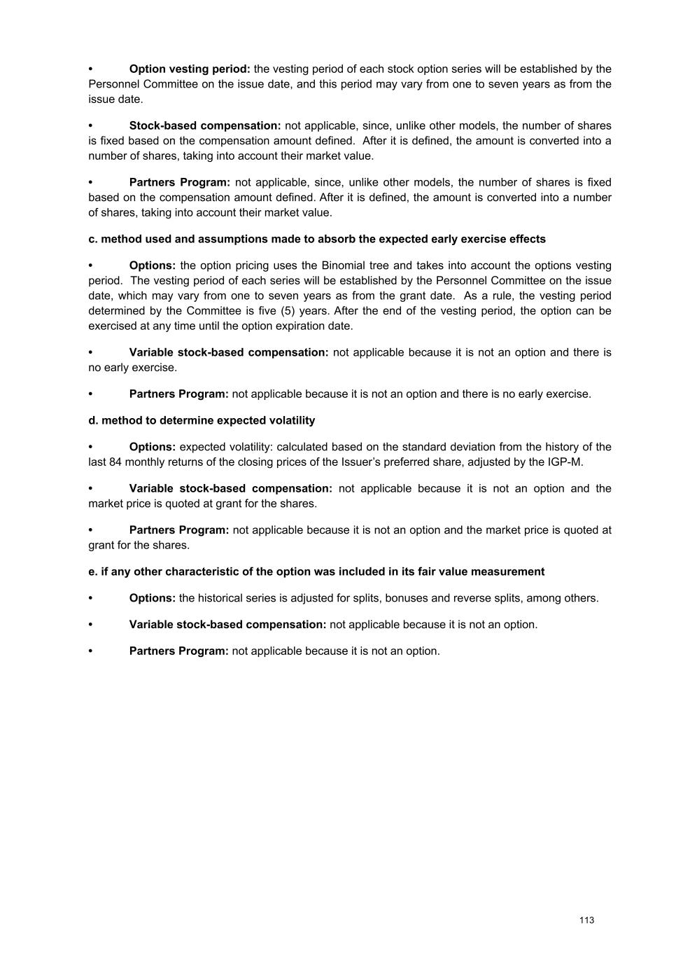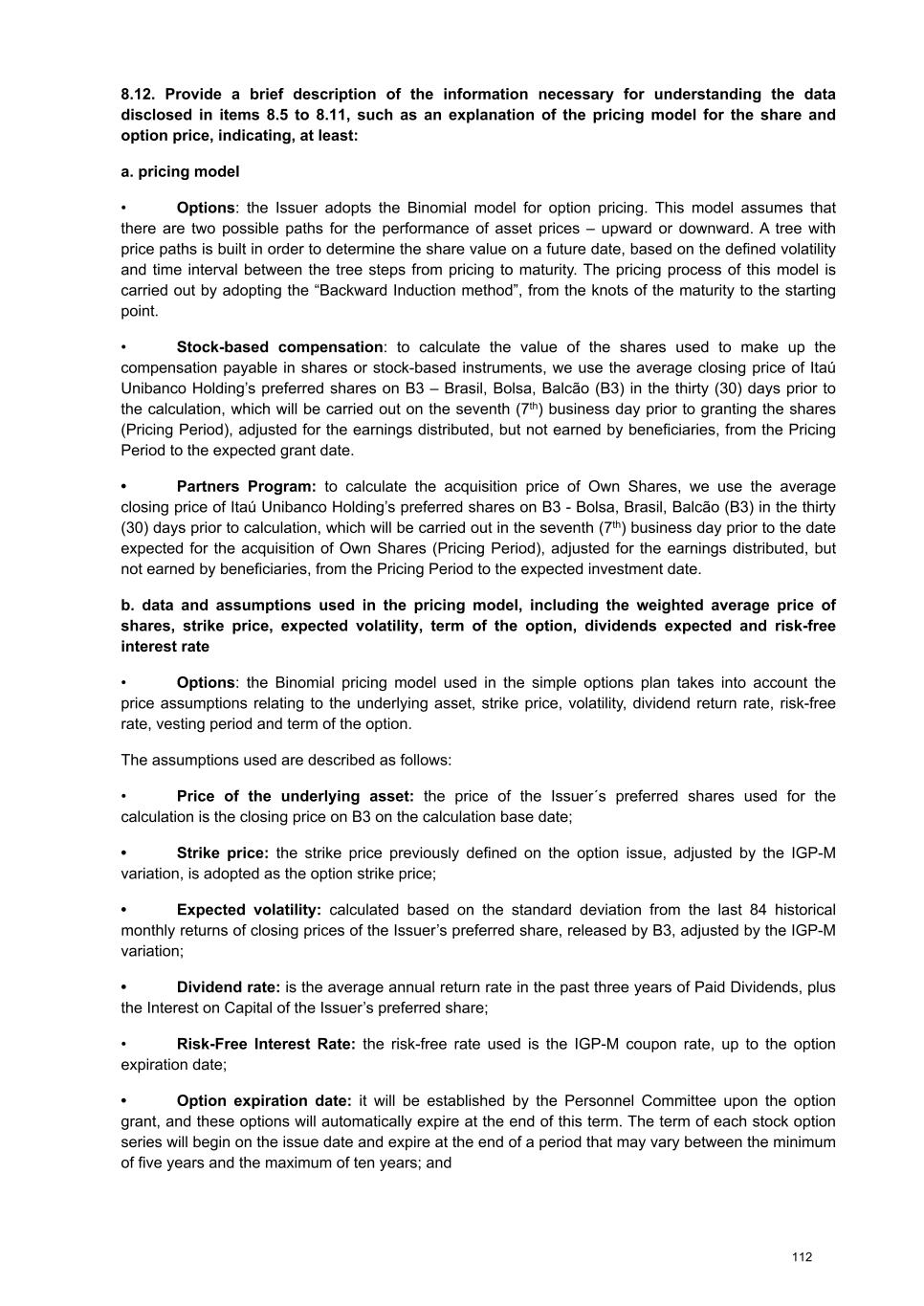 8.4. With respect to the stock-based compensation plan for the board of directors and statutory board of officers in effect last fiscal year and expected for the current year, please describe: a. General terms and conditions Clarifications– how to disclose the information For illustrative purposes, in this item we provide information about all stock-based compensation models, as follows: (1) shares or stock-based instruments delivered under the Compensation Policy; (2) shares or stock- based instruments delivered under the Partners Program; and (3) options granted under the Stock Option Granting Plan (“Stock Option Plan”), as described below: (1) Compensation Policy – stock-based compensation Annual fixed stock-based compensation: This compensation is paid to the members of the Board of Directors, provided they have fully completed their terms of office. The purpose is to reward the contribution made by each member to the Itaú Unibanco Conglomerate. The annual fixed compensation takes into account the history and curriculum vitae of members, in addition to market conditions and other factors that may be agreed upon between the members of the Board of Directors and the Itaú Unibanco Conglomerate. To calculate the value of the shares used to make up the stock-based compensation or stock-based instruments, we use the average closing price of Itaú Unibanco Holding’s preferred shares on B3 – Brasil, Bolsa, Balcão (“B3”) in the thirty (30) days prior to the calculation, which is to be carried out on the seventh (7th) business day prior to granting the shares (“Pricing Period”), adjusted to earnings distributed, but not earned by beneficiaries, from the Pricing Period to the expected grant date. Until 2024 the number of shares used to be calculated and granted every three years, and these shares were delivered proportionally to the number of terms of office completed in the period. Beginning in 2025, as approved by the Compensation Committee on October 28, 2024 and the Board of Directors on October 31, 2024, the Annual Fixed Compensation of the members of the Board of Directors will be granted on an annual basis, with payments of one third each year. The installments will continue to be paid subject to the full completion of the annual terms of office by members. Annual variable stock-based compensation: 97