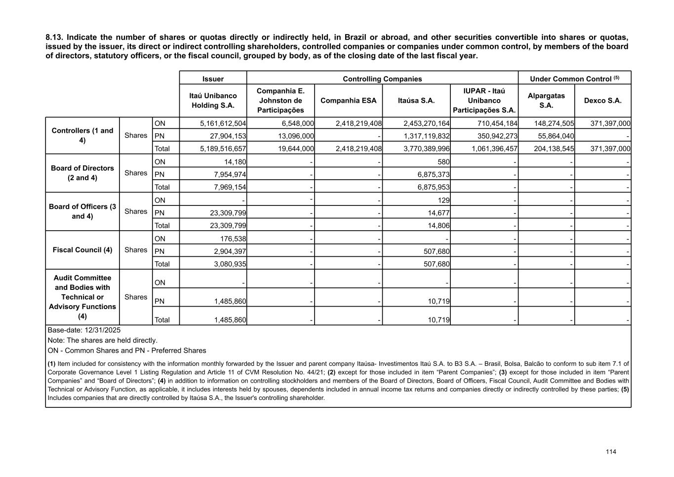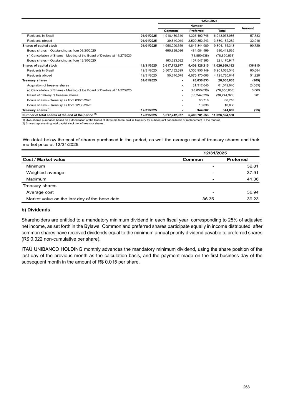 01/01/2025 12/31/2025 01/01/2025 Number Amount Common Preferred Total Residents in Brazil 01/01/2025 4,918,480,340 1,325,492,746 6,243,973,086 57,783 Residents abroad 01/01/2025 39,810,019 3,520,352,243 3,560,162,262 32,946 Shares of capital stock 01/01/2025 4,958,290,359 4,845,844,989 9,804,135,348 90,729 Bonus shares – Outstanding as from 03/20/2025 495,829,036 484,584,499 980,413,535 (-) Cancellation of Shares - Meeting of the Board of Diretors at 11/27/2025 - (78,850,638) (78,850,638) Bonus shares – Outstanding as from 12/30/2025 163,623,582 157,547,365 321,170,947 Shares of capital stock 12/31/2025 5,617,742,977 5,409,126,215 11,026,869,192 136,910 Residents in Brazil 12/31/2025 5,567,132,399 1,333,956,149 6,901,088,548 85,684 Residents abroad 12/31/2025 50,610,578 4,075,170,066 4,125,780,644 51,226 Treasury shares (1) 01/01/2025 - 28,030,833 28,030,833 (909) Acquisition of treasury shares - 81,312,040 81,312,040 (3,085) (-) Cancellation of Shares - Meeting of the Board of Diretors at 11/27/2025 - (78,850,638) (78,850,638) 3,000 Result of delivery of treasure shares - (30,244,329) (30,244,329) 981 Bonus shares – Treasury as from 03/20/2025 - 86,718 86,718 Bonus shares – Treasury as from 12/30/2025 - 10,038 10,038 Treasury shares (1) 12/31/2025 - 344,662 344,662 (13) Number of total shares at the end of the period (2) 12/31/2025 5,617,742,977 5,408,781,553 11,026,524,530 1) Own shares purchased based on authorization of the Board of Directors to be held in Treasury for subsequent cancellation or replacement in the market. 2) Shares representing total capital stock net of treasury shares. We detail below the cost of shares purchased in the period, as well the average cost of treasury shares and their market price at 12/31/2025: 12/31/2025 Cost / Market value Common Preferred Minimum - 32.81 Weighted average - 37.91 Maximum - 41.36 Treasury shares Average cost - 36.94 Market value on the last day of the base date 36.35 39.23 b) Dividends Shareholders are entitled to a mandatory minimum dividend in each fiscal year, corresponding to 25% of adjusted net income, as set forth in the Bylaws. Common and preferred shares participate equally in income distributed, after common shares have received dividends equal to the minimum annual priority dividend payable to preferred shares (R$ 0.022 non-cumulative per share). ITAÚ UNIBANCO HOLDING monthly advances the mandatory minimum dividend, using the share position of the last day of the previous month as the calculation basis, and the payment made on the first business day of the subsequent month in the amount of R$ 0.015 per share. 268