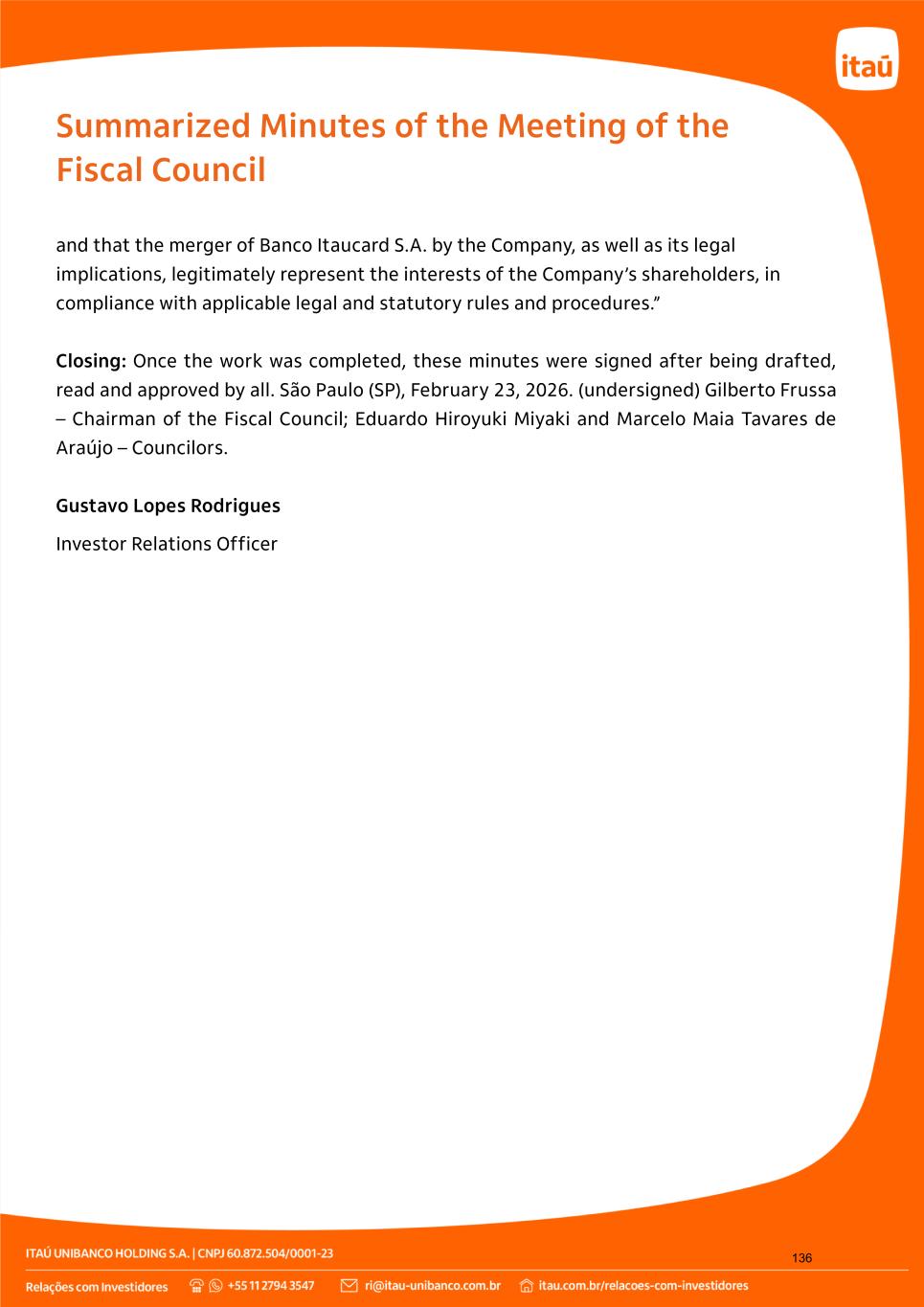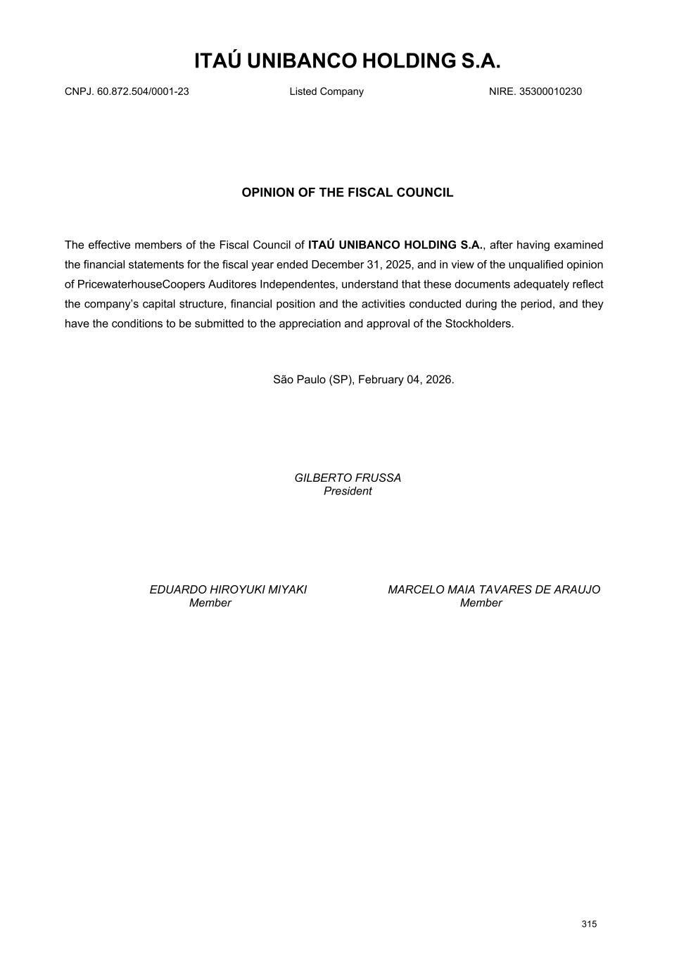 ITAÚ UNIBANCO HOLDING S.A. CNPJ. 60.872.504/0001-23 Listed Company NIRE. 35300010230 OPINION OF THE FISCAL COUNCIL The effective members of the Fiscal Council of ITAÚ UNIBANCO HOLDING S.A., after having examined the financial statements for the fiscal year ended December 31, 2025, and in view of the unqualified opinion of PricewaterhouseCoopers Auditores Independentes, understand that these documents adequately reflect the company’s capital structure, financial position and the activities conducted during the period, and they have the conditions to be submitted to the appreciation and approval of the Stockholders. São Paulo (SP), February 04, 2026. GILBERTO FRUSSA President EDUARDO HIROYUKI MIYAKI MARCELO MAIA TAVARES DE ARAUJO Member Member 315