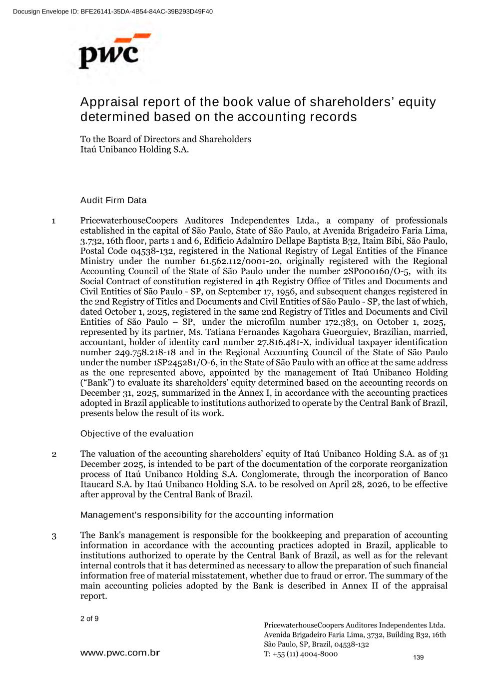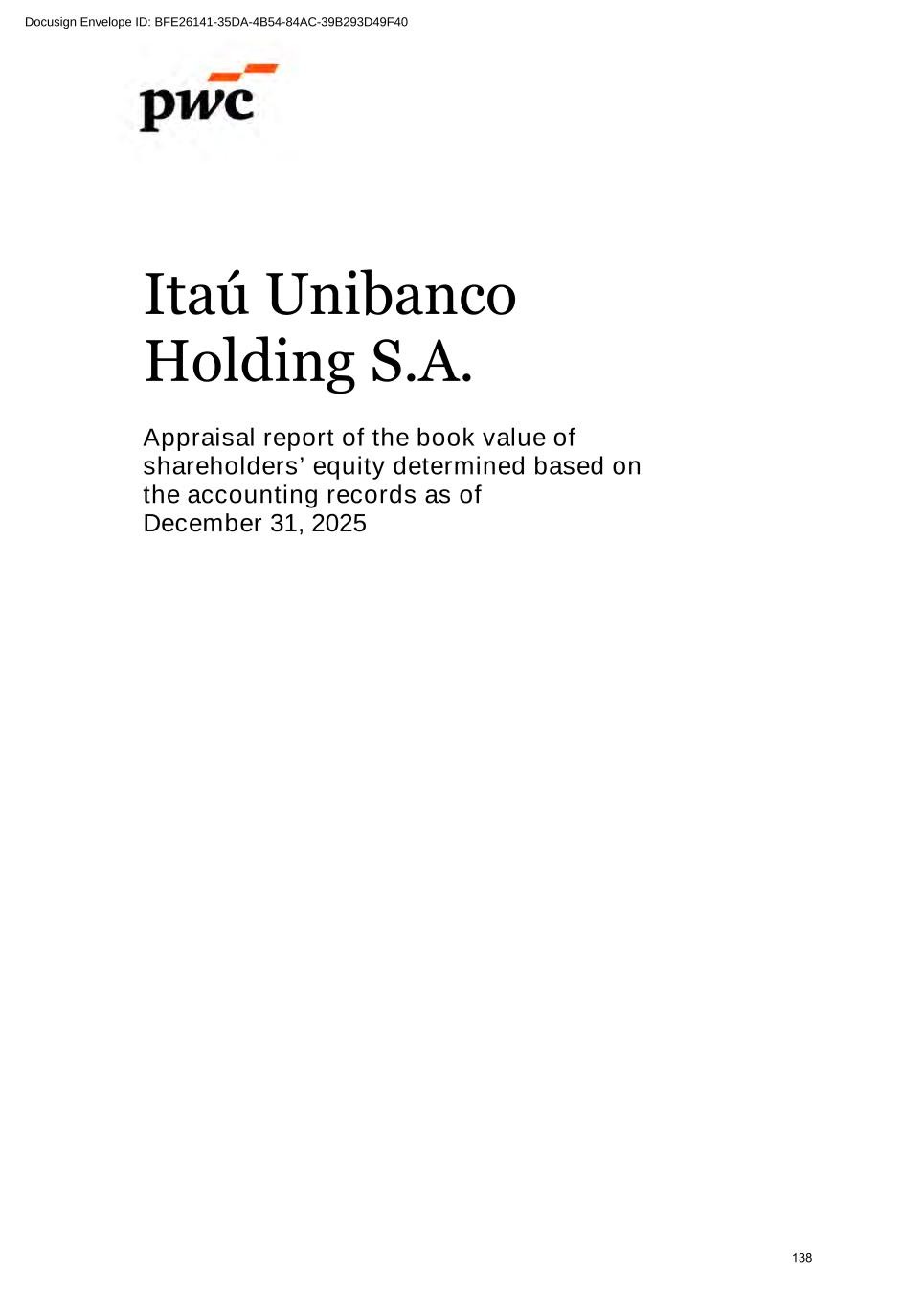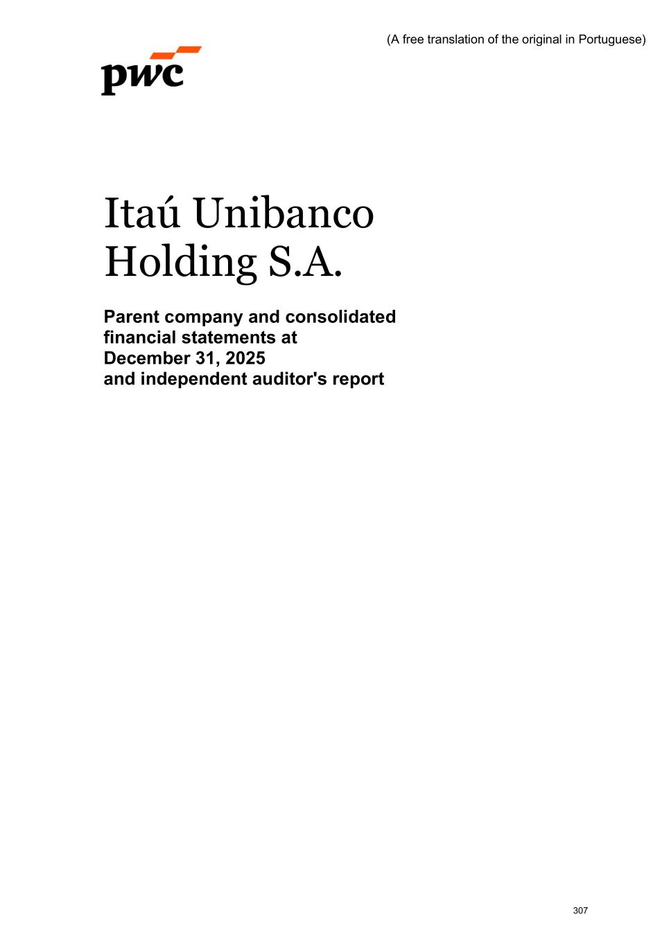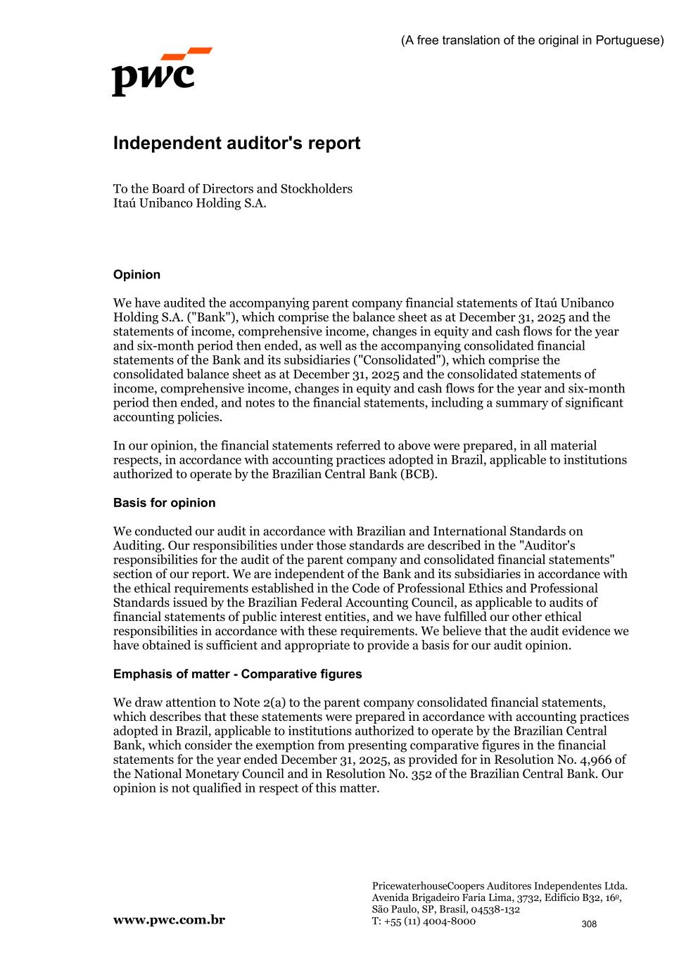 www.pwc.com.br PricewaterhouseCoopers Auditores Independentes Ltda. Avenida Brigadeiro Faria Lima, 3732, Edifício B32, 16o, São Paulo, SP, Brasil, 04538-132 T: +55 (11) 4004-8000 (A free translation of the original in Portuguese) Independent auditor's report To the Board of Directors and Stockholders Itaú Unibanco Holding S.A. Opinion We have audited the accompanying parent company financial statements of Itaú Unibanco Holding S.A. ("Bank"), which comprise the balance sheet as at December 31, 2025 and the statements of income, comprehensive income, changes in equity and cash flows for the year and six-month period then ended, as well as the accompanying consolidated financial statements of the Bank and its subsidiaries ("Consolidated"), which comprise the consolidated balance sheet as at December 31, 2025 and the consolidated statements of income, comprehensive income, changes in equity and cash flows for the year and six-month period then ended, and notes to the financial statements, including a summary of significant accounting policies. In our opinion, the financial statements referred to above were prepared, in all material respects, in accordance with accounting practices adopted in Brazil, applicable to institutions authorized to operate by the Brazilian Central Bank (BCB). Basis for opinion We conducted our audit in accordance with Brazilian and International Standards on Auditing. Our responsibilities under those standards are described in the "Auditor's responsibilities for the audit of the parent company and consolidated financial statements" section of our report. We are independent of the Bank and its subsidiaries in accordance with the ethical requirements established in the Code of Professional Ethics and Professional Standards issued by the Brazilian Federal Accounting Council, as applicable to audits of financial statements of public interest entities, and we have fulfilled our other ethical responsibilities in accordance with these requirements. We believe that the audit evidence we have obtained is sufficient and appropriate to provide a basis for our audit opinion. Emphasis of matter - Comparative figures We draw attention to Note 2(a) to the parent company consolidated financial statements, which describes that these statements were prepared in accordance with accounting practices adopted in Brazil, applicable to institutions authorized to operate by the Brazilian Central Bank, which consider the exemption from presenting comparative figures in the financial statements for the year ended December 31, 2025, as provided for in Resolution No. 4,966 of the National Monetary Council and in Resolution No. 352 of the Brazilian Central Bank. Our opinion is not qualified in respect of this matter. 308