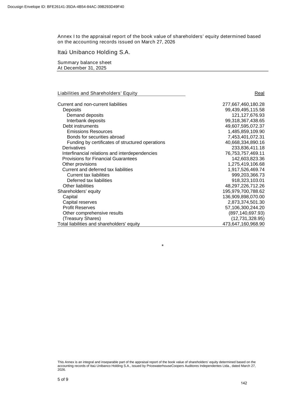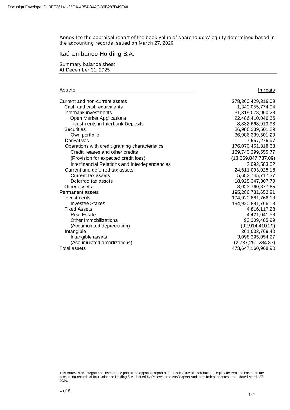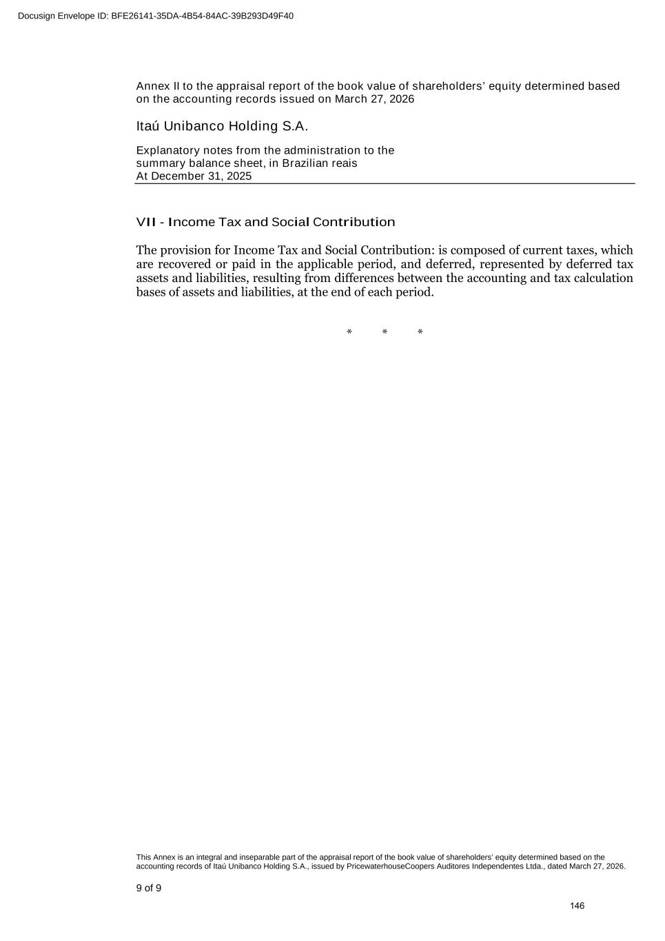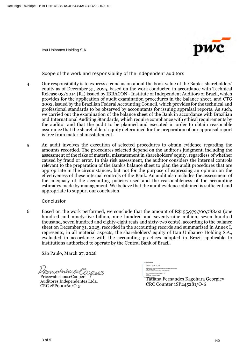 www.pwc.com.br PricewaterhouseCoopers Auditores Independentes Ltda. Avenida Brigadeiro Faria Lima, 3732, Edifício B32, 16o, São Paulo, SP, Brasil, 04538-132 T: +55 (11) 4004-8000 (A free translation of the original in Portuguese) Independent auditor's report To the Board of Directors and Stockholders Itaú Unibanco Holding S.A. Opinion We have audited the accompanying parent company financial statements of Itaú Unibanco Holding S.A. ("Bank"), which comprise the balance sheet as at December 31, 2025 and the statements of income, comprehensive income, changes in equity and cash flows for the year and six-month period then ended, as well as the accompanying consolidated financial statements of the Bank and its subsidiaries ("Consolidated"), which comprise the consolidated balance sheet as at December 31, 2025 and the consolidated statements of income, comprehensive income, changes in equity and cash flows for the year and six-month period then ended, and notes to the financial statements, including a summary of significant accounting policies. In our opinion, the financial statements referred to above were prepared, in all material respects, in accordance with accounting practices adopted in Brazil, applicable to institutions authorized to operate by the Brazilian Central Bank (BCB). Basis for opinion We conducted our audit in accordance with Brazilian and International Standards on Auditing. Our responsibilities under those standards are described in the "Auditor's responsibilities for the audit of the parent company and consolidated financial statements" section of our report. We are independent of the Bank and its subsidiaries in accordance with the ethical requirements established in the Code of Professional Ethics and Professional Standards issued by the Brazilian Federal Accounting Council, as applicable to audits of financial statements of public interest entities, and we have fulfilled our other ethical responsibilities in accordance with these requirements. We believe that the audit evidence we have obtained is sufficient and appropriate to provide a basis for our audit opinion. Emphasis of matter - Comparative figures We draw attention to Note 2(a) to the parent company consolidated financial statements, which describes that these statements were prepared in accordance with accounting practices adopted in Brazil, applicable to institutions authorized to operate by the Brazilian Central Bank, which consider the exemption from presenting comparative figures in the financial statements for the year ended December 31, 2025, as provided for in Resolution No. 4,966 of the National Monetary Council and in Resolution No. 352 of the Brazilian Central Bank. Our opinion is not qualified in respect of this matter. 308