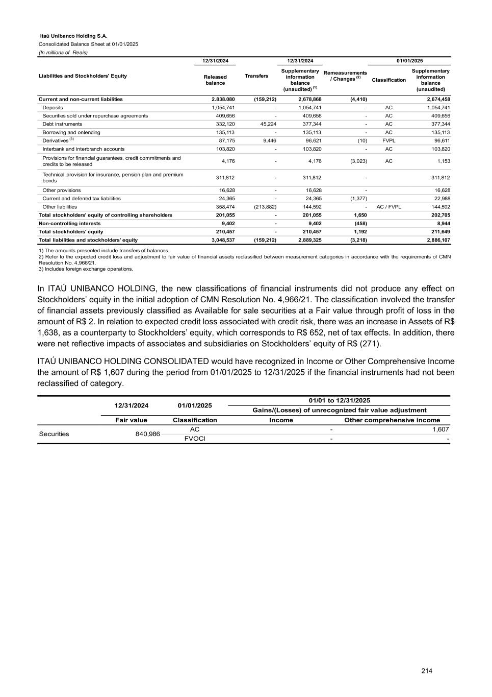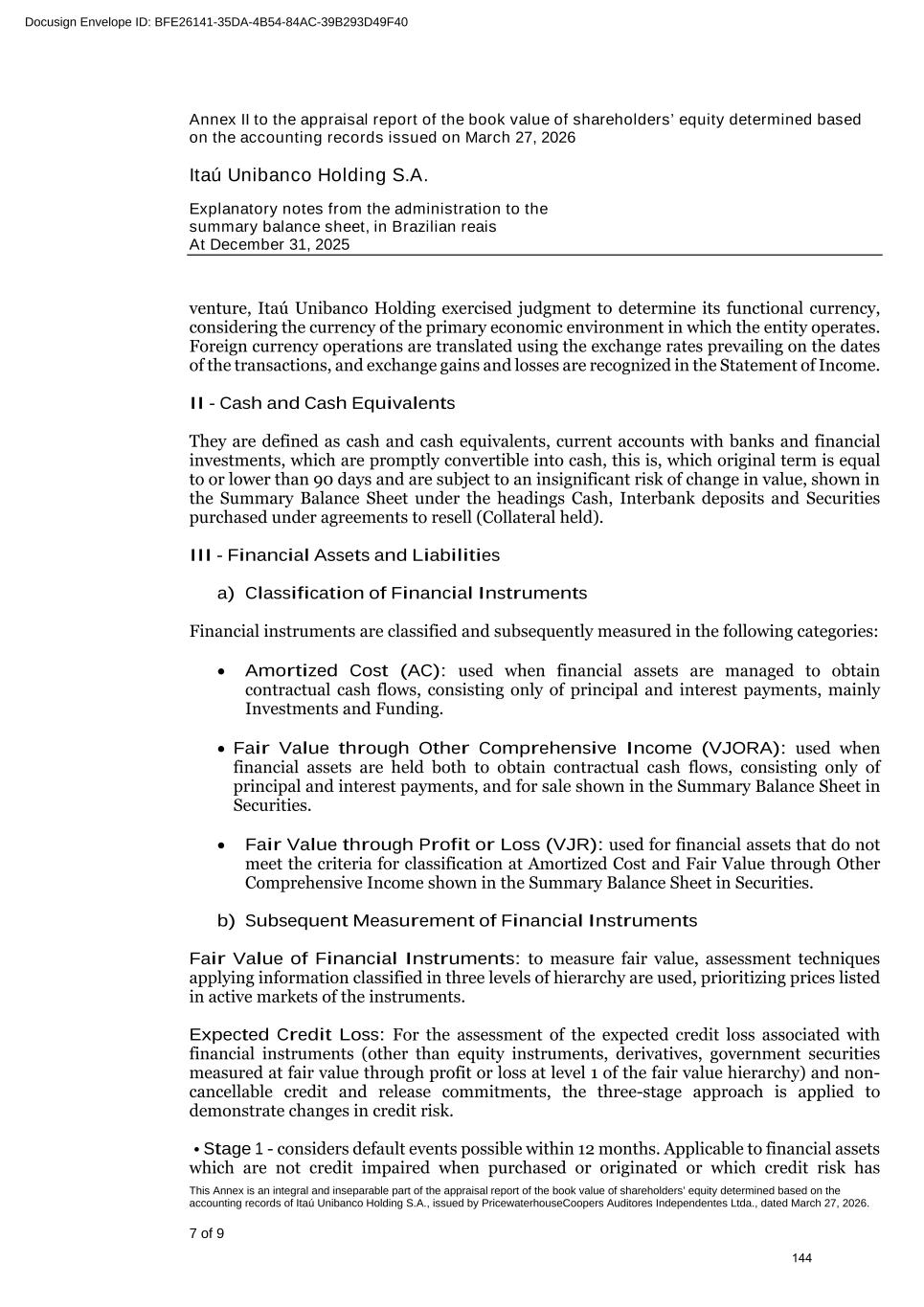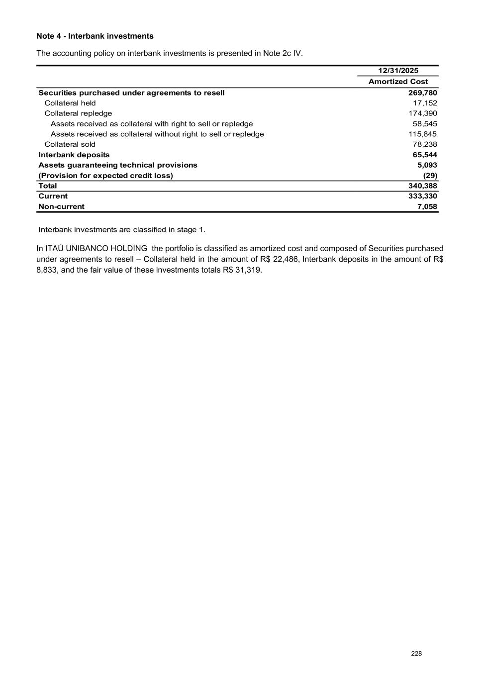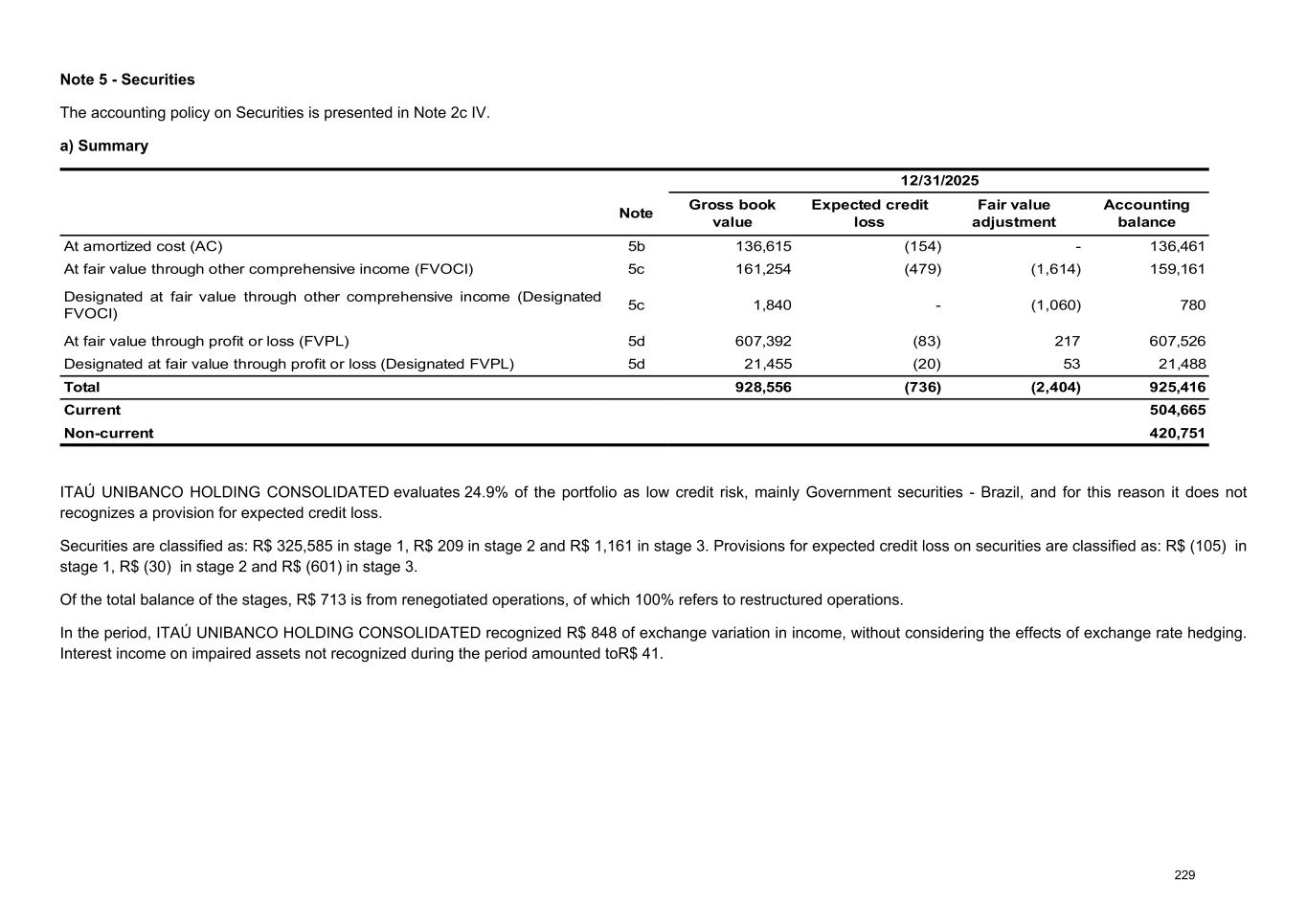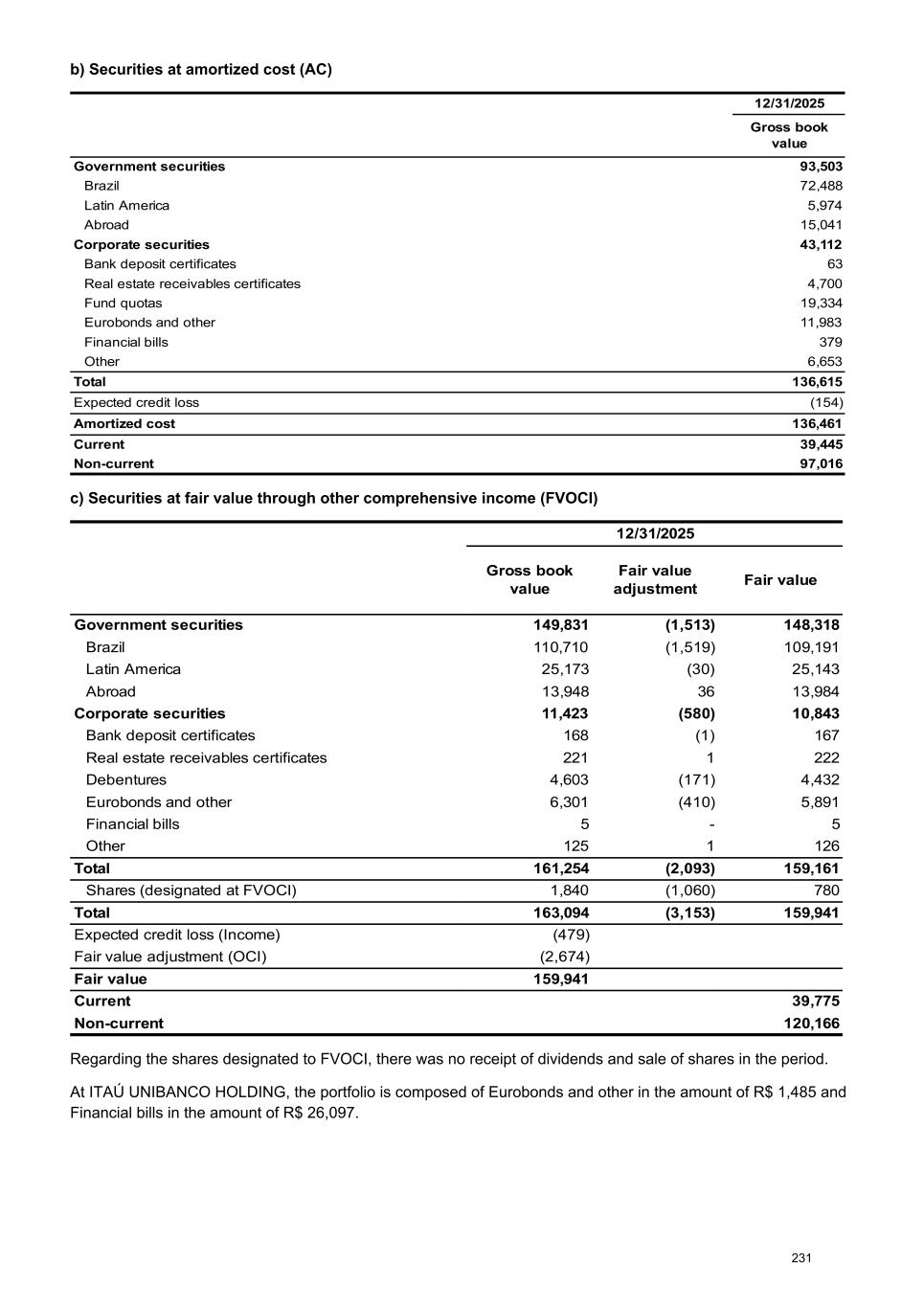 b) Securities at amortized cost (AC) 12/31/2025 Gross book value Government securities 93,503 Brazil 72,488 Latin America 5,974 Abroad 15,041 Corporate securities 43,112 Bank deposit certificates 63 Real estate receivables certificates 4,700 Fund quotas 19,334 Eurobonds and other 11,983 Financial bills 379 Other 6,653 Total 136,615 Expected credit loss (154) Amortized cost 136,461 Current 39,445 Non-current 97,016 c) Securities at fair value through other comprehensive income (FVOCI) 12/31/2025 Gross book value Fair value adjustment Fair value Government securities 149,831 (1,513) 148,318 Brazil 110,710 (1,519) 109,191 Latin America 25,173 (30) 25,143 Abroad 13,948 36 13,984 Corporate securities 11,423 (580) 10,843 Bank deposit certificates 168 (1) 167 Real estate receivables certificates 221 1 222 Debentures 4,603 (171) 4,432 Eurobonds and other 6,301 (410) 5,891 Financial bills 5 - 5 Other 125 1 126 Total 161,254 (2,093) 159,161 Shares (designated at FVOCI) 1,840 (1,060) 780 Total 163,094 (3,153) 159,941 Expected credit loss (Income) (479) Fair value adjustment (OCI) (2,674) Fair value 159,941 Current 39,775 Non-current 120,166 Regarding the shares designated to FVOCI, there was no receipt of dividends and sale of shares in the period. At ITAÚ UNIBANCO HOLDING, the portfolio is composed of Eurobonds and other in the amount of R$ 1,485 and Financial bills in the amount of R$ 26,097. 231