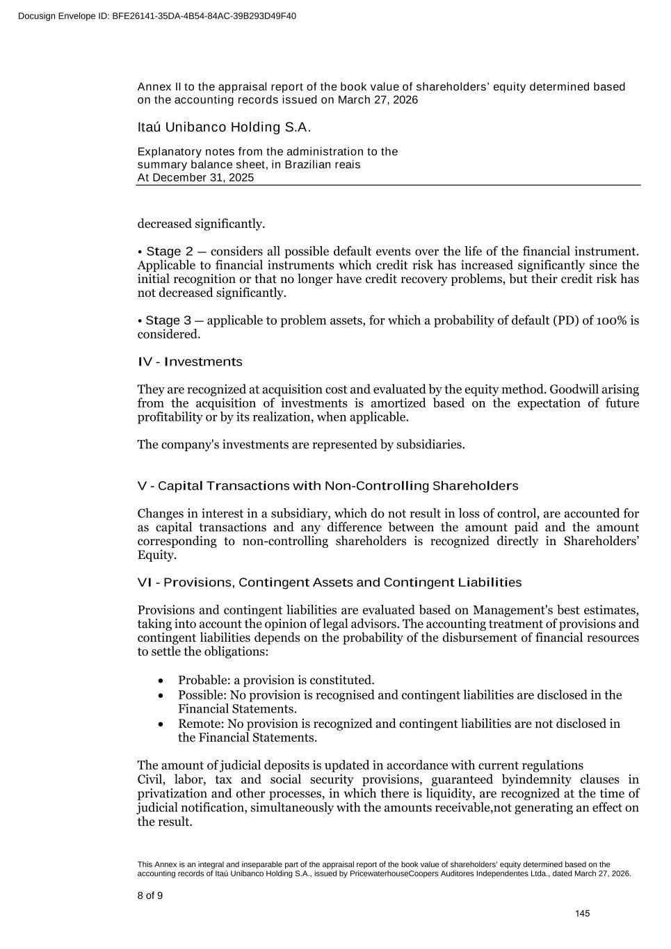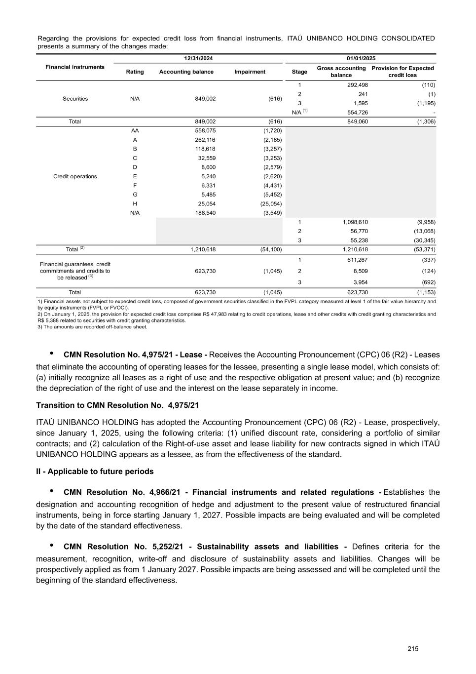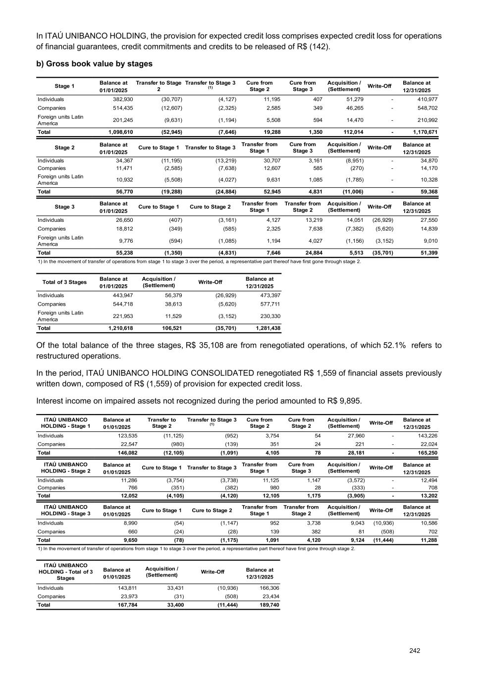 In ITAÚ UNIBANCO HOLDING, the provision for expected credit loss comprises expected credit loss for operations of financial guarantees, credit commitments and credits to be released of R$ (142). b) Gross book value by stages Stage 1 Balance at Transfer to Stage 2 Transfer to Stage 3 (1) Cure from Stage 2 Cure from Stage 3 Acquisition / (Settlement) Write-Off Balance at 01/01/2025 12/31/2025 Individuals 382,930 (30,707) (4,127) 11,195 407 51,279 - 410,977 Companies 514,435 (12,607) (2,325) 2,585 349 46,265 - 548,702 Foreign units Latin America 201,245 (9,631) (1,194) 5,508 594 14,470 - 210,992 Total 1,098,610 (52,945) (7,646) 19,288 1,350 112,014 - 1,170,671 Stage 2 Balance at Cure to Stage 1 Transfer to Stage 3 Transfer from Stage 1 Cure from Stage 3 Acquisition / (Settlement) Write-Off Balance at 01/01/2025 12/31/2025 Individuals 34,367 (11,195) (13,219) 30,707 3,161 (8,951) - 34,870 Companies 11,471 (2,585) (7,638) 12,607 585 (270) - 14,170 Foreign units Latin America 10,932 (5,508) (4,027) 9,631 1,085 (1,785) - 10,328 Total 56,770 (19,288) (24,884) 52,945 4,831 (11,006) - 59,368 Stage 3 Balance at Cure to Stage 1 Cure to Stage 2 Transfer from Stage 1 Transfer from Stage 2 Acquisition / (Settlement) Write-Off Balance at 01/01/2025 12/31/2025 Individuals 26,650 (407) (3,161) 4,127 13,219 14,051 (26,929) 27,550 Companies 18,812 (349) (585) 2,325 7,638 (7,382) (5,620) 14,839 Foreign units Latin America 9,776 (594) (1,085) 1,194 4,027 (1,156) (3,152) 9,010 Total 55,238 (1,350) (4,831) 7,646 24,884 5,513 (35,701) 51,399 1) In the movement of transfer of operations from stage 1 to stage 3 over the period, a representative part thereof have first gone through stage 2. Total of 3 Stages Balance at Acquisition / (Settlement) Write-Off Balance at 01/01/2025 12/31/2025 Individuals 443,947 56,379 (26,929) 473,397 Companies 544,718 38,613 (5,620) 577,711 Foreign units Latin America 221,953 11,529 (3,152) 230,330 Total 1,210,618 106,521 (35,701) 1,281,438 Of the total balance of the three stages, R$ 35,108 are from renegotiated operations, of which 52.1% refers to restructured operations. In the period, ITAÚ UNIBANCO HOLDING CONSOLIDATED renegotiated R$ 1,559 of financial assets previously written down, composed of R$ (1,559) of provision for expected credit loss. Interest income on impaired assets not recognized during the period amounted to R$ 9,895. ITAÚ UNIBANCO HOLDING - Stage 1 Balance at Transfer to Stage 2 Transfer to Stage 3 (1) Cure from Stage 2 Cure from Stage 2 Acquisition / (Settlement) Write-Off Balance at 01/01/2025 12/31/2025 Individuals 123,535 (11,125) (952) 3,754 54 27,960 - 143,226 Companies 22,547 (980) (139) 351 24 221 - 22,024 Total 146,082 (12,105) (1,091) 4,105 78 28,181 - 165,250 ITAÚ UNIBANCO HOLDING - Stage 2 Balance at Cure to Stage 1 Transfer to Stage 3 Transfer from Stage 1 Cure from Stage 3 Acquisition / (Settlement) Write-Off Balance at 01/01/2025 12/31/2025 Individuals 11,286 (3,754) (3,738) 11,125 1,147 (3,572) - 12,494 Companies 766 (351) (382) 980 28 (333) - 708 Total 12,052 (4,105) (4,120) 12,105 1,175 (3,905) - 13,202 ITAÚ UNIBANCO HOLDING - Stage 3 Balance at Cure to Stage 1 Cure to Stage 2 Transfer from Stage 1 Transfer from Stage 2 Acquisition / (Settlement) Write-Off Balance at 01/01/2025 12/31/2025 Individuals 8,990 (54) (1,147) 952 3,738 9,043 (10,936) 10,586 Companies 660 (24) (28) 139 382 81 (508) 702 Total 9,650 (78) (1,175) 1,091 4,120 9,124 (11,444) 11,288 1) In the movement of transfer of operations from stage 1 to stage 3 over the period, a representative part thereof have first gone through stage 2. ITAÚ UNIBANCO HOLDING - Total of 3 Stages Balance at Acquisition / (Settlement) Write-Off Balance at 01/01/2025 12/31/2025 Individuals 143,811 33,431 (10,936) 166,306 Companies 23,973 (31) (508) 23,434 Total 167,784 33,400 (11,444) 189,740 242