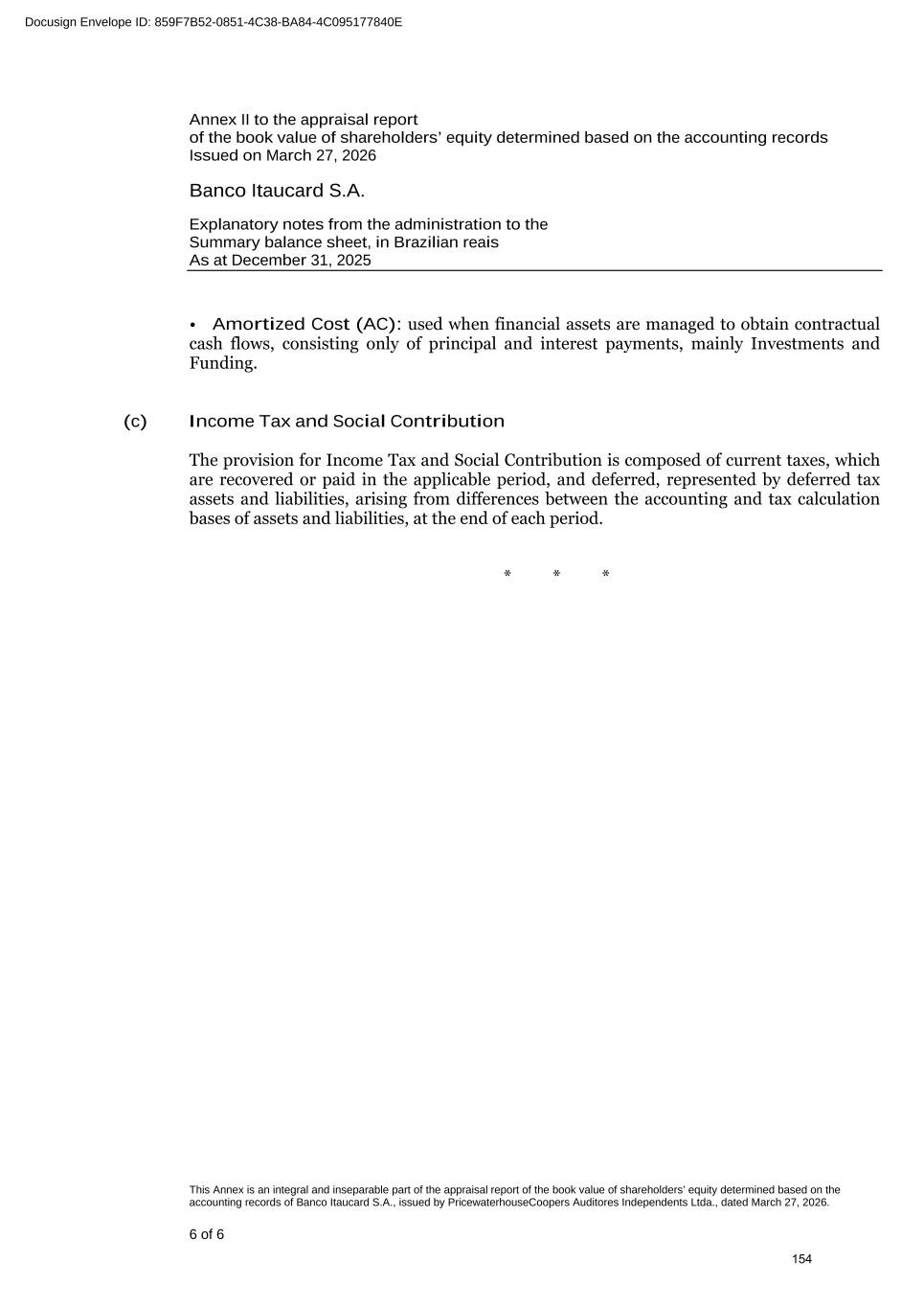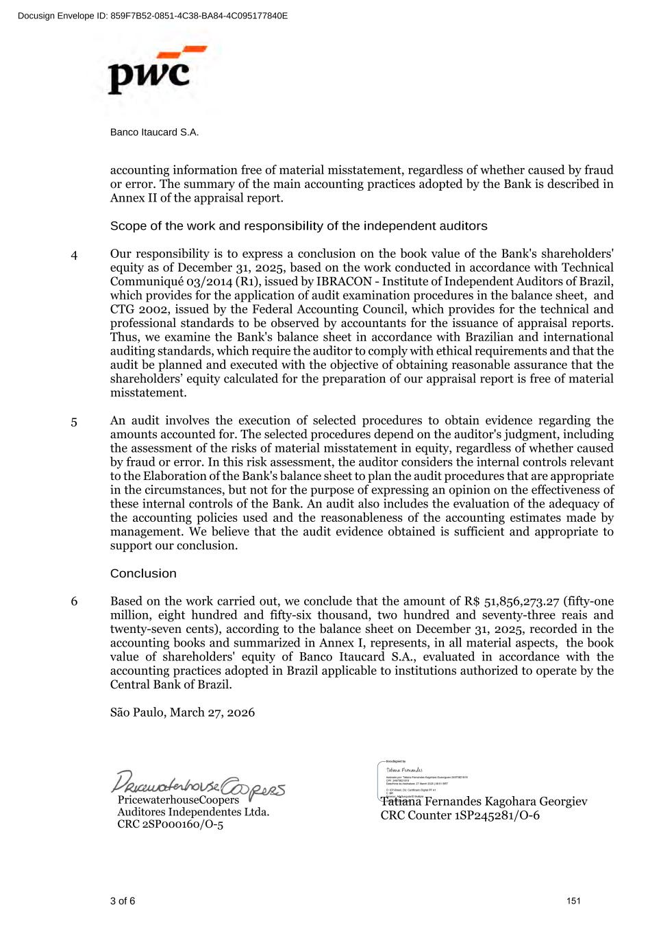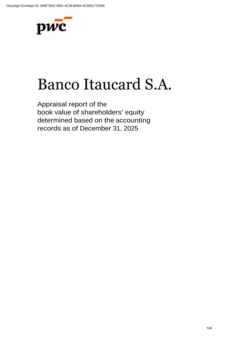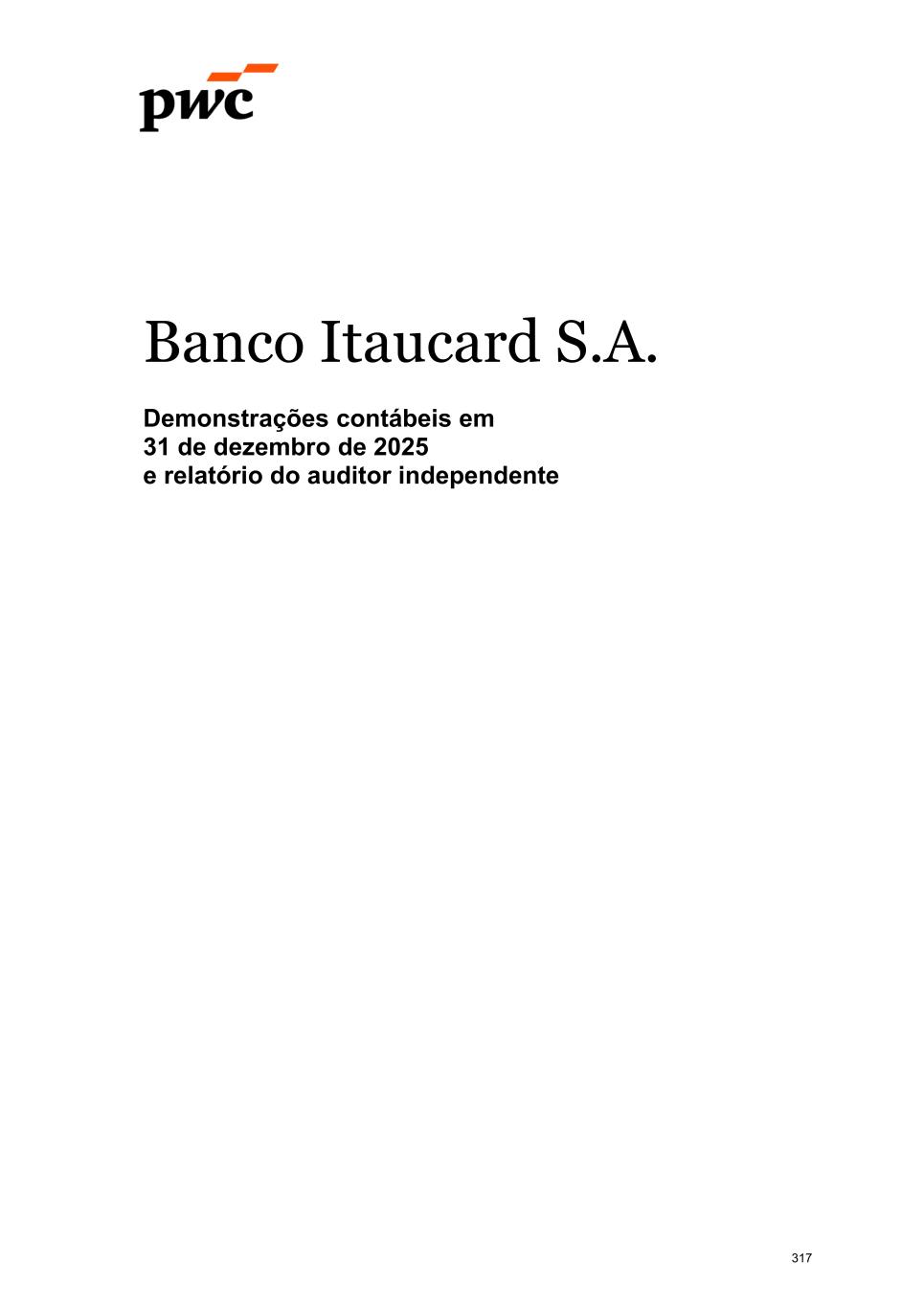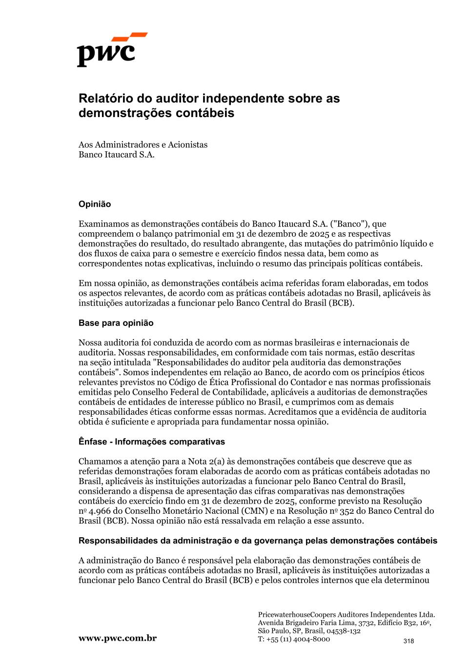 www.pwc.com.br PricewaterhouseCoopers Auditores Independentes Ltda. Avenida Brigadeiro Faria Lima, 3732, Edifício B32, 16o, São Paulo, SP, Brasil, 04538-132 T: +55 (11) 4004-8000 Relatório do auditor independente sobre as demonstrações contábeis Aos Administradores e Acionistas Banco Itaucard S.A. Opinião Examinamos as demonstrações contábeis do Banco Itaucard S.A. ("Banco"), que compreendem o balanço patrimonial em 31 de dezembro de 2025 e as respectivas demonstrações do resultado, do resultado abrangente, das mutações do patrimônio líquido e dos fluxos de caixa para o semestre e exercício findos nessa data, bem como as correspondentes notas explicativas, incluindo o resumo das principais políticas contábeis. Em nossa opinião, as demonstrações contábeis acima referidas foram elaboradas, em todos os aspectos relevantes, de acordo com as práticas contábeis adotadas no Brasil, aplicáveis às instituições autorizadas a funcionar pelo Banco Central do Brasil (BCB). Base para opinião Nossa auditoria foi conduzida de acordo com as normas brasileiras e internacionais de auditoria. Nossas responsabilidades, em conformidade com tais normas, estão descritas na seção intitulada "Responsabilidades do auditor pela auditoria das demonstrações contábeis". Somos independentes em relação ao Banco, de acordo com os princípios éticos relevantes previstos no Código de Ética Profissional do Contador e nas normas profissionais emitidas pelo Conselho Federal de Contabilidade, aplicáveis a auditorias de demonstrações contábeis de entidades de interesse público no Brasil, e cumprimos com as demais responsabilidades éticas conforme essas normas. Acreditamos que a evidência de auditoria obtida é suficiente e apropriada para fundamentar nossa opinião. Ênfase - Informações comparativas Chamamos a atenção para a Nota 2(a) às demonstrações contábeis que descreve que as referidas demonstrações foram elaboradas de acordo com as práticas contábeis adotadas no Brasil, aplicáveis às instituições autorizadas a funcionar pelo Banco Central do Brasil, considerando a dispensa de apresentação das cifras comparativas nas demonstrações contábeis do exercício findo em 31 de dezembro de 2025, conforme previsto na Resolução no 4.966 do Conselho Monetário Nacional (CMN) e na Resolução no 352 do Banco Central do Brasil (BCB). Nossa opinião não está ressalvada em relação a esse assunto. Responsabilidades da administração e da governança pelas demonstrações contábeis A administração do Banco é responsável pela elaboração das demonstrações contábeis de acordo com as práticas contábeis adotadas no Brasil, aplicáveis às instituições autorizadas a funcionar pelo Banco Central do Brasil (BCB) e pelos controles internos que ela determinou 318