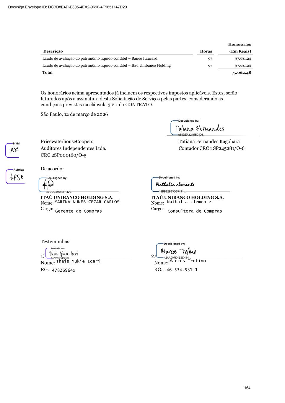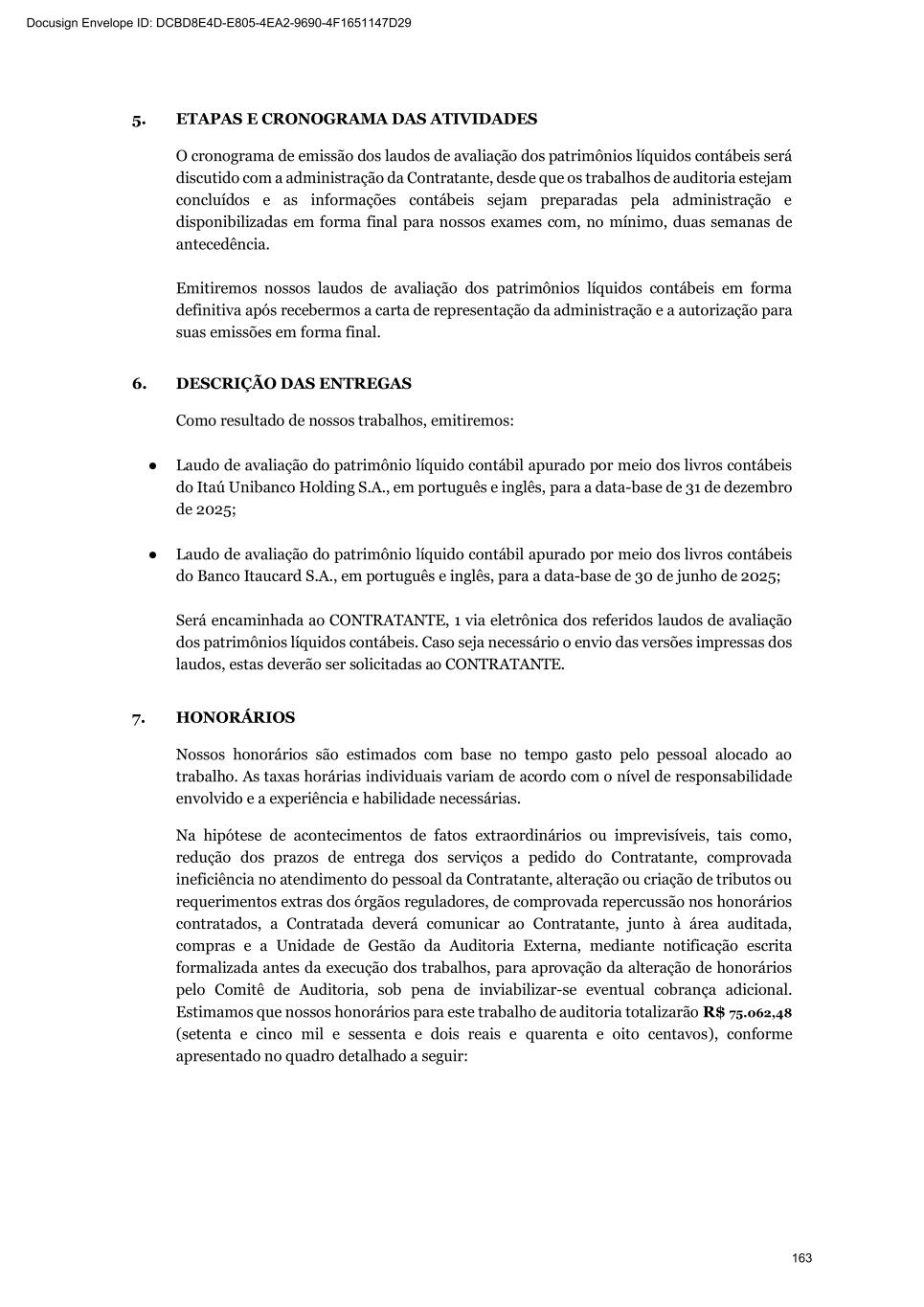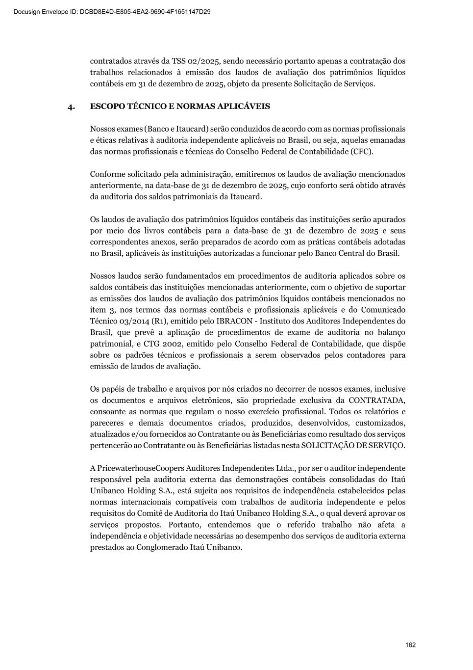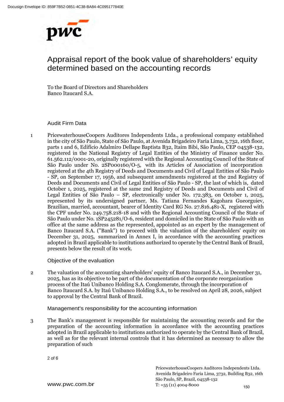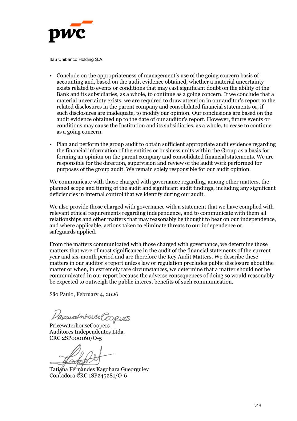 Itaú Unibanco Holding S.A. Conclude on the appropriateness of management's use of the going concern basis of accounting and, based on the audit evidence obtained, whether a material uncertainty exists related to events or conditions that may cast significant doubt on the ability of the Bank and its subsidiaries, as a whole, to continue as a going concern. If we conclude that a material uncertainty exists, we are required to draw attention in our auditor's report to the related disclosures in the parent company and consolidated financial statements or, if such disclosures are inadequate, to modify our opinion. Our conclusions are based on the audit evidence obtained up to the date of our auditor's report. However, future events or conditions may cause the Institution and its subsidiaries, as a whole, to cease to continue as a going concern. Plan and perform the group audit to obtain sufficient appropriate audit evidence regarding the financial information of the entities or business units within the Group as a basis for forming an opinion on the parent company and consolidated financial statements. We are responsible for the direction, supervision and review of the audit work performed for purposes of the group audit. We remain solely responsible for our audit opinion. We communicate with those charged with governance regarding, among other matters, the planned scope and timing of the audit and significant audit findings, including any significant deficiencies in internal control that we identify during our audit. We also provide those charged with governance with a statement that we have complied with relevant ethical requirements regarding independence, and to communicate with them all relationships and other matters that may reasonably be thought to bear on our independence, and where applicable, actions taken to eliminate threats to our independence or safeguards applied. From the matters communicated with those charged with governance, we determine those matters that were of most significance in the audit of the financial statements of the current year and six-month period and are therefore the Key Audit Matters. We describe these matters in our auditor's report unless law or regulation precludes public disclosure about the matter or when, in extremely rare circumstances, we determine that a matter should not be communicated in our report because the adverse consequences of doing so would reasonably be expected to outweigh the public interest benefits of such communication. São Paulo, February 4, 2026 PricewaterhouseCoopers Auditores Independentes Ltda. CRC 2SP000160/O-5 Tatiana Fernandes Kagohara Gueorguiev Contadora CRC 1SP245281/O-6 314