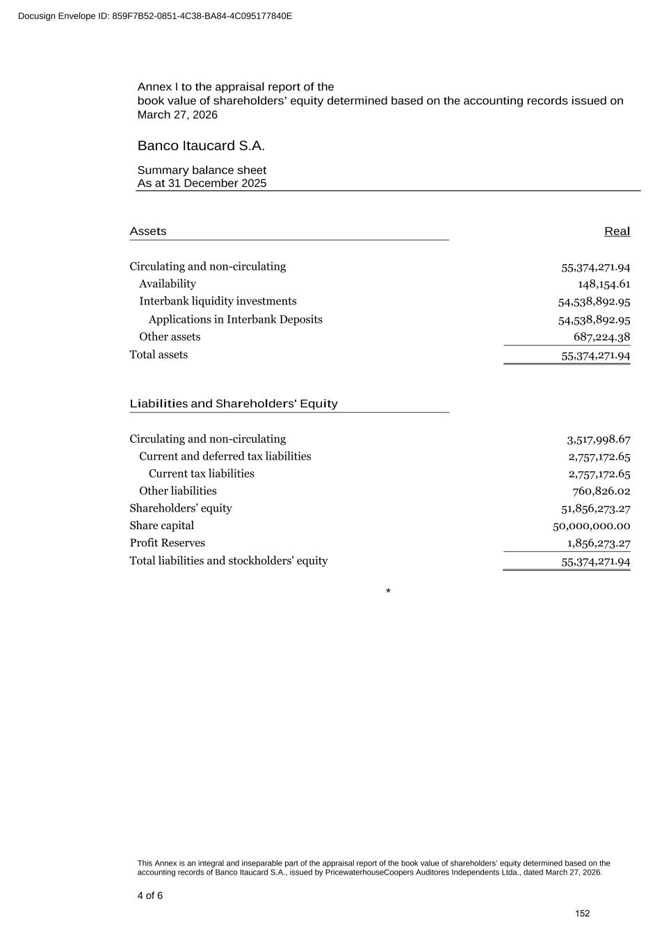 Banco Itaucard S.A. Balanço Patrimonial (Em milhares de reais) 1 Ativo Nota 31/12/2025 Circulante e Não Circulante 55.374 Disponibilidades 148 Aplicações Interfinanceiras de Liquidez 2c II 54.539 Aplicações em Depósitos Interfinanceiros 54.539 Outros Ativos 687 Total do Ativo 55.374 As notas explicativas são parte integrante das demonstrações contábeis. Banco Itaucard S.A. Balanço Patrimonial (Em milhares de reais) 1 Passivo e Patrimônio Líquido Nota 31/12/2025 Circulante e Não Circulante 3.518 Obrigações Fiscais Correntes e Diferidas 2c III 2.757 Obrigações Fiscais Correntes 2.757 Obrigações Fiscais Diferidas - Outros Passivos 761 Patrimônio Líquido 4 51.856 Capital Social 50.000 Reservas de Lucros 1.856 Total do Passivo e do Patrimônio Líquido 55.374 As notas explicativas são parte integrante das demonstrações contábeis. 323