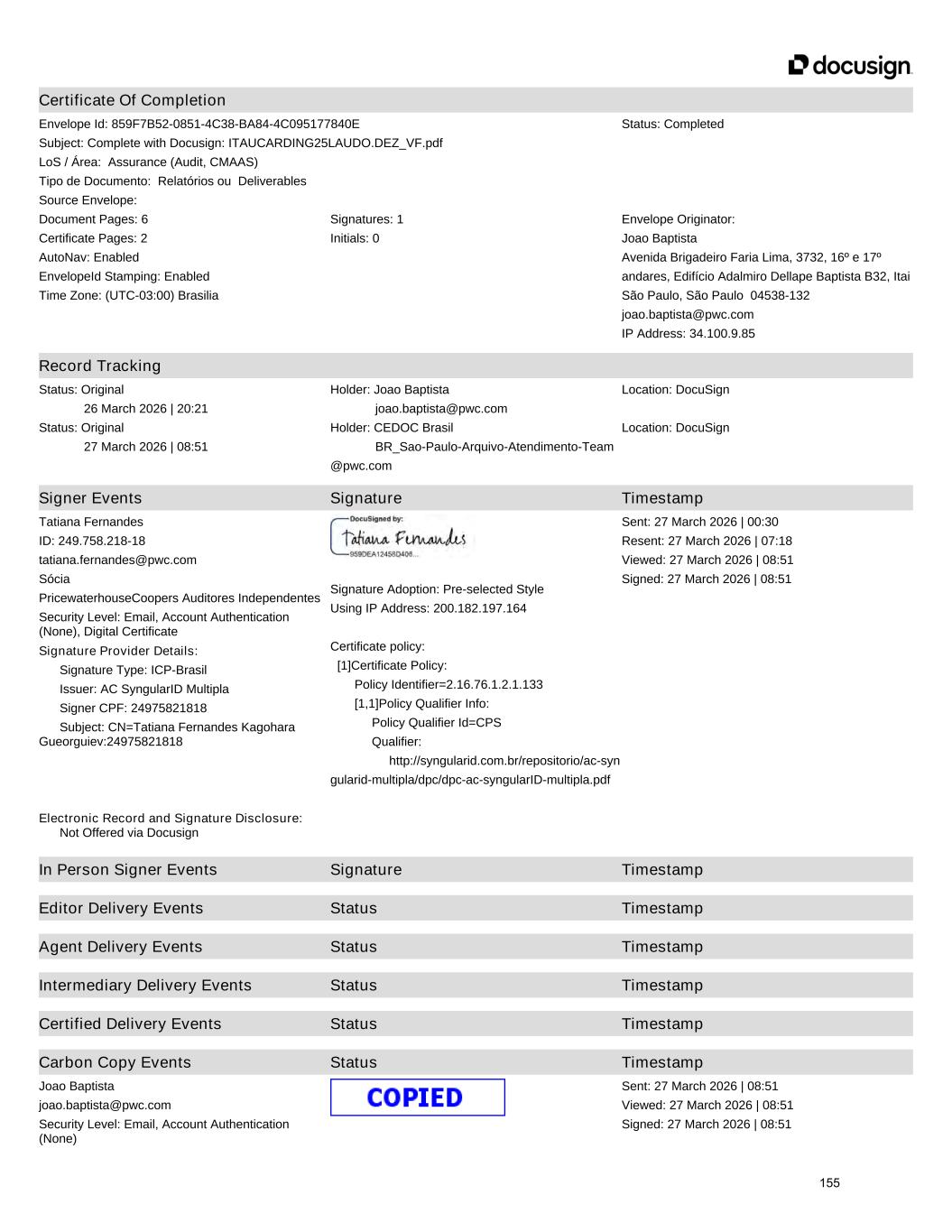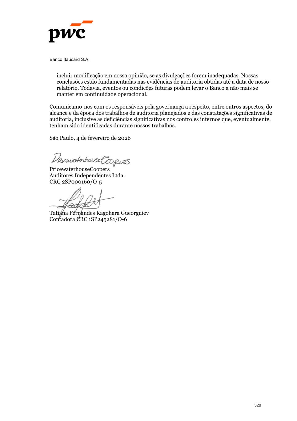Banco Itaucard S.A. incluir modificação em nossa opinião, se as divulgações forem inadequadas. Nossas conclusões estão fundamentadas nas evidências de auditoria obtidas até a data de nosso relatório. Todavia, eventos ou condições futuras podem levar o Banco a não mais se manter em continuidade operacional. Comunicamo-nos com os responsáveis pela governança a respeito, entre outros aspectos, do alcance e da época dos trabalhos de auditoria planejados e das constatações significativas de auditoria, inclusive as deficiências significativas nos controles internos que, eventualmente, tenham sido identificadas durante nossos trabalhos. São Paulo, 4 de fevereiro de 2026 PricewaterhouseCoopers Auditores Independentes Ltda. CRC 2SP000160/O-5 Tatiana Fernandes Kagohara Gueorguiev Contadora CRC 1SP245281/O-6 320
