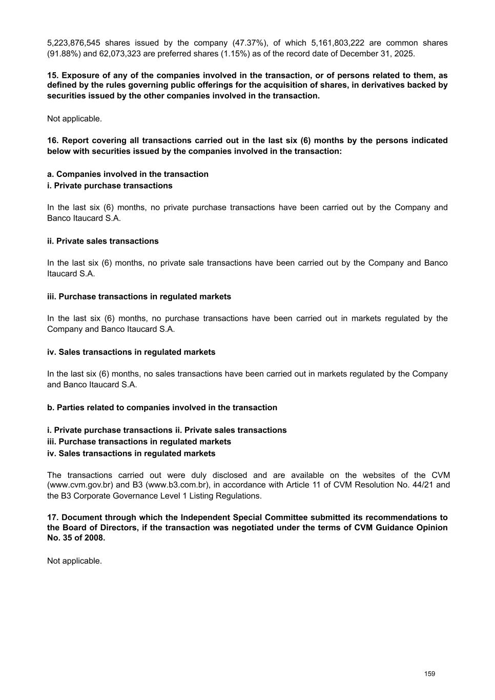 On December 5, 2025, we entered into an agreement with Companhia Brasileira de Distribuição (“GPA”), Lake Niassa Empreendimentos e Participações Ltda. (“GCB”) and Sendas Distribuidora S.A. (“Assaí”), among others, pursuant to which we expect to acquire, for R$786 million, subject to customary contractual price adjustments: (i) the equity interests currently held, directly or indirectly, by GPA and GCB in Financeira Itaú CBD S.A. – Crédito, Financiamento e Investimento (“FIC”); (ii) the equity interests currently held, directly or indirectly, by GCB in Banco Investcred Unibanco S.A. (“Investcred”); and (iii) the equity interest indirectly held by Assaí in FIC, on the second anniversary of the closing date of the transaction. The transaction was approved by CADE on January 5, 2026, and the closing of the transaction is still subject to the approval by the Brazilian Central Bank and other customary conditions precedent. Upon completion of all steps of the transaction, we intend to hold 100% of the total capital stock of each of FIC and Investcred. Sale of Assets and Liabilities in Colombia On December 12, 2025, we entered into an agreement with Banco de Bogotá S.A. and Banco de Bogotá (Panamá) S.A., pursuant to which we will assign and transfer certain assets and liabilities related to our retail operations in Colombia and Panama. The purchase price will be determined at closing based on the book value of such assets and liabilities, subject to customary contractual price adjustments. The closing of the transaction is subject to customary conditions precedent, including the receipt of all applicable regulatory approvals. c. unusual events or operations In addition to the items highlighted in section 2.4 b of this document, we highlight the following as unusual events: In line with IFRS accounting standards, no unusual events occurred in 2025. In line with BRGAAP accounting standards, the net non-recurring regulatory effects, after tax effects, were: In 2025: (i) impairment of internally developed software of R$(317) million; (ii) provision for restructuring of R$(676) million; and (iii) tax transactions of R$550 million. 44