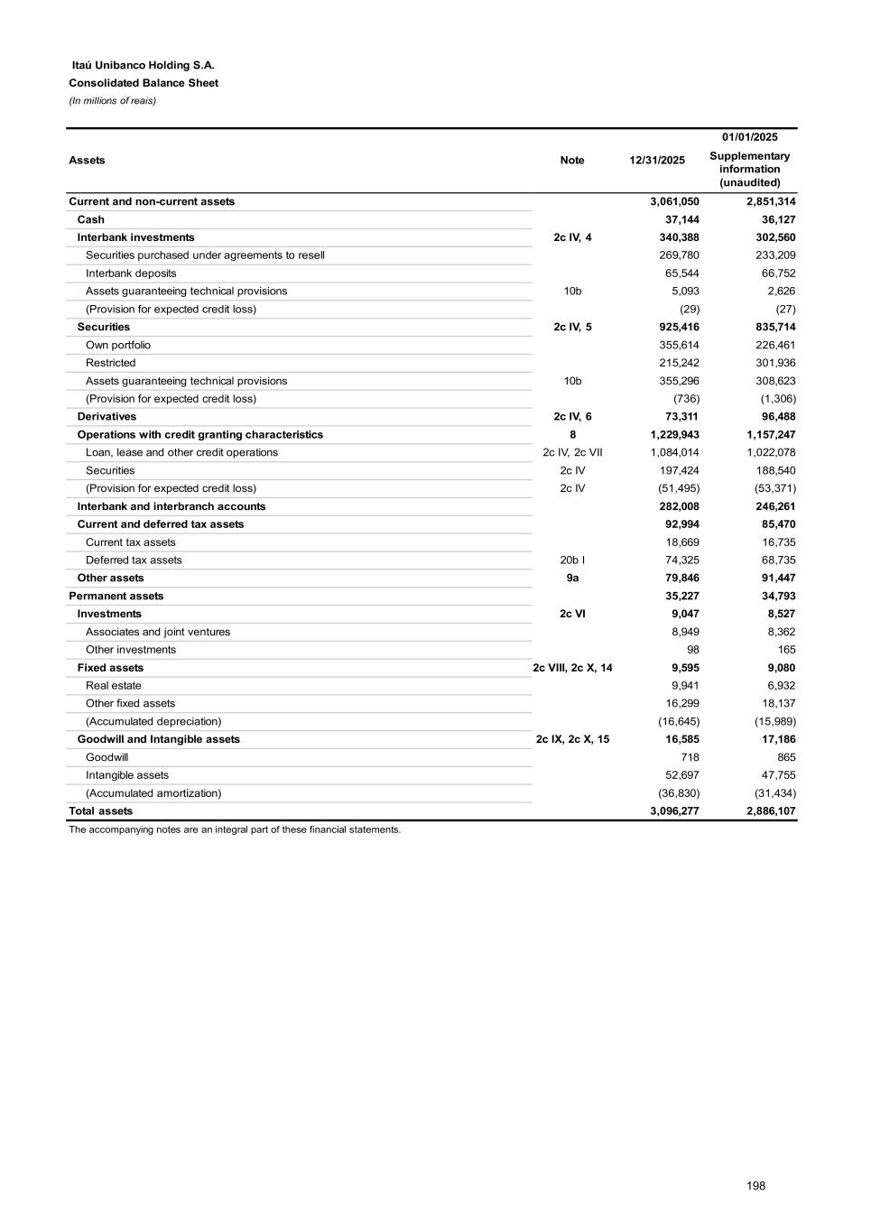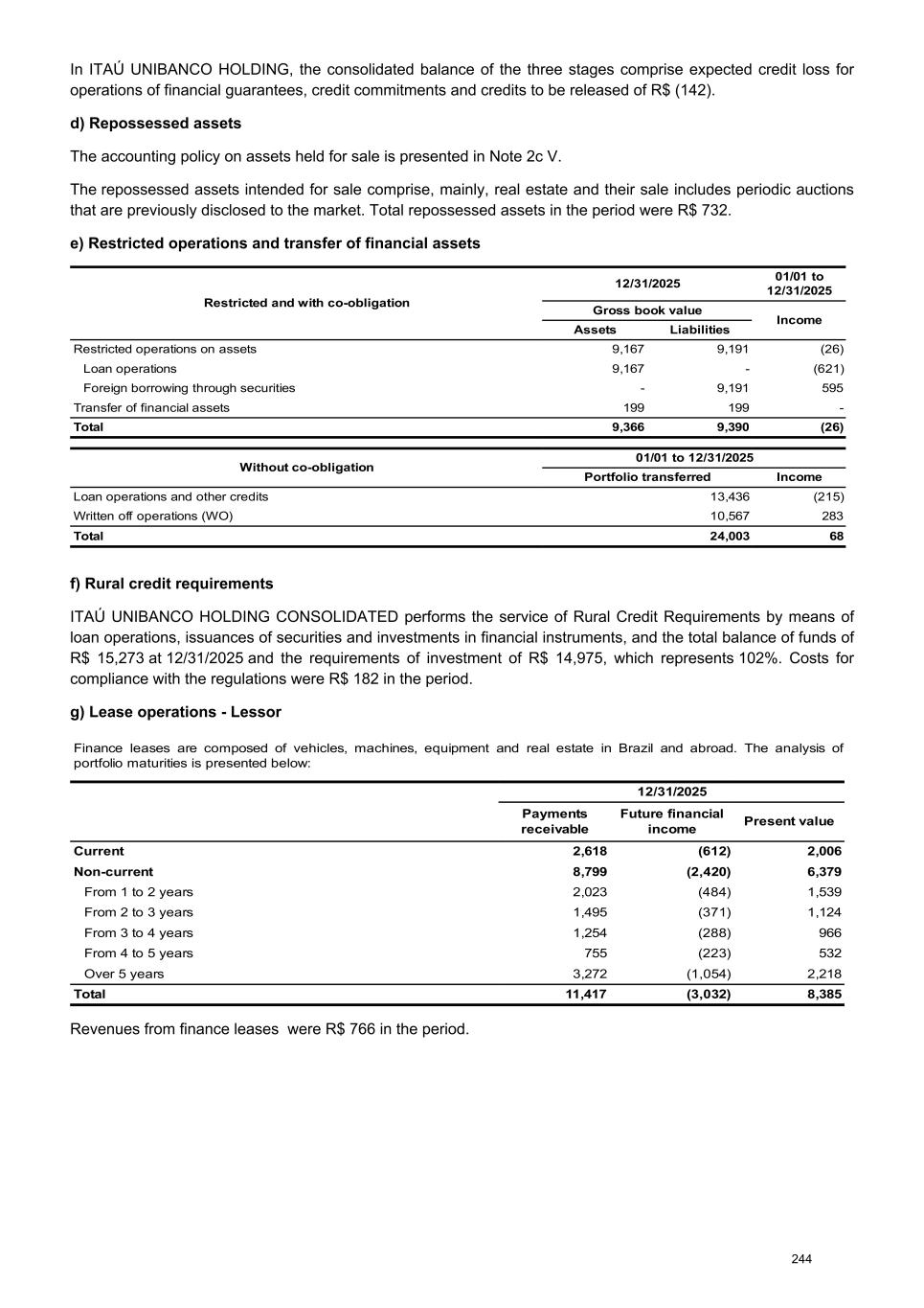 In ITAÚ UNIBANCO HOLDING, the consolidated balance of the three stages comprise expected credit loss for operations of financial guarantees, credit commitments and credits to be released of R$ (142). d) Repossessed assets The accounting policy on assets held for sale is presented in Note 2c V. The repossessed assets intended for sale comprise, mainly, real estate and their sale includes periodic auctions that are previously disclosed to the market. Total repossessed assets in the period were R$ 732. e) Restricted operations and transfer of financial assets Restricted and with co-obligation 12/31/2025 01/01 to 12/31/2025 Gross book value Income Assets Liabilities Restricted operations on assets 9,167 9,191 (26) Loan operations 9,167 - (621) Foreign borrowing through securities - 9,191 595 Transfer of financial assets 199 199 - Total 9,366 9,390 (26) Without co-obligation 01/01 to 12/31/2025 Portfolio transferred Income Loan operations and other credits 13,436 (215) Written off operations (WO) 10,567 283 Total 24,003 68 f) Rural credit requirements ITAÚ UNIBANCO HOLDING CONSOLIDATED performs the service of Rural Credit Requirements by means of loan operations, issuances of securities and investments in financial instruments, and the total balance of funds of R$ 15,273 at 12/31/2025 and the requirements of investment of R$ 14,975, which represents 102%. Costs for compliance with the regulations were R$ 182 in the period. g) Lease operations - Lessor Finance leases are composed of vehicles, machines, equipment and real estate in Brazil and abroad. The analysis of portfolio maturities is presented below: 12/31/2025 Payments receivable Future financial income Present value Current 2,618 (612) 2,006 Non-current 8,799 (2,420) 6,379 From 1 to 2 years 2,023 (484) 1,539 From 2 to 3 years 1,495 (371) 1,124 From 3 to 4 years 1,254 (288) 966 From 4 to 5 years 755 (223) 532 Over 5 years 3,272 (1,054) 2,218 Total 11,417 (3,032) 8,385 Revenues from finance leases were R$ 766 in the period. 244