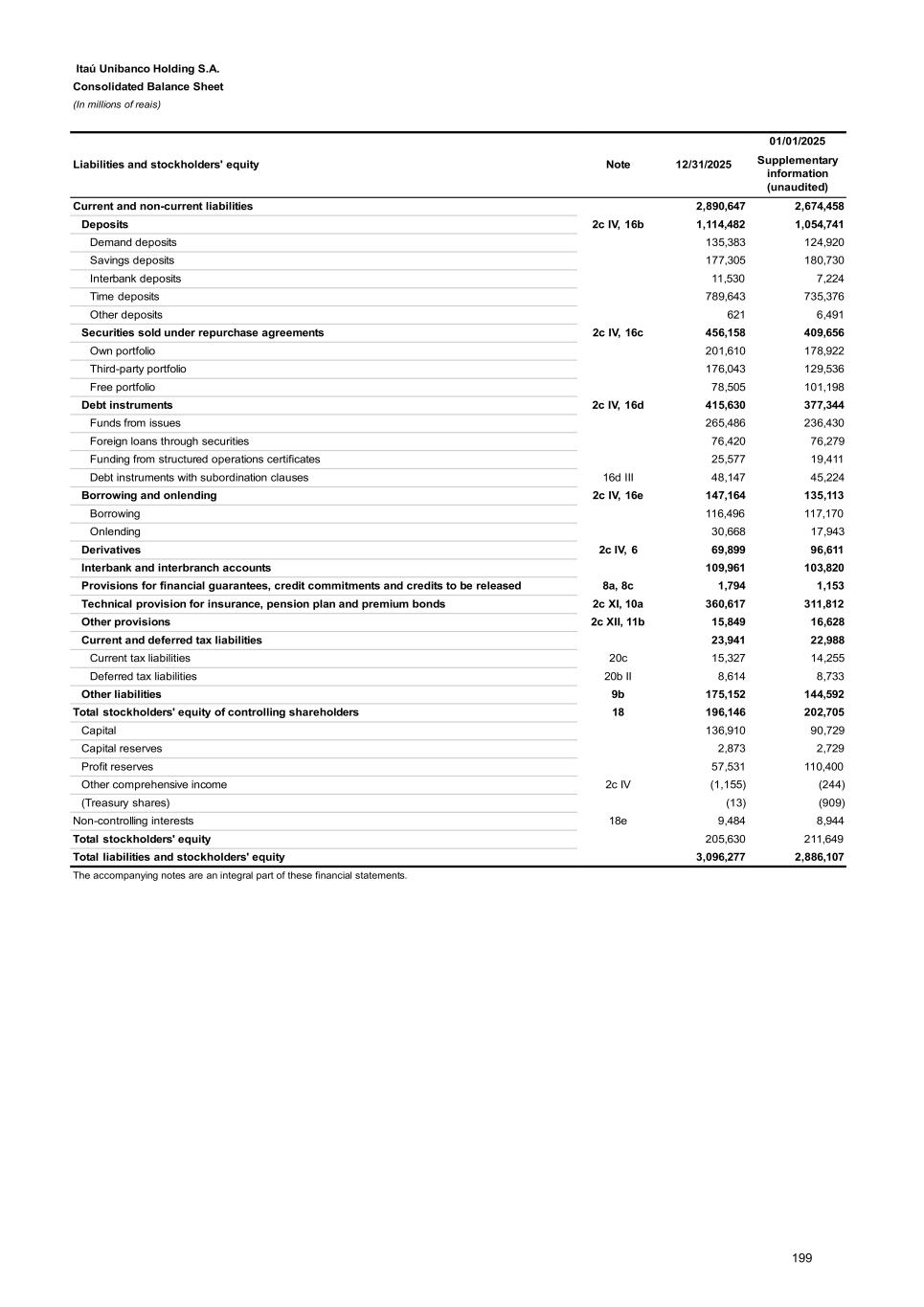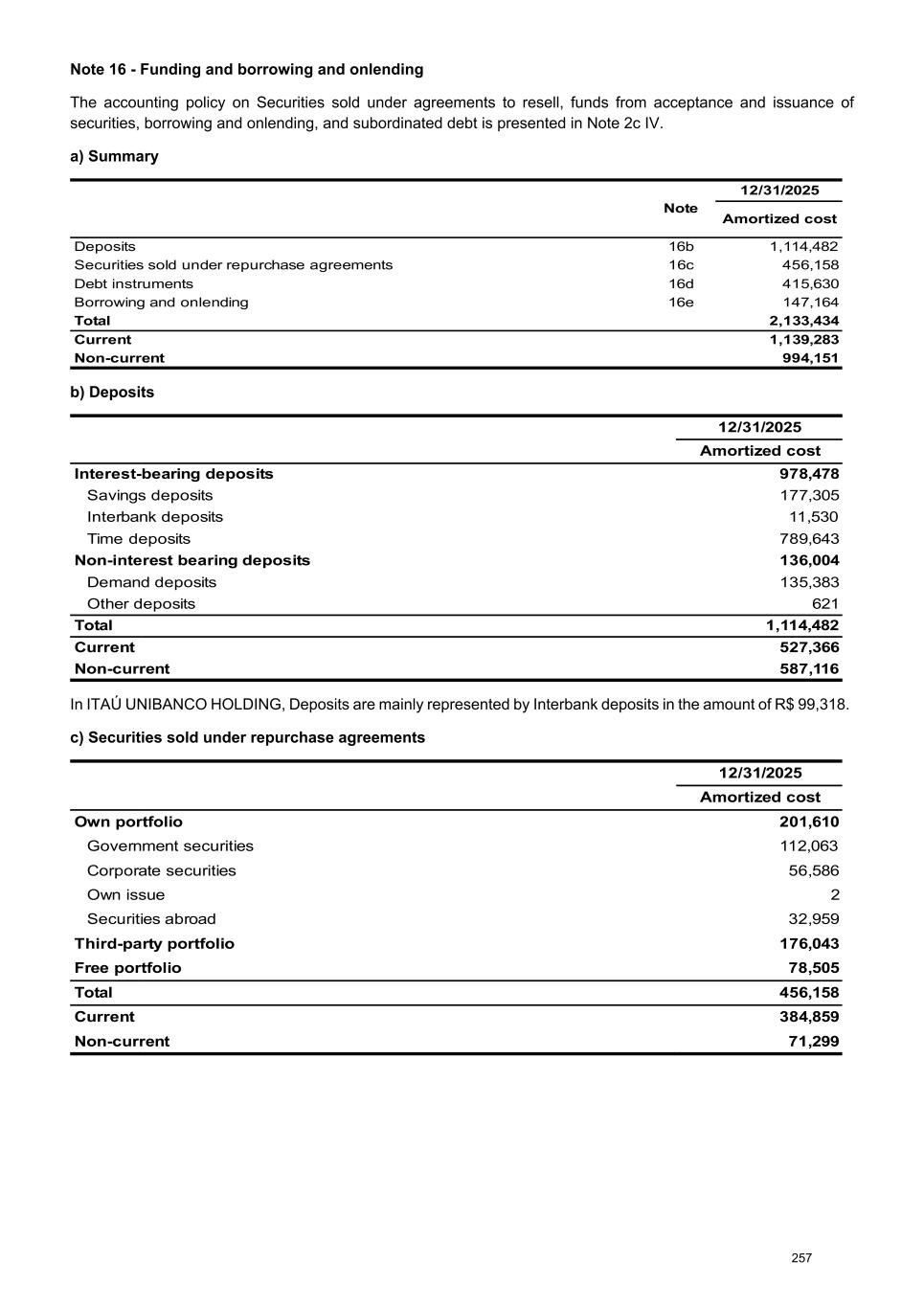 Note 16 - Funding and borrowing and onlending The accounting policy on Securities sold under agreements to resell, funds from acceptance and issuance of securities, borrowing and onlending, and subordinated debt is presented in Note 2c IV. a) Summary Note 12/31/2025 Amortized cost Deposits 16b 1,114,482 Securities sold under repurchase agreements 16c 456,158 Debt instruments 16d 415,630 Borrowing and onlending 16e 147,164 Total 2,133,434 Current 1,139,283 Non-current 994,151 b) Deposits 12/31/2025 Amortized cost Interest-bearing deposits 978,478 Savings deposits 177,305 Interbank deposits 11,530 Time deposits 789,643 Non-interest bearing deposits 136,004 Demand deposits 135,383 Other deposits 621 Total 1,114,482 Current 527,366 Non-current 587,116 In ITAÚ UNIBANCO HOLDING, Deposits are mainly represented by Interbank deposits in the amount of R$ 99,318. c) Securities sold under repurchase agreements 12/31/2025 Amortized cost Own portfolio 201,610 Government securities 112,063 Corporate securities 56,586 Own issue 2 Securities abroad 32,959 Third-party portfolio 176,043 Free portfolio 78,505 Total 456,158 Current 384,859 Non-current 71,299 257