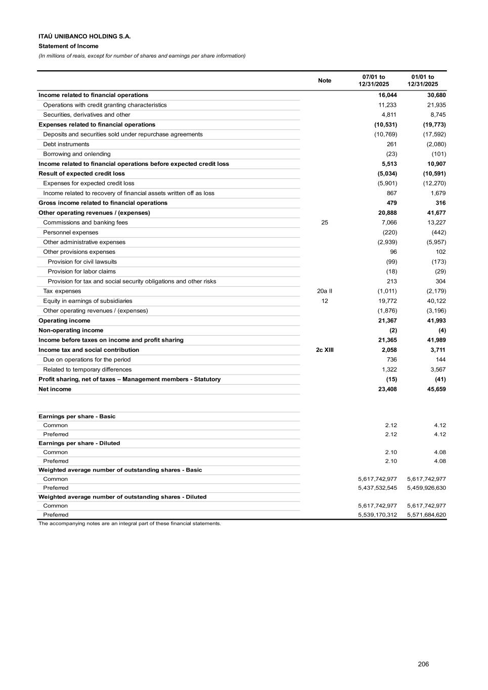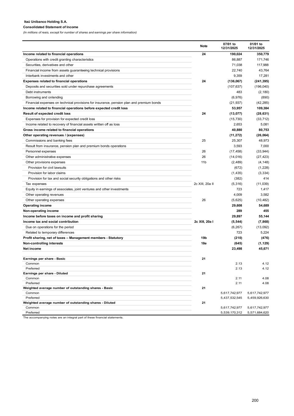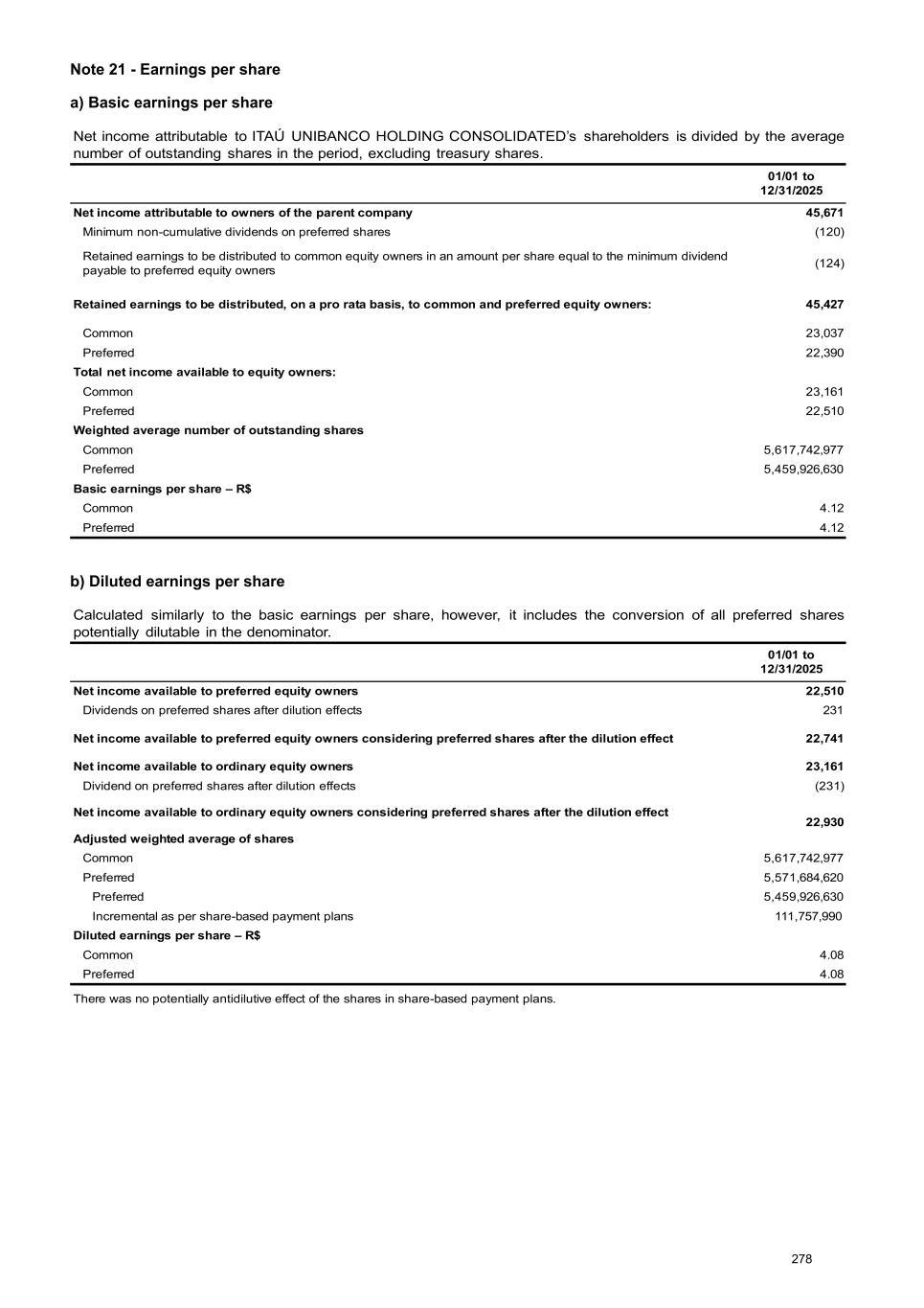 Note 21 - Earnings per share a) Basic earnings per share Net income attributable to ITAÚ UNIBANCO HOLDING CONSOLIDATED’s shareholders is divided by the average number of outstanding shares in the period, excluding treasury shares. 01/01 to 12/31/2025 Net income attributable to owners of the parent company 45,671 Minimum non-cumulative dividends on preferred shares (120) Retained earnings to be distributed to common equity owners in an amount per share equal to the minimum dividend payable to preferred equity owners (124) Retained earnings to be distributed, on a pro rata basis, to common and preferred equity owners: 45,427 Common 23,037 Preferred 22,390 Total net income available to equity owners: Common 23,161 Preferred 22,510 Weighted average number of outstanding shares Common 5,617,742,977 Preferred 5,459,926,630 Basic earnings per share – R$ Common 4.12 Preferred 4.12 b) Diluted earnings per share Calculated similarly to the basic earnings per share, however, it includes the conversion of all preferred shares potentially dilutable in the denominator. 01/01 to 12/31/2025 Net income available to preferred equity owners 22,510 Dividends on preferred shares after dilution effects 231 Net income available to preferred equity owners considering preferred shares after the dilution effect 22,741 Net income available to ordinary equity owners 23,161 Dividend on preferred shares after dilution effects (231) Net income available to ordinary equity owners considering preferred shares after the dilution effect 22,930 Adjusted weighted average of shares Common 5,617,742,977 Preferred 5,571,684,620 Preferred 5,459,926,630 Incremental as per share-based payment plans 111,757,990 Diluted earnings per share – R$ Common 4.08 Preferred 4.08 There was no potentially antidilutive effect of the shares in share-based payment plans. 278