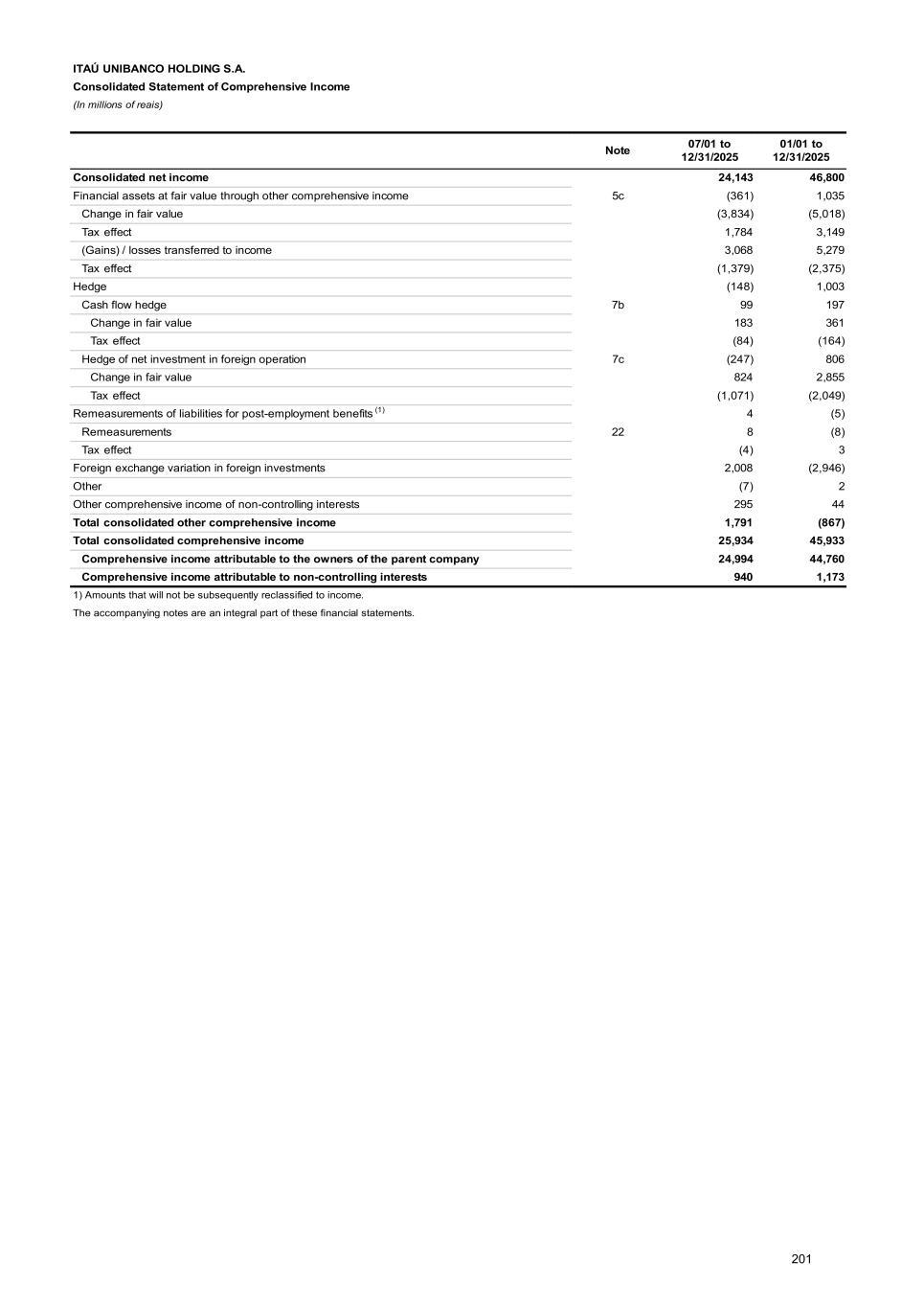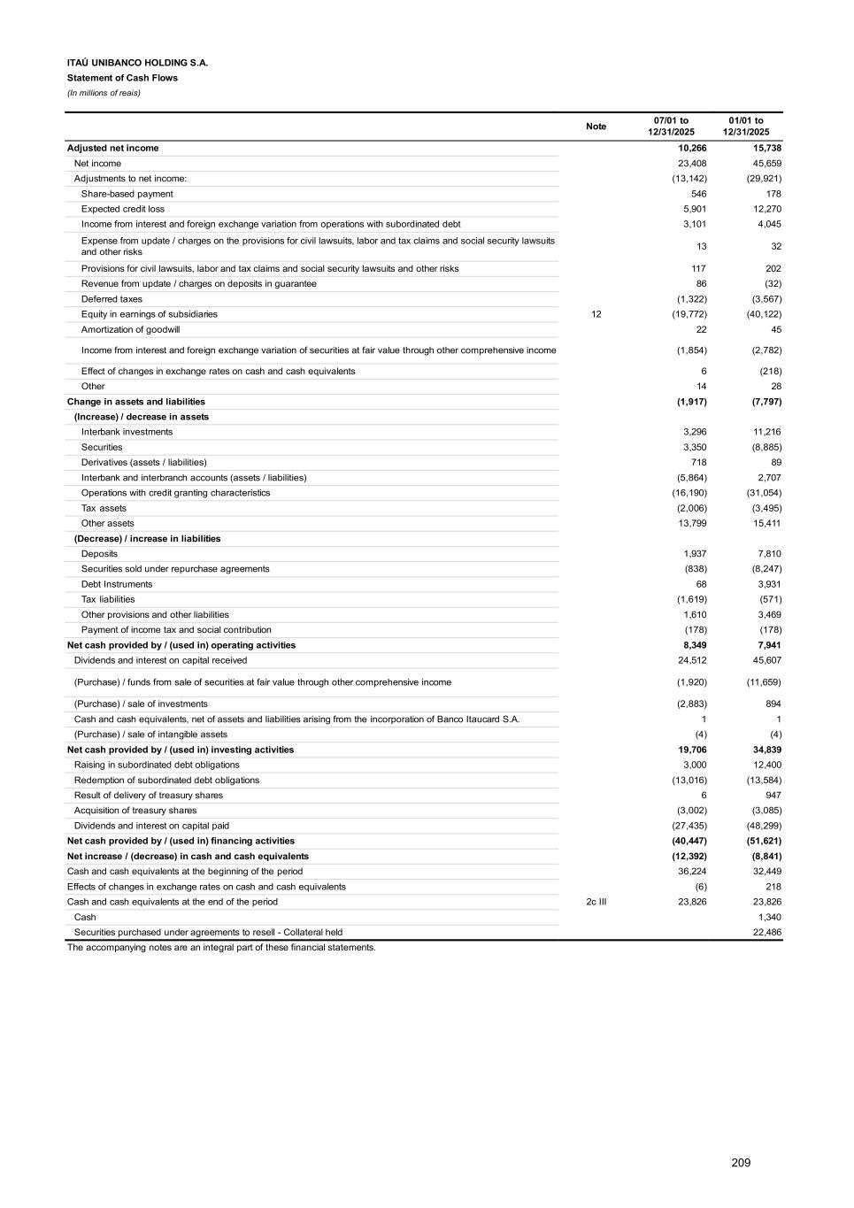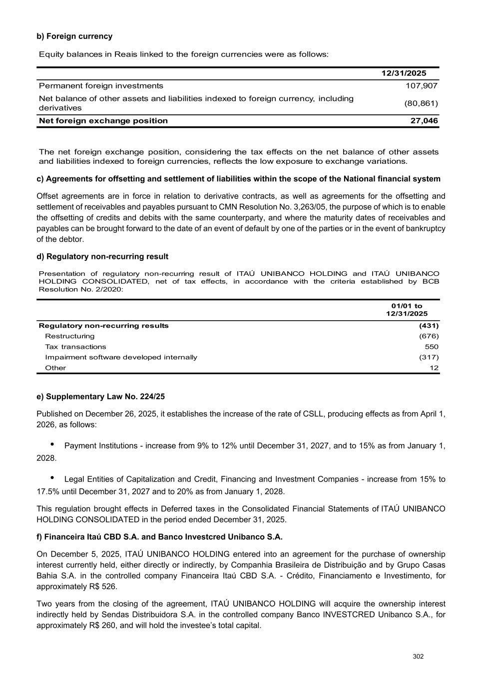 b) Foreign currency Equity balances in Reais linked to the foreign currencies were as follows: 12/31/2025 Permanent foreign investments 107,907 Net balance of other assets and liabilities indexed to foreign currency, including derivatives (80,861) Net foreign exchange position 27,046 The net foreign exchange position, considering the tax effects on the net balance of other assets and liabilities indexed to foreign currencies, reflects the low exposure to exchange variations. c) Agreements for offsetting and settlement of liabilities within the scope of the National financial system Offset agreements are in force in relation to derivative contracts, as well as agreements for the offsetting and settlement of receivables and payables pursuant to CMN Resolution No. 3,263/05, the purpose of which is to enable the offsetting of credits and debits with the same counterparty, and where the maturity dates of receivables and payables can be brought forward to the date of an event of default by one of the parties or in the event of bankruptcy of the debtor. d) Regulatory non-recurring result Presentation of regulatory non-recurring result of ITAÚ UNIBANCO HOLDING and ITAÚ UNIBANCO HOLDING CONSOLIDATED, net of tax effects, in accordance with the criteria established by BCB Resolution No. 2/2020: 01/01 to 12/31/2025 Regulatory non-recurring results (431) Restructuring (676) Tax transactions 550 Impairment software developed internally (317) Other 12 e) Supplementary Law No. 224/25 Published on December 26, 2025, it establishes the increase of the rate of CSLL, producing effects as from April 1, 2026, as follows: • Payment Institutions - increase from 9% to 12% until December 31, 2027, and to 15% as from January 1, 2028. • Legal Entities of Capitalization and Credit, Financing and Investment Companies - increase from 15% to 17.5% until December 31, 2027 and to 20% as from January 1, 2028. This regulation brought effects in Deferred taxes in the Consolidated Financial Statements of ITAÚ UNIBANCO HOLDING CONSOLIDATED in the period ended December 31, 2025. f) Financeira Itaú CBD S.A. and Banco Investcred Unibanco S.A. On December 5, 2025, ITAÚ UNIBANCO HOLDING entered into an agreement for the purchase of ownership interest currently held, either directly or indirectly, by Companhia Brasileira de Distribuição and by Grupo Casas Bahia S.A. in the controlled company Financeira Itaú CBD S.A. - Crédito, Financiamento e Investimento, for approximately R$ 526. Two years from the closing of the agreement, ITAÚ UNIBANCO HOLDING will acquire the ownership interest indirectly held by Sendas Distribuidora S.A. in the controlled company Banco INVESTCRED Unibanco S.A., for approximately R$ 260, and will hold the investee’s total capital. 302