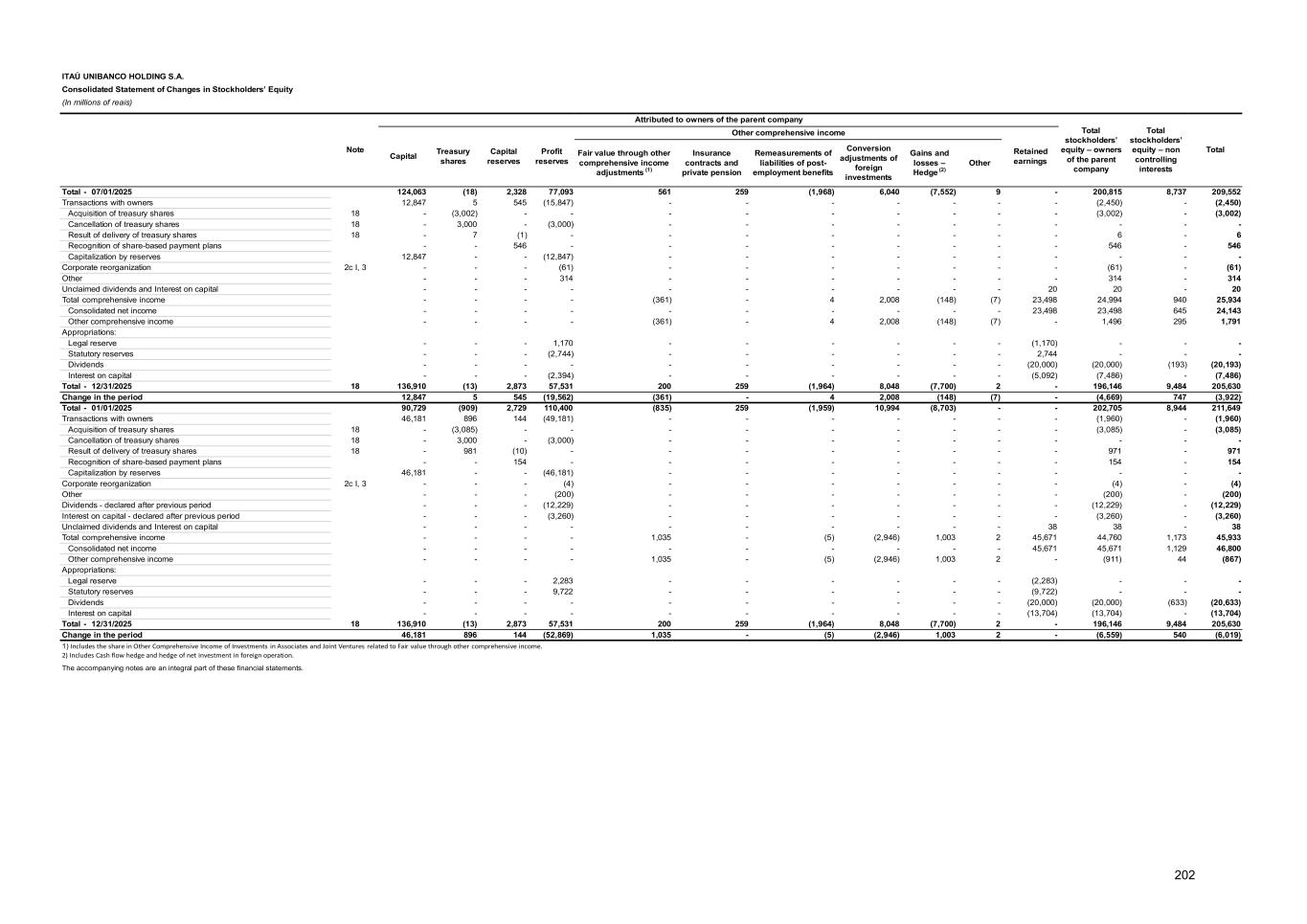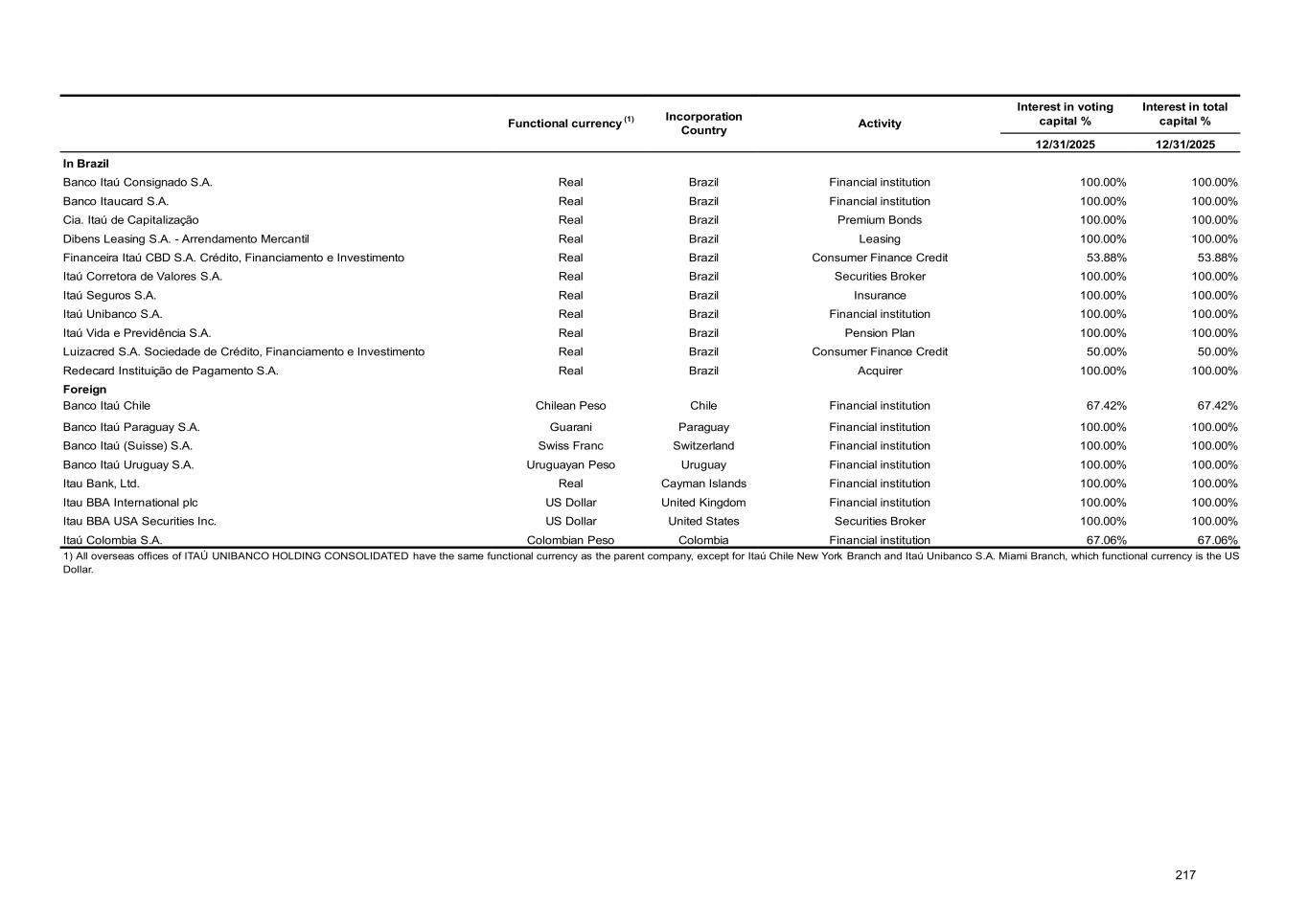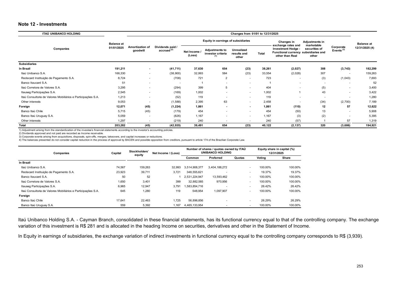 Note 12 - Investments ITAÚ UNIBANCO HOLDING Balance at Changes from 01/01 to 12/31/2025 Balance at Companies Amortization of goodwill Dividends paid / accrued (2) Equity in earnings of subsidiaries Changes in exchange rates and Investment Hedge - Functional currency other than Real Adjustments in marketable securities of subsidiaries and other Corporate Events (3) 01/01/2025 Net Income / (Loss) Adjustments to investor criteria (1) Unrealized results and other Total 12/31/2025 (4) Subsidiaries In Brazil 191,211 - (41,711) 37,630 654 (23) 38,261 (2,027) 308 (3,743) 182,299 Itaú Unibanco S.A. 166,330 - (38,900) 32,993 584 (23) 33,554 (2,028) 307 - 159,263 Redecard Instituição de Pagamento S.A. 8,724 - (708) 721 2 - 723 - (3) (1,043) 7,693 Banco Itaucard S.A. 51 - - 1 - - 1 - - - 52 Itaú Corretora de Valores S.A. 3,295 - (294) 399 5 - 404 - (5) - 3,400 Itauseg Participações S.A. 2,545 - (169) 1,002 - - 1,002 1 43 - 3,422 Itaú Consultoria de Valores Mobiliários e Participações S.A. 1,213 - (52) 119 - - 119 - - - 1,280 Other interests 9,053 - (1,588) 2,395 63 - 2,458 - (34) (2,700) 7,189 Foreign 12,071 (45) (1,224) 1,861 - - 1,861 (110) 12 57 12,622 Banco Itaú Chile 5,715 (45) (179) 454 - - 454 (50) 13 - 5,908 Banco Itaú Uruguay S.A. 5,059 - (826) 1,167 - - 1,167 (3) (2) - 5,395 Other interests 1,297 - (219) 240 - - 240 (57) 1 57 1,319 Total 203,282 (45) (42,935) 39,491 654 (23) 40,122 (2,137) 320 (3,686) 194,921 1) Adjustment arising from the standardization of the investee’s financial statements according to the investor’s accounting policies. 2) Dividends approved and not paid are recorded as Income receivable. 3) Corporate events arising from acquisitions, disposals, spin-offs, merges, takeovers, and capital increases or reductions. 4) The balances presented do not consider capital reduction in the process of approval by BACEN and possible opposition from creditors, pursuant to article 174 of the Brazilian Corporate Law. Companies Capital Stockholders’ equity Net Income / (Loss) Number of shares / quotas owned by ITAÚ UNIBANCO HOLDING Equity share in capital (%) 12/31/2025 Common Preferred Quotas Voting Share In Brazil Itaú Unibanco S.A. 74,567 159,263 32,993 3,514,908,377 3,404,188,272 - 100.00% 100.00% Redecard Instituição de Pagamento S.A. 23,923 39,711 3,721 348,555,621 - - 19.37% 19.37% Banco Itaucard S.A. 50 52 1 2,531,224,947 13,593,462 - 100.00% 100.00% Itaú Corretora de Valores S.A. 1,650 3,401 399 32,882,585 970,956 - 100.00% 100.00% Itauseg Participações S.A. 6,965 12,947 3,791 1,583,854,716 - - 26.42% 26.42% Itaú Consultoria de Valores Mobiliários e Participações S.A. 645 1,280 119 548,954 1,097,907 - 100.00% 100.00% Foreign Banco Itaú Chile 17,641 22,463 1,725 56,896,856 - - 26.29% 26.29% Banco Itaú Uruguay S.A. 559 5,392 1,167 4,465,133,954 - - 100.00% 100.00% Itaú Unibanco Holding S.A. - Cayman Branch, consolidated in these financial statements, has its functional currency equal to that of the controlling company. The exchange variation of this investment is R$ 281 and is allocated in the heading Income on securities, derivatives and other in the Statement of Income. In Equity in earnings of subsidiaries, the exchange variation of indirect investments in functional currency equal to the controlling company corresponds to R$ (3,939). 253