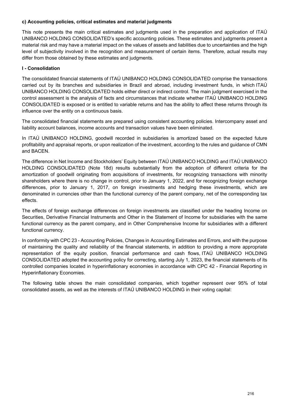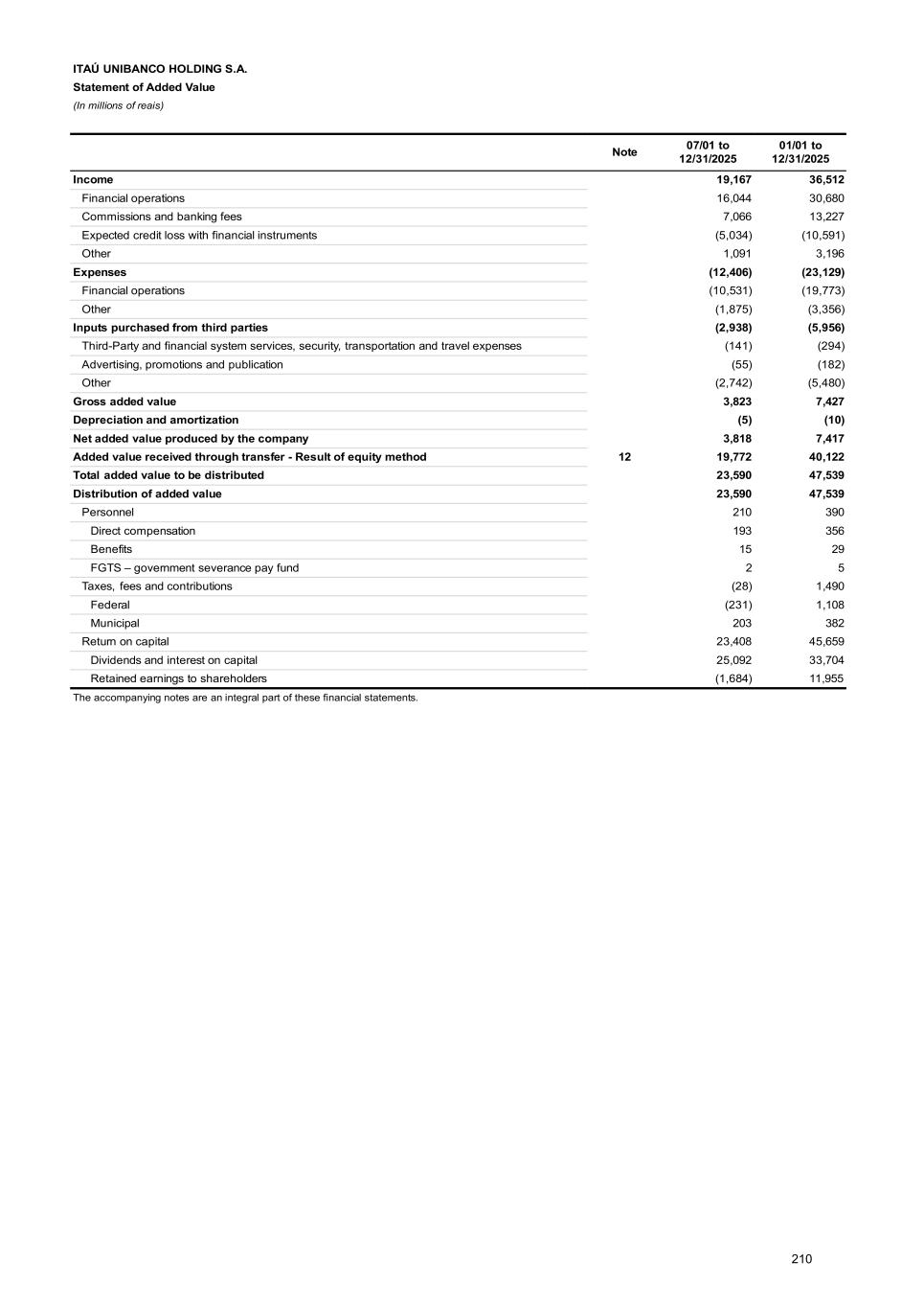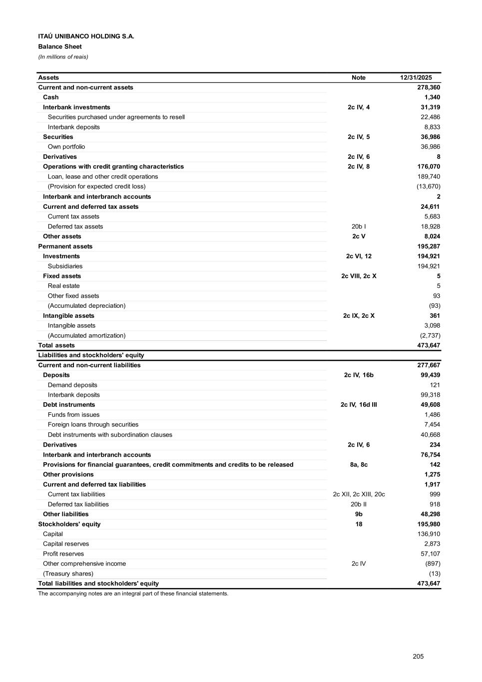 Note 12 - Investments ITAÚ UNIBANCO HOLDING Balance at Changes from 01/01 to 12/31/2025 Balance at Companies Amortization of goodwill Dividends paid / accrued (2) Equity in earnings of subsidiaries Changes in exchange rates and Investment Hedge - Functional currency other than Real Adjustments in marketable securities of subsidiaries and other Corporate Events (3) 01/01/2025 Net Income / (Loss) Adjustments to investor criteria (1) Unrealized results and other Total 12/31/2025 (4) Subsidiaries In Brazil 191,211 - (41,711) 37,630 654 (23) 38,261 (2,027) 308 (3,743) 182,299 Itaú Unibanco S.A. 166,330 - (38,900) 32,993 584 (23) 33,554 (2,028) 307 - 159,263 Redecard Instituição de Pagamento S.A. 8,724 - (708) 721 2 - 723 - (3) (1,043) 7,693 Banco Itaucard S.A. 51 - - 1 - - 1 - - - 52 Itaú Corretora de Valores S.A. 3,295 - (294) 399 5 - 404 - (5) - 3,400 Itauseg Participações S.A. 2,545 - (169) 1,002 - - 1,002 1 43 - 3,422 Itaú Consultoria de Valores Mobiliários e Participações S.A. 1,213 - (52) 119 - - 119 - - - 1,280 Other interests 9,053 - (1,588) 2,395 63 - 2,458 - (34) (2,700) 7,189 Foreign 12,071 (45) (1,224) 1,861 - - 1,861 (110) 12 57 12,622 Banco Itaú Chile 5,715 (45) (179) 454 - - 454 (50) 13 - 5,908 Banco Itaú Uruguay S.A. 5,059 - (826) 1,167 - - 1,167 (3) (2) - 5,395 Other interests 1,297 - (219) 240 - - 240 (57) 1 57 1,319 Total 203,282 (45) (42,935) 39,491 654 (23) 40,122 (2,137) 320 (3,686) 194,921 1) Adjustment arising from the standardization of the investee’s financial statements according to the investor’s accounting policies. 2) Dividends approved and not paid are recorded as Income receivable. 3) Corporate events arising from acquisitions, disposals, spin-offs, merges, takeovers, and capital increases or reductions. 4) The balances presented do not consider capital reduction in the process of approval by BACEN and possible opposition from creditors, pursuant to article 174 of the Brazilian Corporate Law. Companies Capital Stockholders’ equity Net Income / (Loss) Number of shares / quotas owned by ITAÚ UNIBANCO HOLDING Equity share in capital (%) 12/31/2025 Common Preferred Quotas Voting Share In Brazil Itaú Unibanco S.A. 74,567 159,263 32,993 3,514,908,377 3,404,188,272 - 100.00% 100.00% Redecard Instituição de Pagamento S.A. 23,923 39,711 3,721 348,555,621 - - 19.37% 19.37% Banco Itaucard S.A. 50 52 1 2,531,224,947 13,593,462 - 100.00% 100.00% Itaú Corretora de Valores S.A. 1,650 3,401 399 32,882,585 970,956 - 100.00% 100.00% Itauseg Participações S.A. 6,965 12,947 3,791 1,583,854,716 - - 26.42% 26.42% Itaú Consultoria de Valores Mobiliários e Participações S.A. 645 1,280 119 548,954 1,097,907 - 100.00% 100.00% Foreign Banco Itaú Chile 17,641 22,463 1,725 56,896,856 - - 26.29% 26.29% Banco Itaú Uruguay S.A. 559 5,392 1,167 4,465,133,954 - - 100.00% 100.00% Itaú Unibanco Holding S.A. - Cayman Branch, consolidated in these financial statements, has its functional currency equal to that of the controlling company. The exchange variation of this investment is R$ 281 and is allocated in the heading Income on securities, derivatives and other in the Statement of Income. In Equity in earnings of subsidiaries, the exchange variation of indirect investments in functional currency equal to the controlling company corresponds to R$ (3,939). 253
