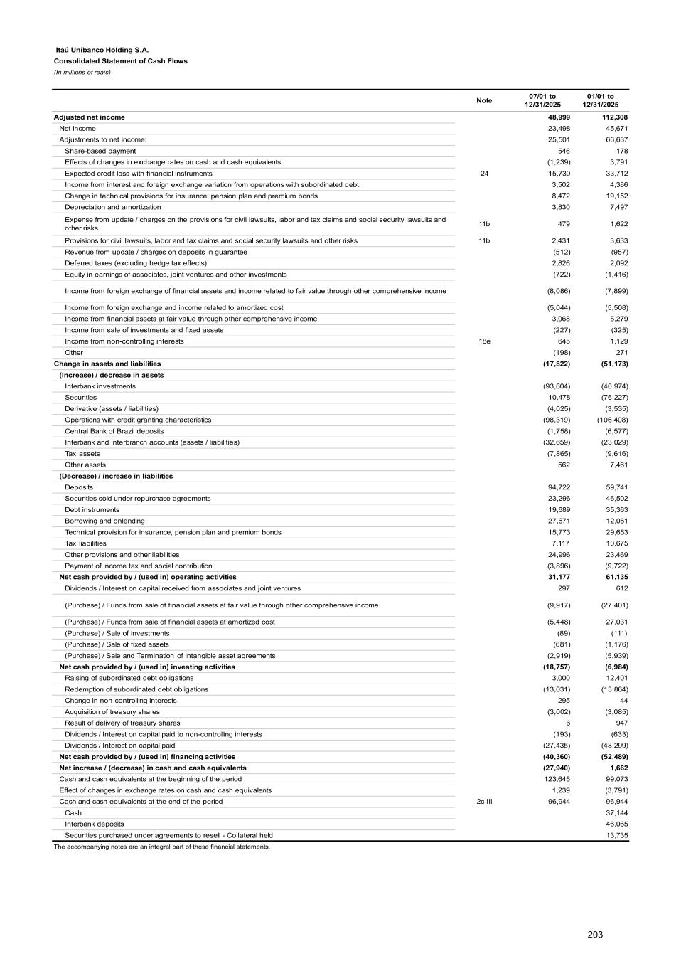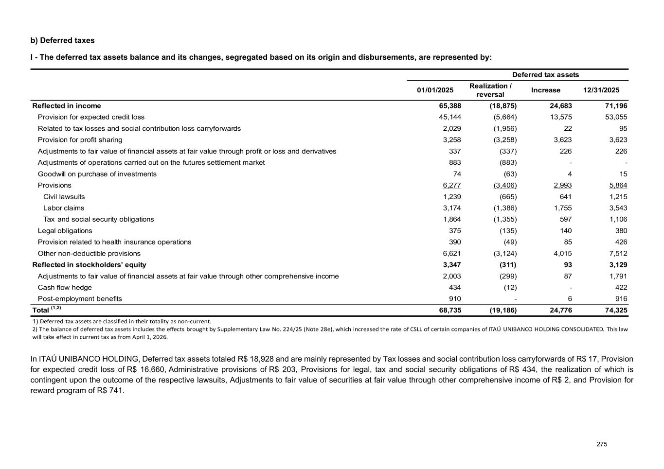 b) Deferred taxes I - The deferred tax assets balance and its changes, segregated based on its origin and disbursements, are represented by: 01/01/2025 Deferred tax assets 01/01/2025 01/01/2025 Realization / reversal Increase 12/31/2025 Reflected in income 65,388 (18,875) 24,683 71,196 Provision for expected credit loss 45,144 (5,664) 13,575 53,055 Related to tax losses and social contribution loss carryforwards 2,029 (1,956) 22 95 Provision for profit sharing 3,258 (3,258) 3,623 3,623 Adjustments to fair value of financial assets at fair value through profit or loss and derivatives 337 (337) 226 226 Adjustments of operations carried out on the futures settlement market 883 (883) - - Goodwill on purchase of investments 74 (63) 4 15 Provisions 6,277 (3,406) 2,993 5,864 Civil lawsuits 1,239 (665) 641 1,215 Labor claims 3,174 (1,386) 1,755 3,543 Tax and social security obligations 1,864 (1,355) 597 1,106 Legal obligations 375 (135) 140 380 Provision related to health insurance operations 390 (49) 85 426 Other non-deductible provisions 6,621 (3,124) 4,015 7,512 Reflected in stockholders’ equity 3,347 (311) 93 3,129 Adjustments to fair value of financial assets at fair value through other comprehensive income 2,003 (299) 87 1,791 Cash flow hedge 434 (12) - 422 Post-employment benefits 910 - 6 916 Total (1,2) 68,735 (19,186) 24,776 74,325 1) Deferred tax assets are classified in their totality as non-current. 2) The balance of deferred tax assets includes the effects brought by Supplementary Law No. 224/25 (Note 28e), which increased the rate of CSLL of certain companies of ITAÚ UNIBANCO HOLDING CONSOLIDATED. This law will take effect in current tax as from April 1, 2026. In ITAÚ UNIBANCO HOLDING, Deferred tax assets totaled R$ 18,928 and are mainly represented by Tax losses and social contribution loss carryforwards of R$ 17, Provision for expected credit loss of R$ 16,660, Administrative provisions of R$ 203, Provisions for legal, tax and social security obligations of R$ 434, the realization of which is contingent upon the outcome of the respective lawsuits, Adjustments to fair value of securities at fair value through other comprehensive income of R$ 2, and Provision for reward program of R$ 741. 275