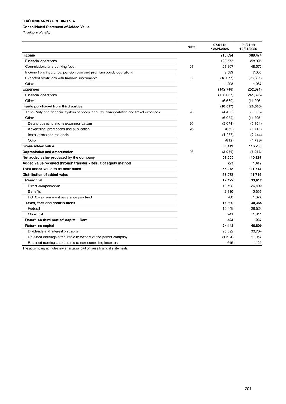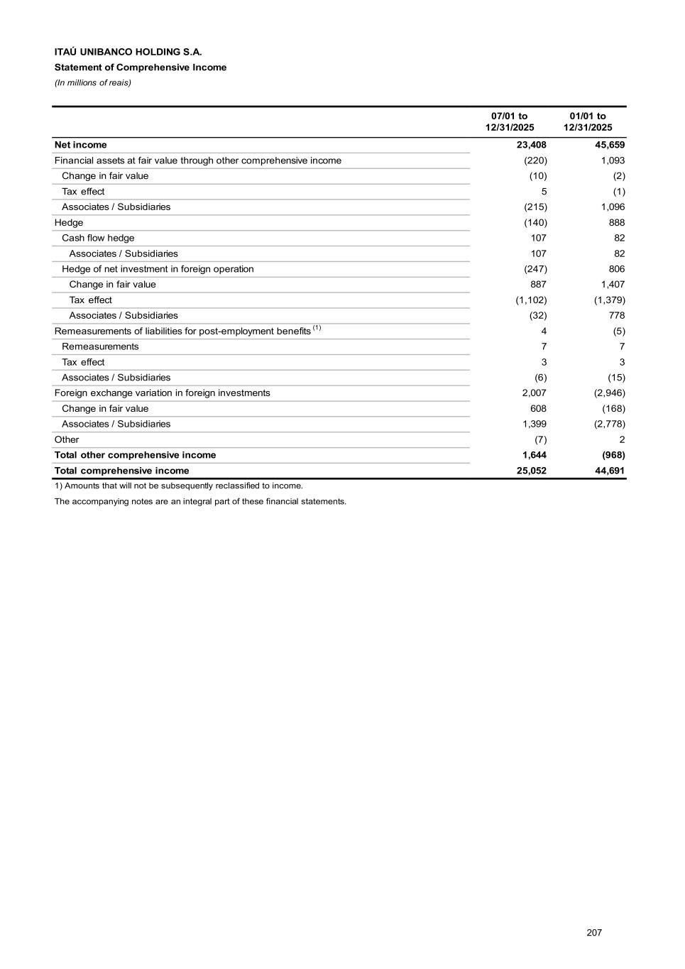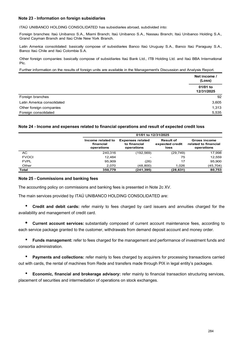 Note 23 - Information on foreign subsidiaries ITAÚ UNIBANCO HOLDING CONSOLIDATED has subsidiaries abroad, subdivided into: Foreign branches: Itaú Unibanco S.A., Miami Branch; Itaú Unibanco S.A., Nassau Branch; Itaú Unibanco Holding S.A., Grand Cayman Branch and Itaú Chile New York Branch. Latin America consolidated: basically compose of subsidiaries Banco Itaú Uruguay S.A., Banco Itaú Paraguay S.A., Banco Itaú Chile and Itaú Colombia S.A. Other foreign companies: basically compose of subsidiaries Itaú Bank Ltd., ITB Holding Ltd. and Itaú BBA International Plc. Further information on the results of foreign units are available in the Management’s Discussion and Analysis Report. Net income / (Loss) 01/01 to 12/31/2025 Foreign branches 92 Latin America consolidated 3,605 Other foreign companies 1,313 Foreign consolidated 5,535 Note 24 - Income and expenses related to financial operations and result of expected credit loss 01/01 to 12/31/2025 Income related to financial operations Expenses related to financial operations Result of expected credit loss Gross income related to financial operations AC 240,316 (192,569) (29,749) 17,998 FVOCI 12,484 - 75 12,559 FVPL 95,909 (26) 17 95,900 Other 2,070 (48,800) 1,026 (45,704) Total 350,779 (241,395) (28,631) 80,753 Note 25 - Commissions and banking fees The accounting policy on commissions and banking fees is presented in Note 2c XV. The main services provided by ITAÚ UNIBANCO HOLDING CONSOLIDATED are: • Credit and debit cards: refer mainly to fees charged by card issuers and annuities charged for the availability and management of credit card. • Current account services: substantially composed of current account maintenance fees, according to each service package granted to the customer, withdrawals from demand deposit account and money order. • Funds management: refer to fees charged for the management and performance of investment funds and consortia administration. • Payments and collections: refer mainly to fees charged by acquirers for processing transactions carried out with cards, the rental of machines from Rede and transfers made through PIX in legal entity’s packages. • Economic, financial and brokerage advisory: refer mainly to financial transaction structuring services, placement of securities and intermediation of operations on stock exchanges. 284